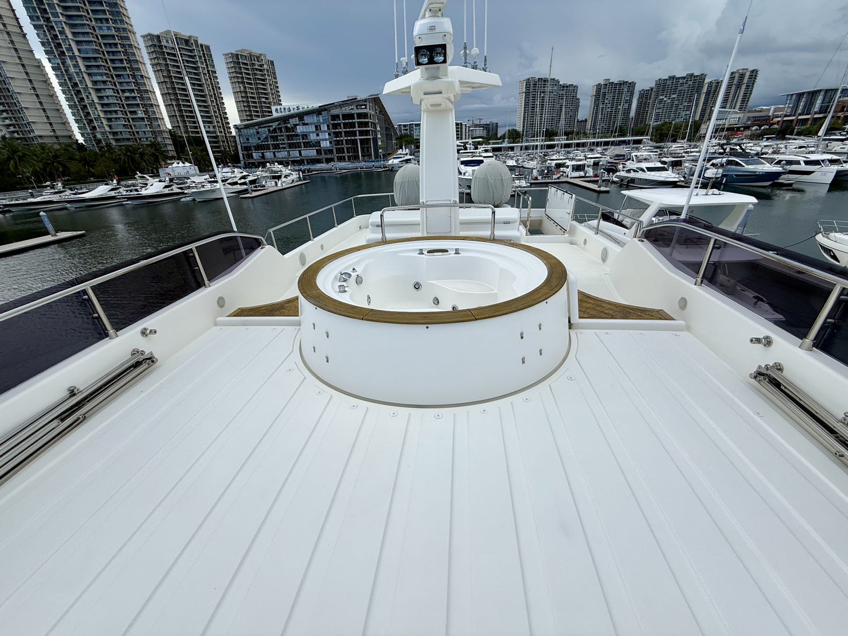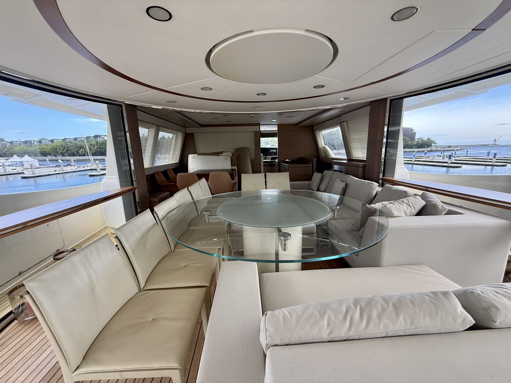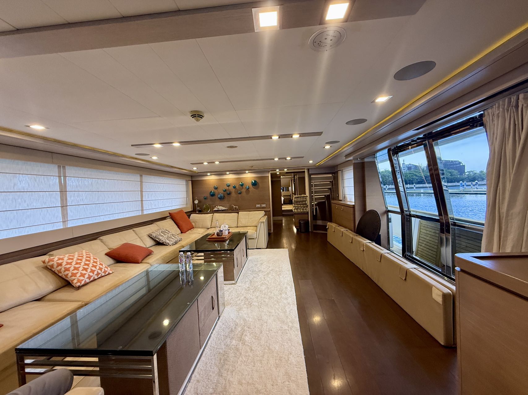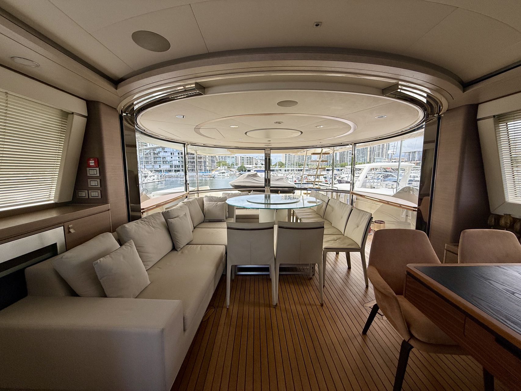 Outdoor amenities include an inviting sundeck equipped with Jacuzzi and bar alongside sun loungers perfect for relaxation or socializing; meanwhile, al fresco dining opportunities abound on the upper deck aft lounge area. Further seating options are tastefully integrated throughout—from bow lounging spots to sunpads that enhance outdoor enjoyment—and culminate at an impressive transom swim platform offering seamless water access.