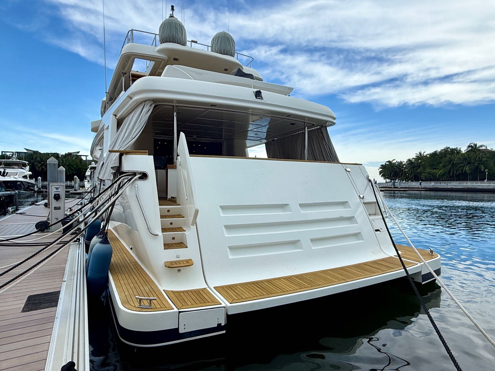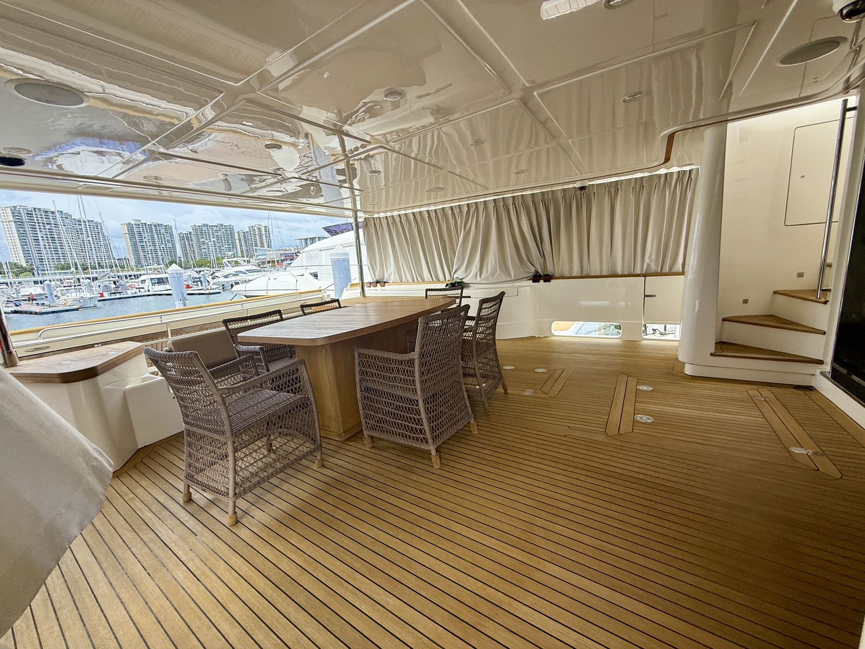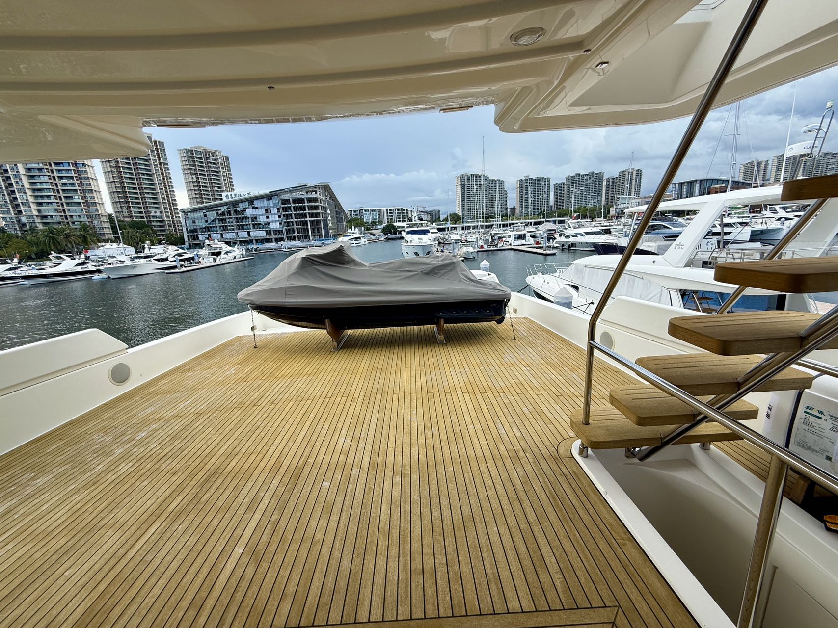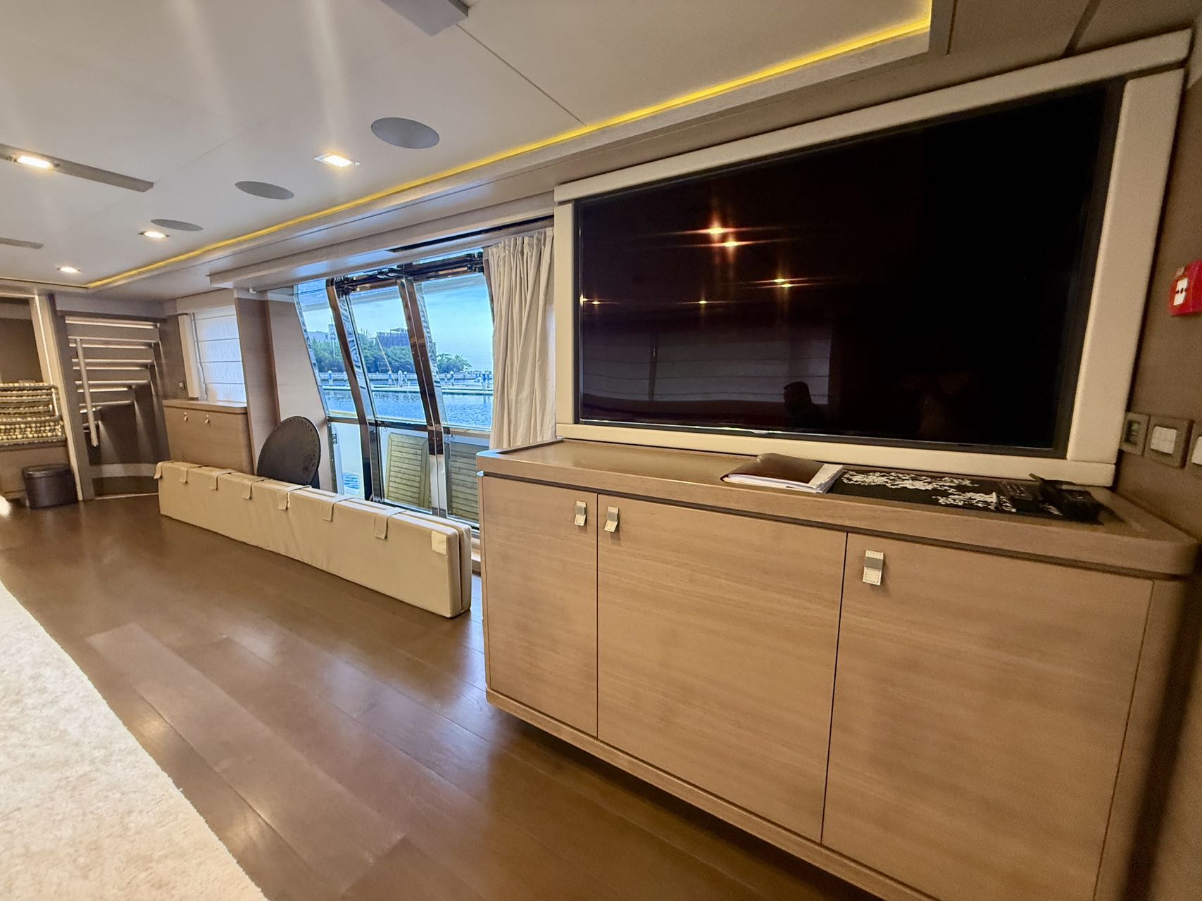 Outdoor amenities include an inviting sundeck equipped with Jacuzzi and bar alongside sun loungers perfect for relaxation or socializing; meanwhile, al fresco dining opportunities abound on the upper deck aft lounge area. Further seating options are tastefully integrated throughout—from bow lounging spots to sunpads that enhance outdoor enjoyment—and culminate at an impressive transom swim platform offering seamless water access.
