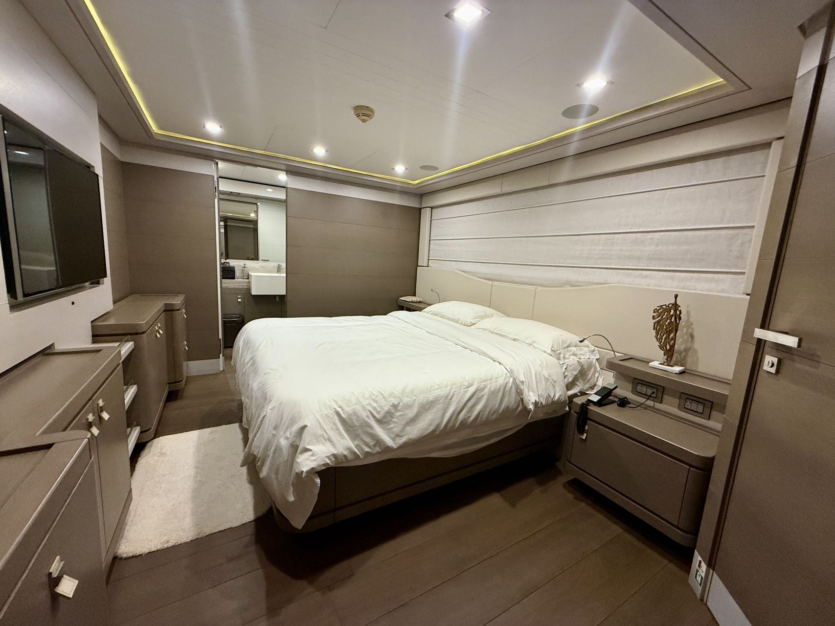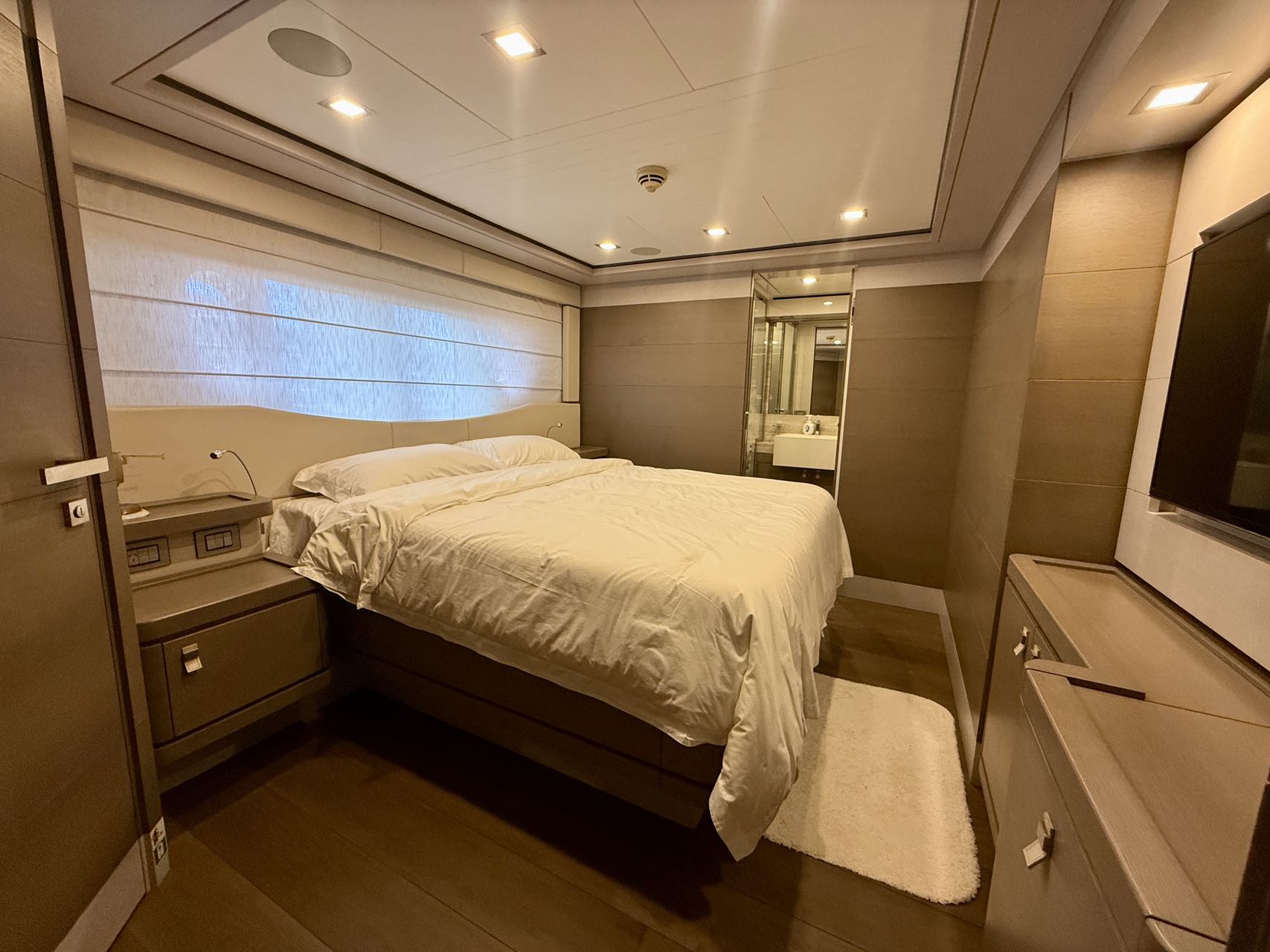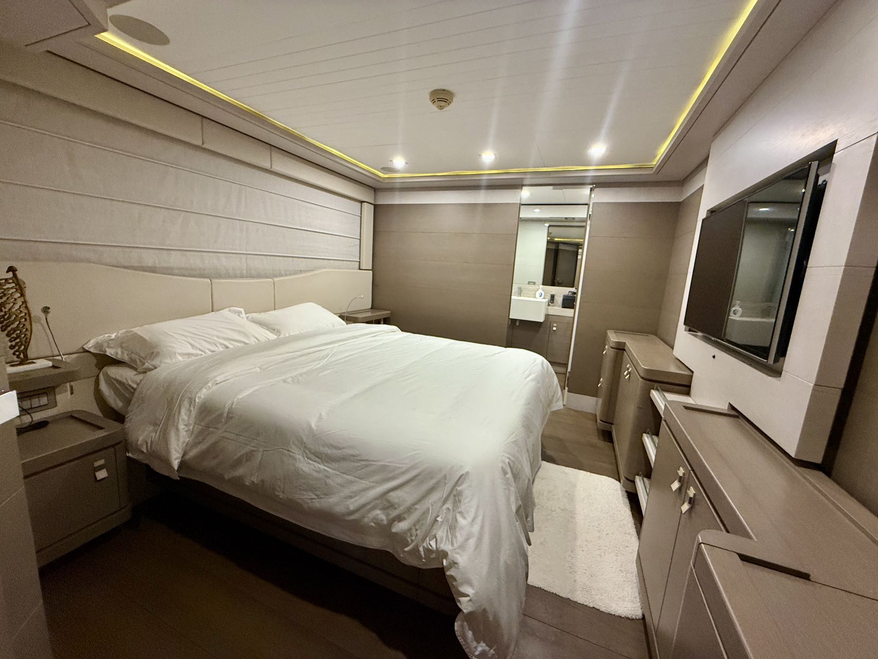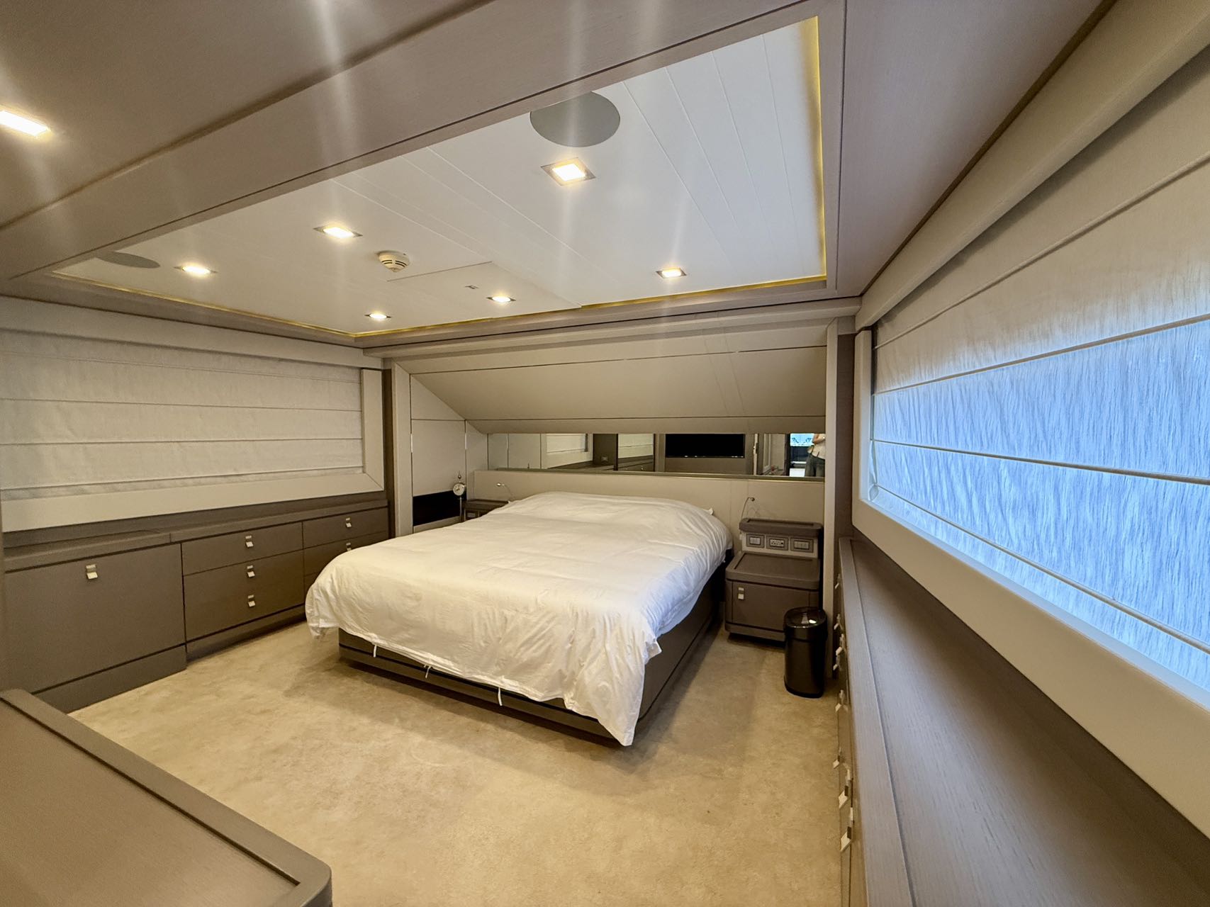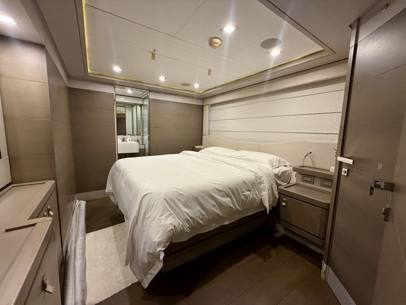 Accommodating ten guests across five luxurious cabins—highlighted by a main-deck master suite—the yacht ensures everyone aboard enjoys supreme comfort. Additional space is reserved for six crew members within four dedicated cabins. The interior showcases exceptional Italian design with expansive living areas featuring floor-to-ceiling windows and an elegant fold-out balcony in the main saloon.
