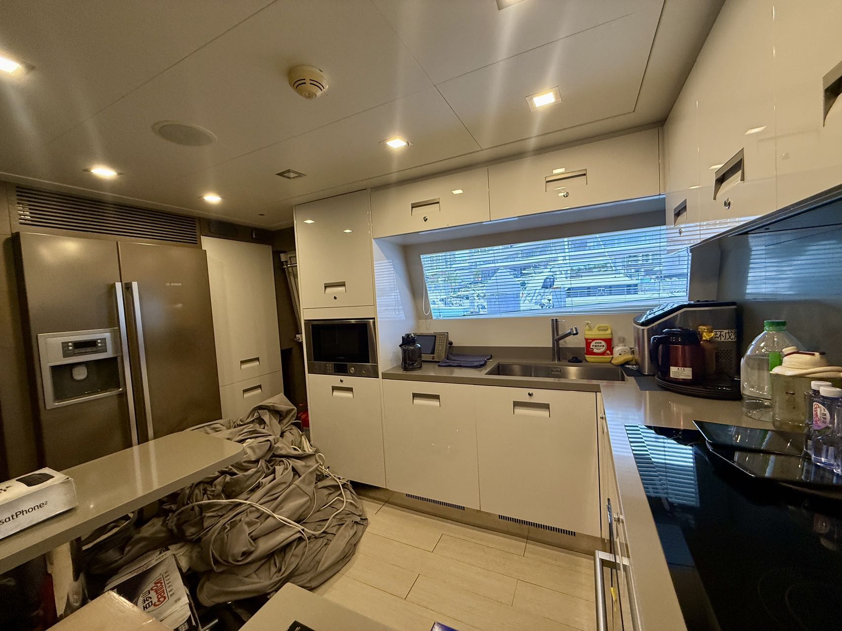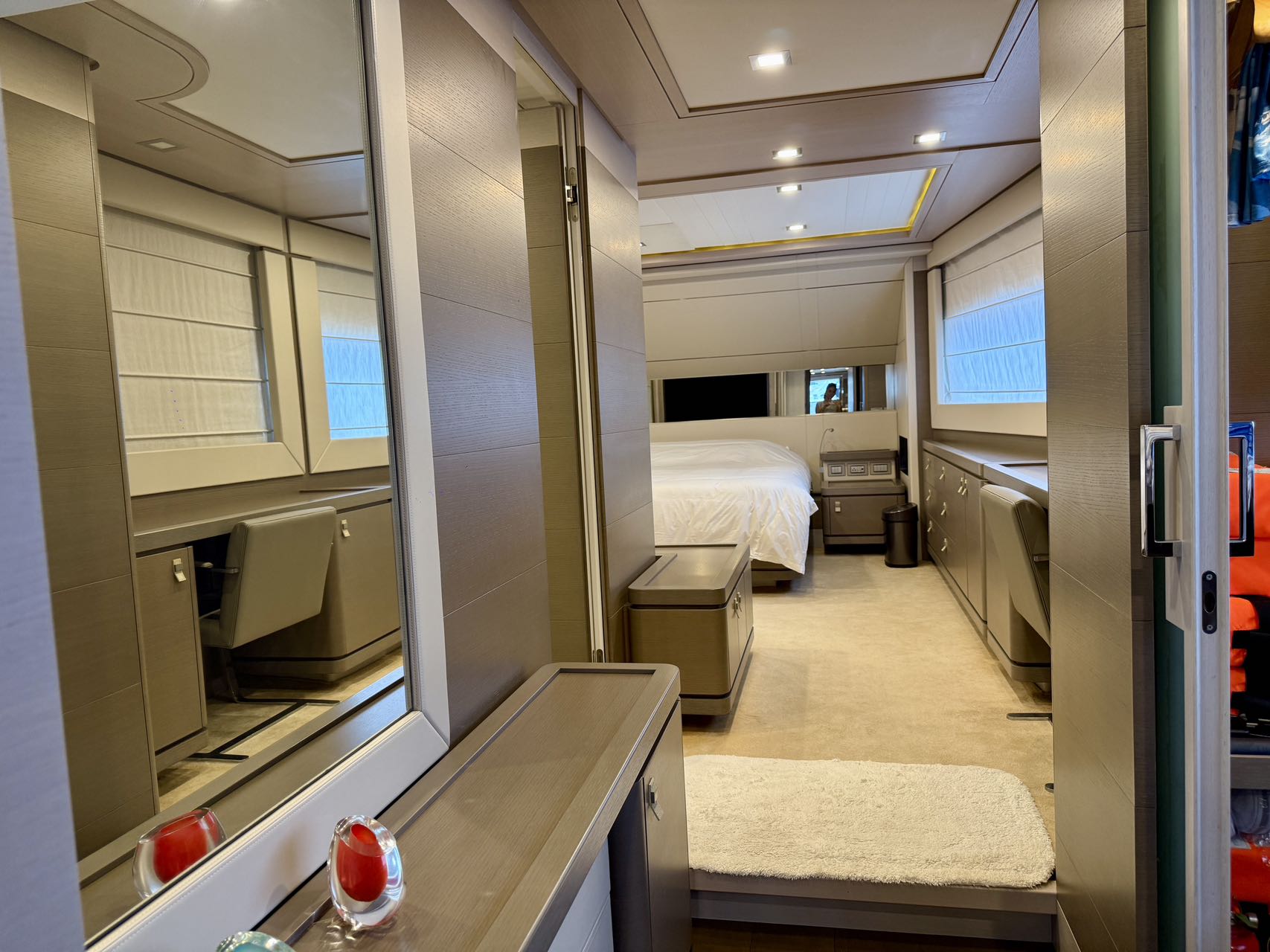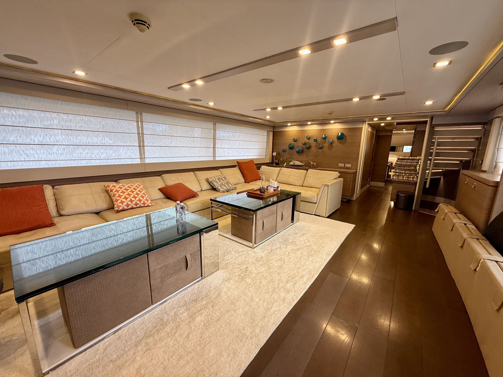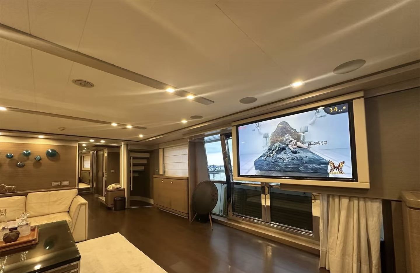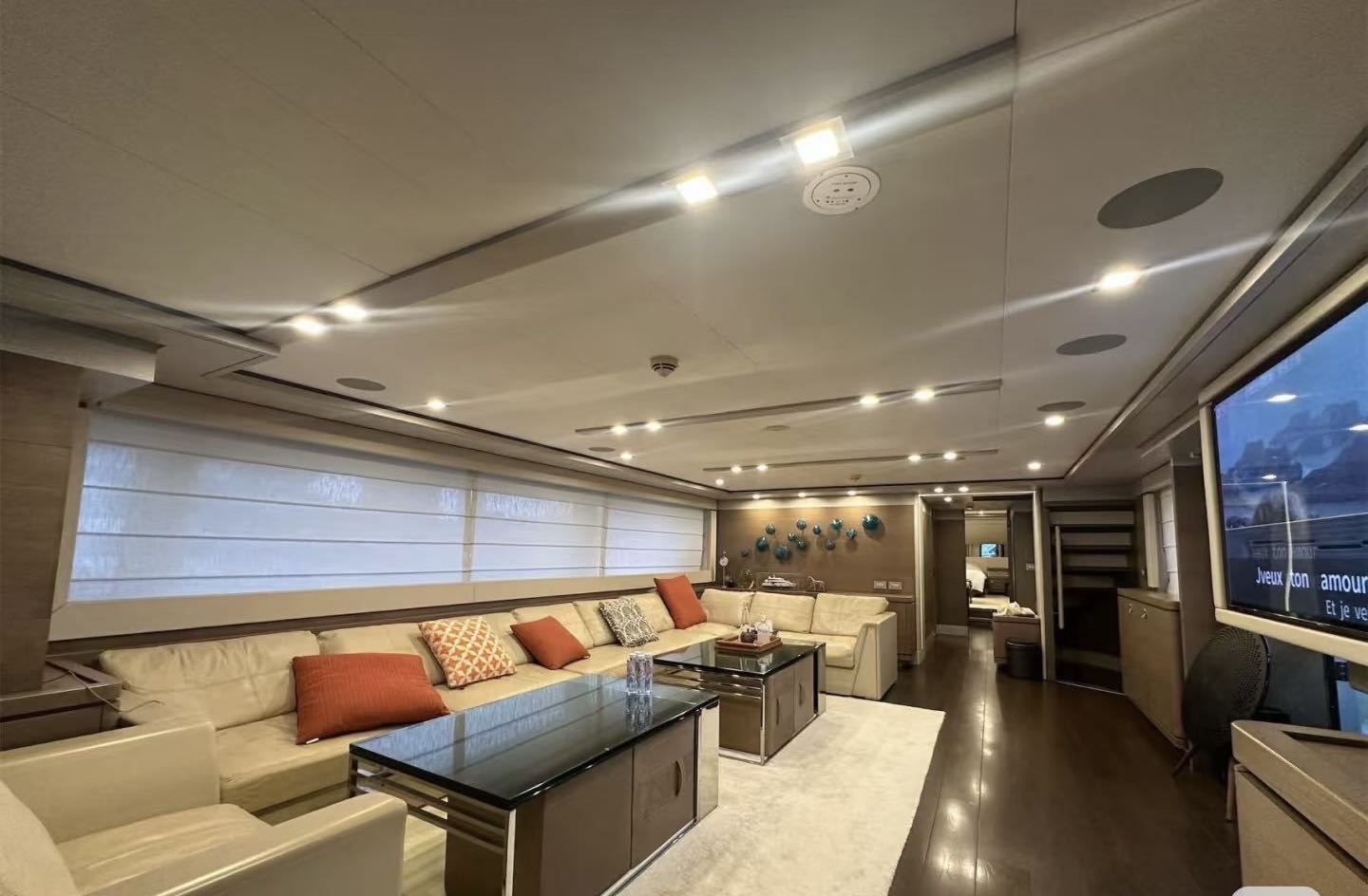 Accommodating ten guests across five luxurious cabins—highlighted by a main-deck master suite—the yacht ensures everyone aboard enjoys supreme comfort. Additional space is reserved for six crew members within four dedicated cabins. The interior showcases exceptional Italian design with expansive living areas featuring floor-to-ceiling windows and an elegant fold-out balcony in the main saloon.