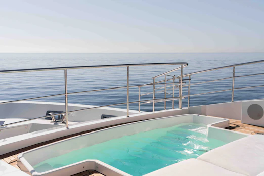 EXINITY’s sharp, sleek lines provide a classic Benetti aesthetic. The forward custom Jacuzzi/pool on the bow invites guests to relax with unobstructed views. The sundeck is entertainment-ready, featuring a bar, lounging options, and an openable sunroof for alfresco enjoyment. The well-appointed beach club includes a large bathing platform and separate day head, ensuring a complete guest experience.