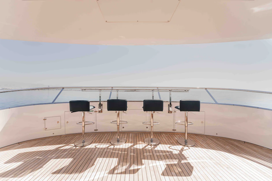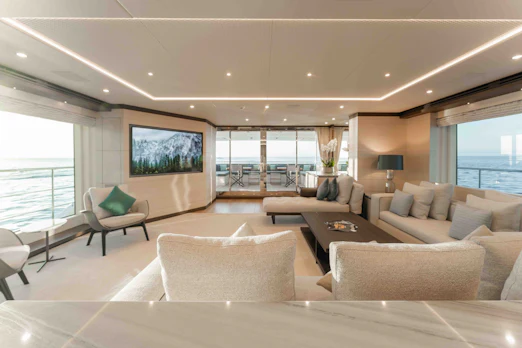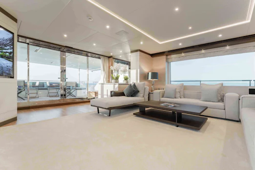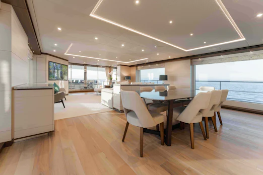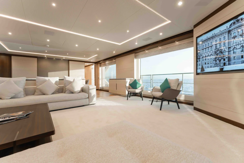 The main salon floods with natural light, enhanced by floor-to-ceiling windows and RWD-designed interiors boasting dark and light wood finishes. A marble dining table seats up to 10 guests. The skylounge offers a bar, card table, and seating area around a large TV, perfect for unwinding.