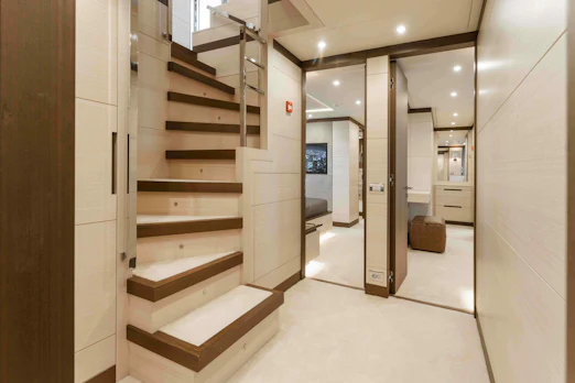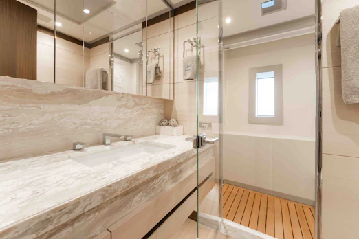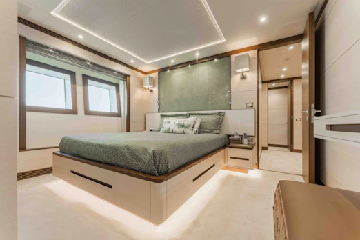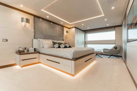 EXINITY welcomes up to 11 guests across five exquisite staterooms. The master suite on the main deck is spacious, featuring floor-to-ceiling windows, a walk-in closet, and a his-and-hers en-suite bathroom. Four additional staterooms include two with queen-size beds and two with twin-size beds, all offering en-suite bathrooms. Crew accommodations include three cabins and a captain’s cabin, comfortably housing seven crew members.