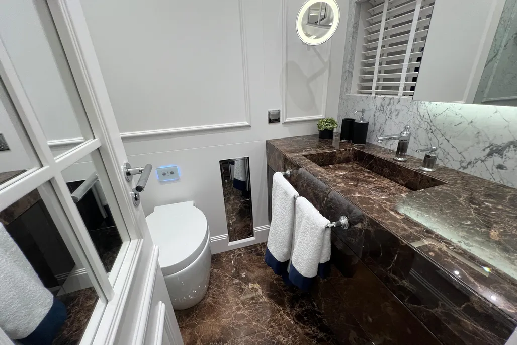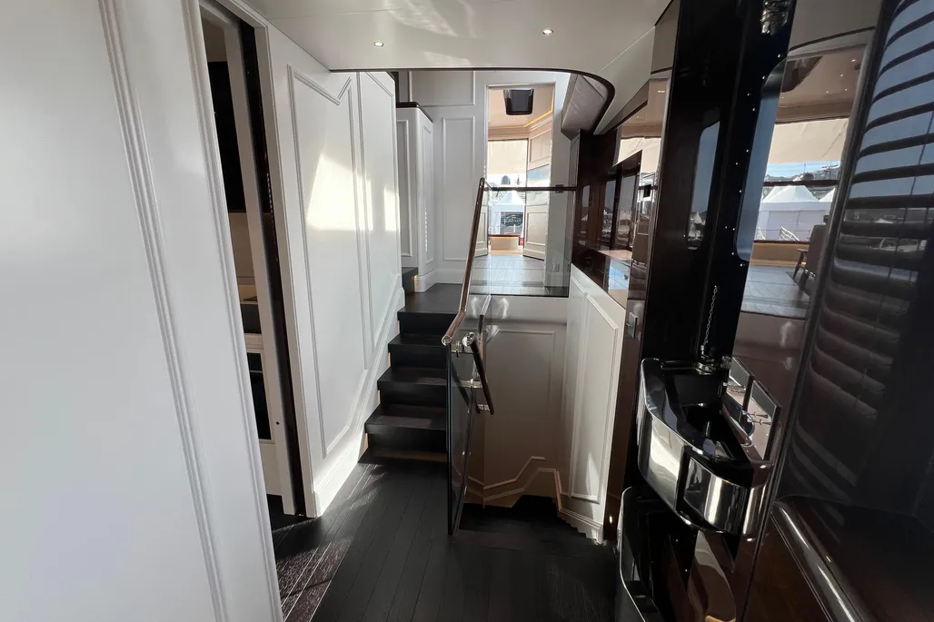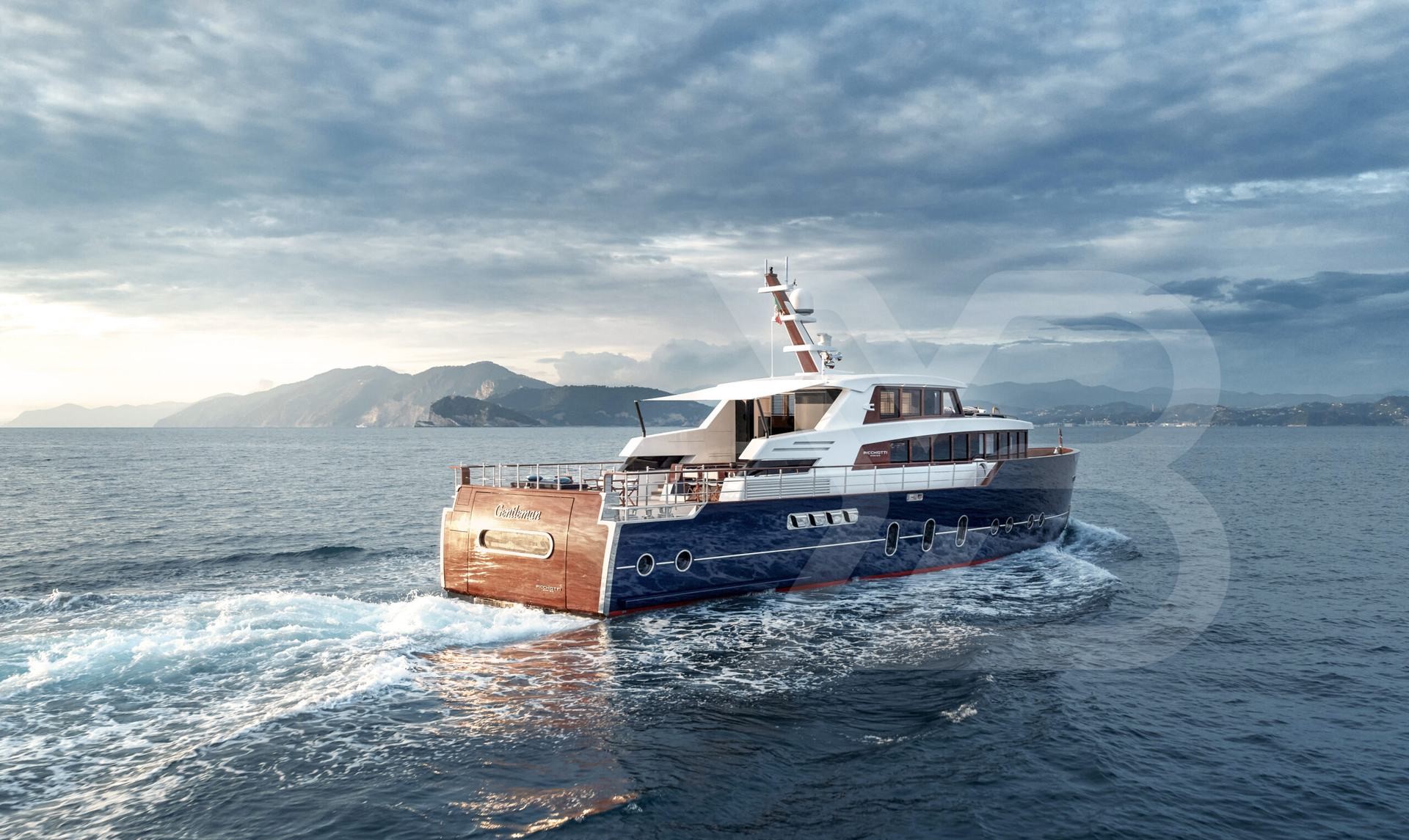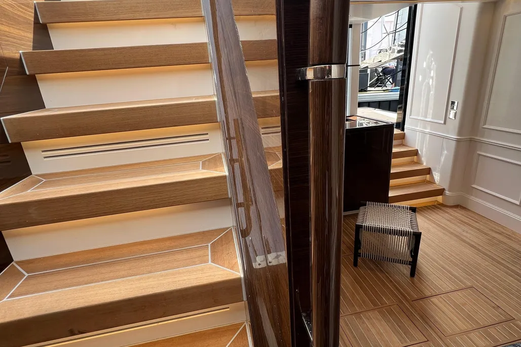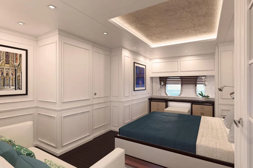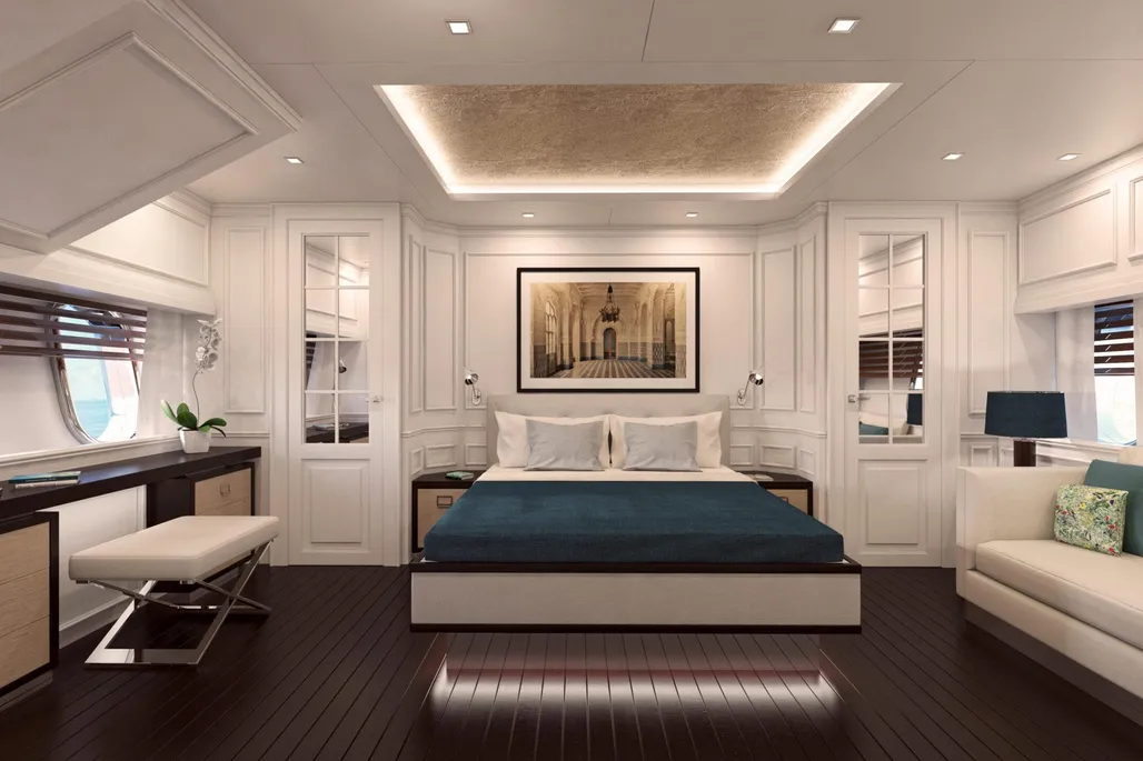 Powered by twin diesel MAN engines with 1,300hp each, the yacht achieves a top speed of 18 knots and cruises comfortably at 16 knots. Her semi-displacement hull delivers an ideal balance of spaciousness and speed.