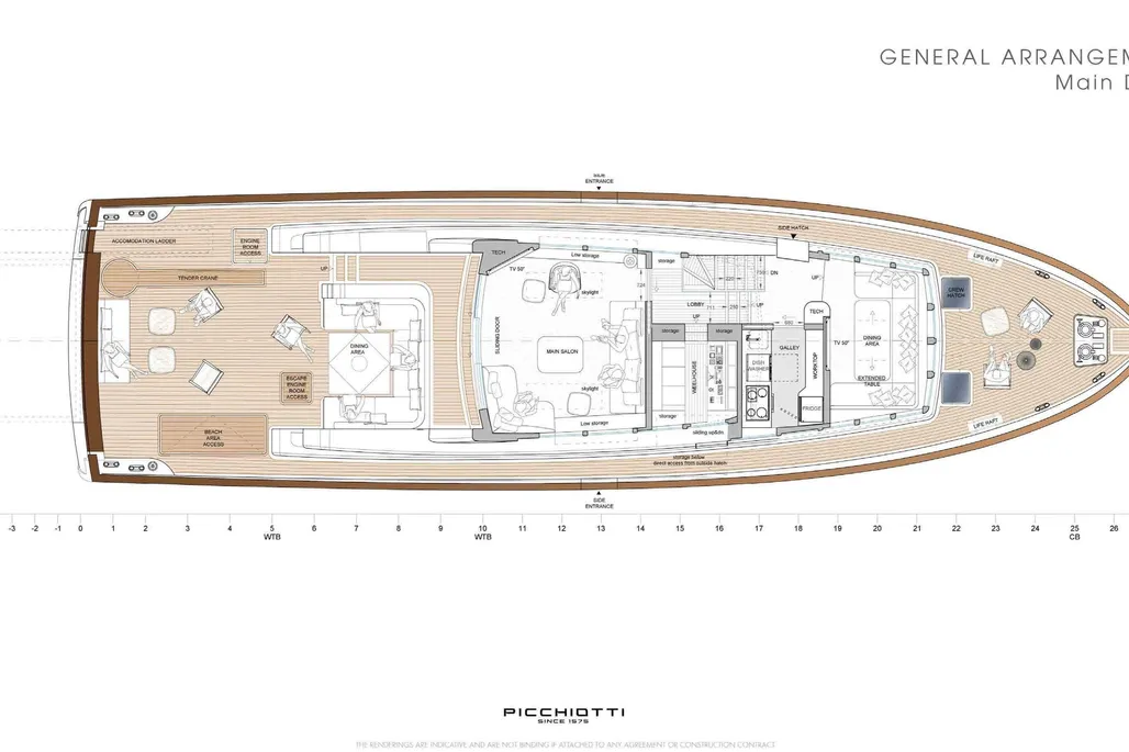 In 1982, Picchiotti made waves with the creation of the 103-meter Al Said, one of the largest ships of its time, crafted in Marina di Carrara. Today, The Italian Sea Group, under Giovanni Costantino’s visionary leadership, breathes new life into Picchiotti’s illustrious legacy, aiming to blend stylistic elegance with historical values.