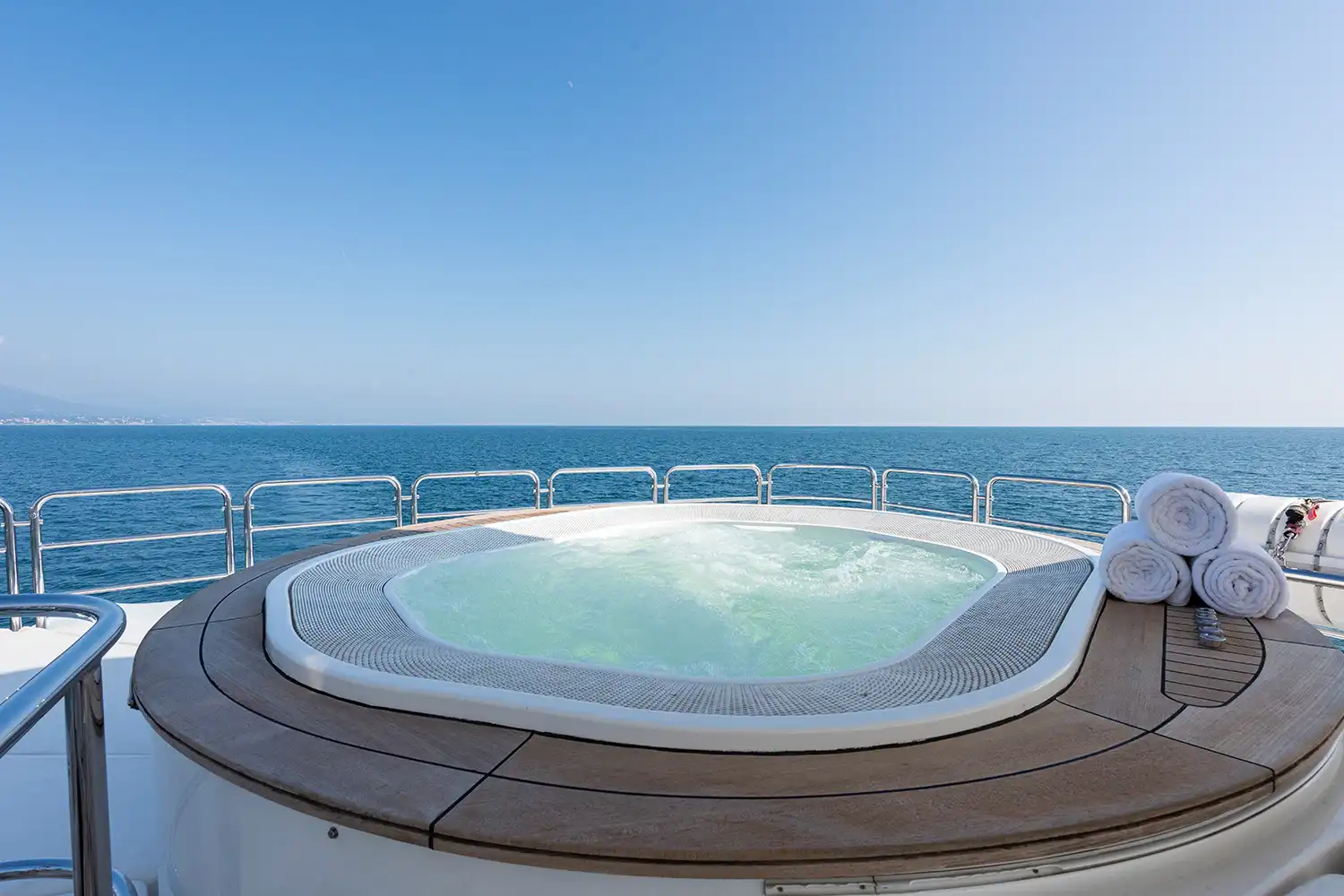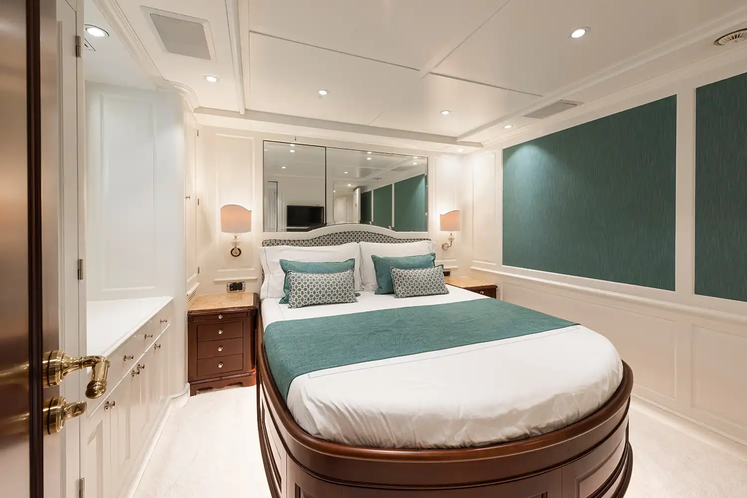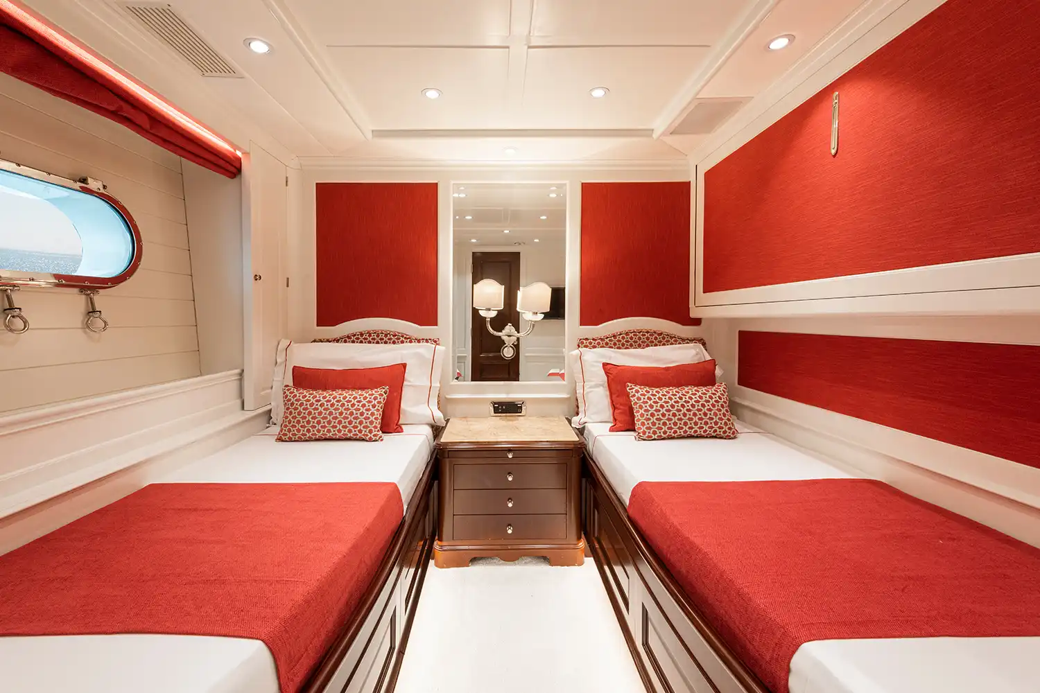 Giorgia I accommodates up to 12 guests across five stylish cabins. The master suite sits forward on the main deck, complete with a walk-through office and a luxurious en suite with both bath and shower. Two doubles and two twin cabins, each with Pullman berths, are found on the lower deck, echoing the main deck’s refined décor and featuring marble en suites.