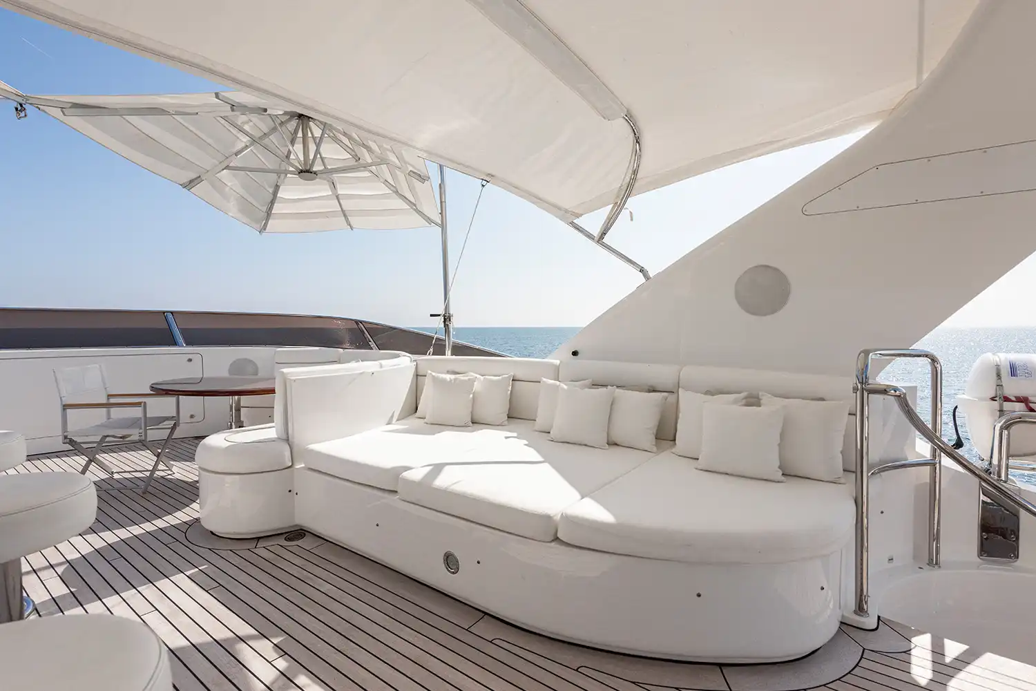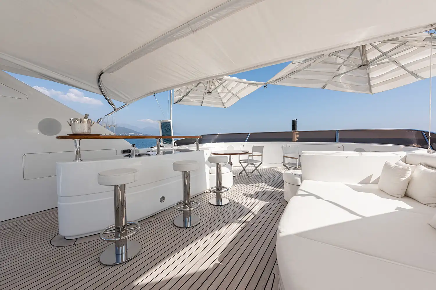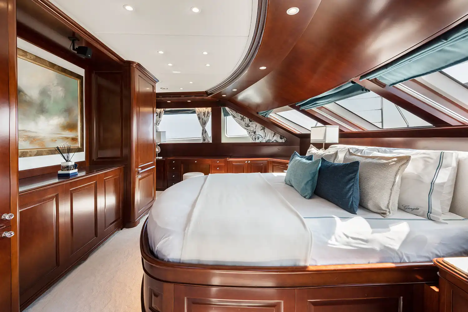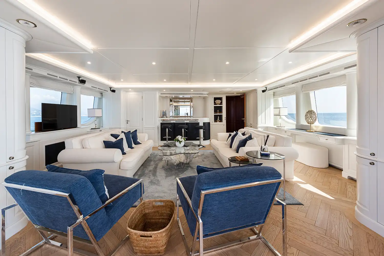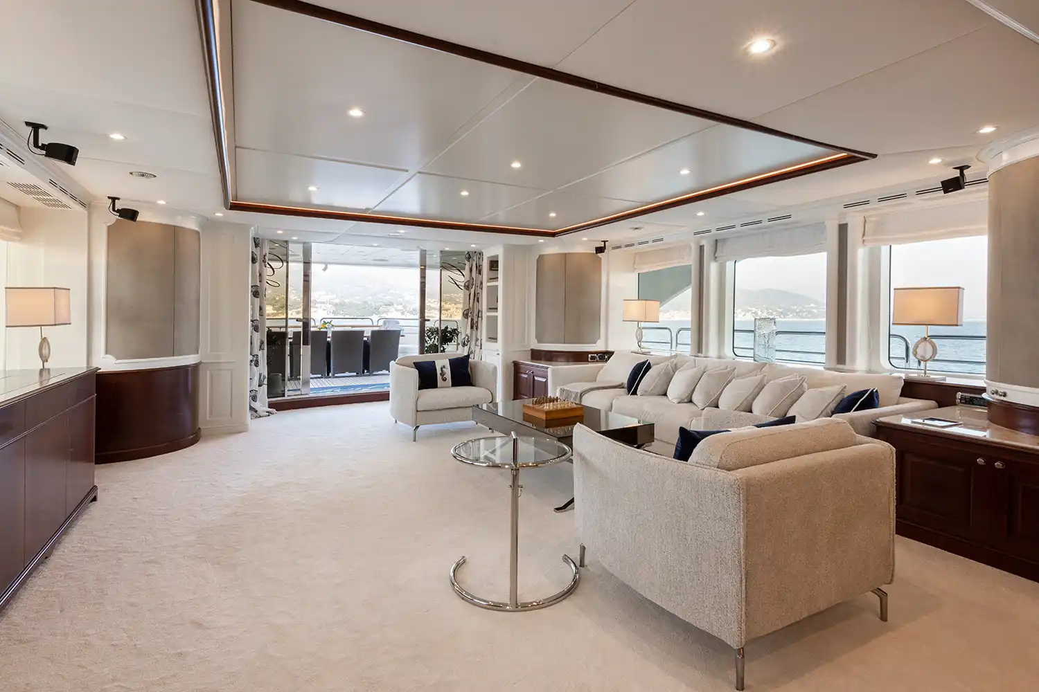 Her interiors are both elegant and inviting, featuring a soothing cream palette, rich dark wood accents, and subtle navy details. The main saloon is designed for comfort and versatility, with plush carpets, modern low-profile furnishings, a formal dining space for 10, and a spacious lounge with ample seating.