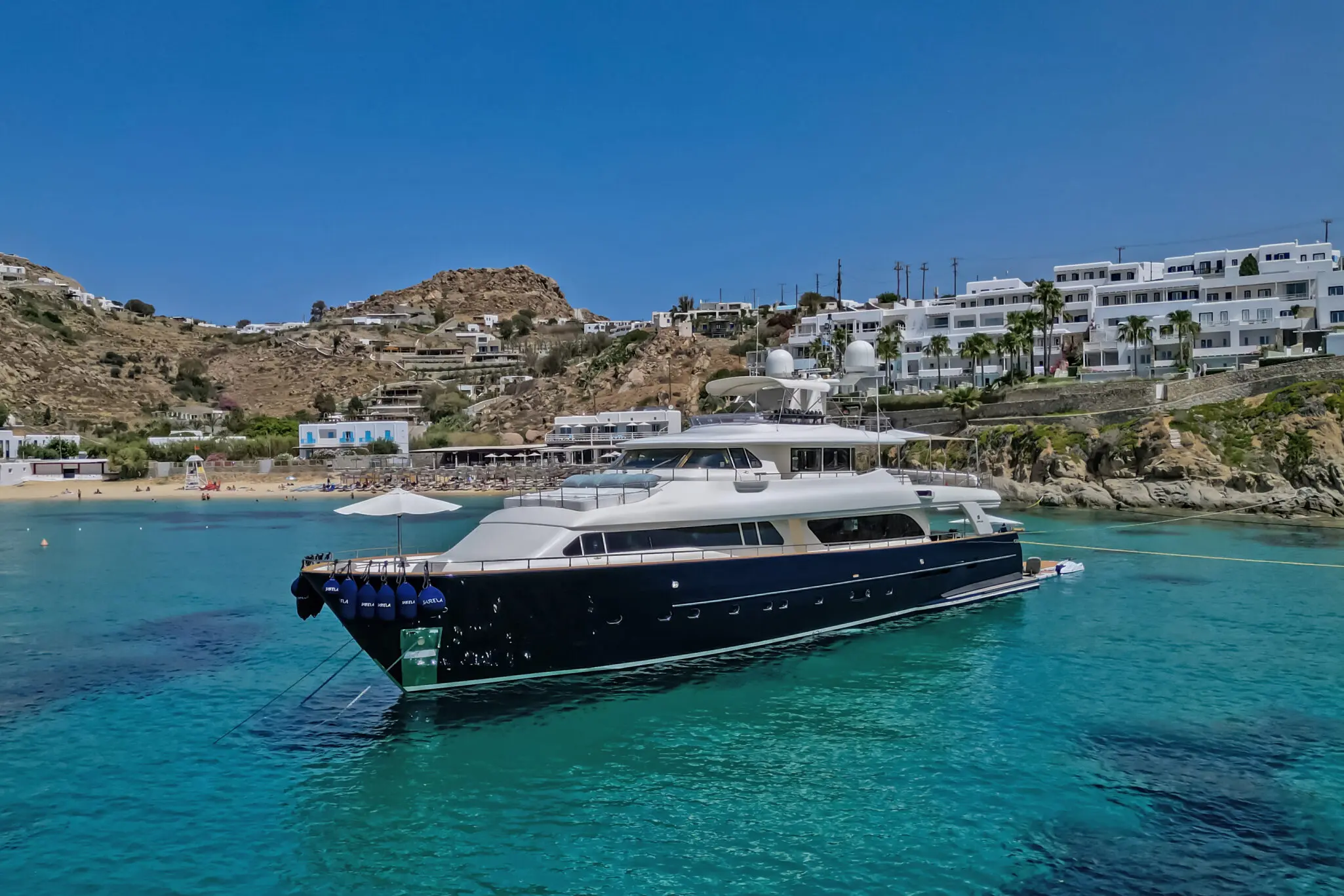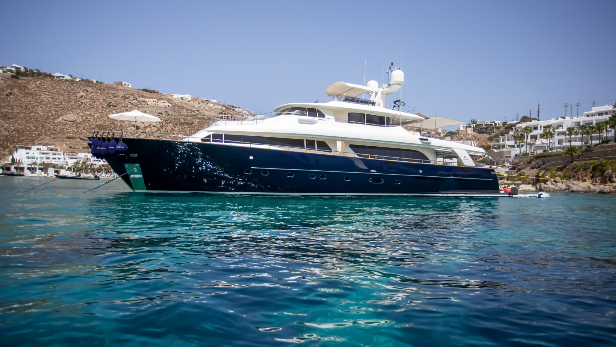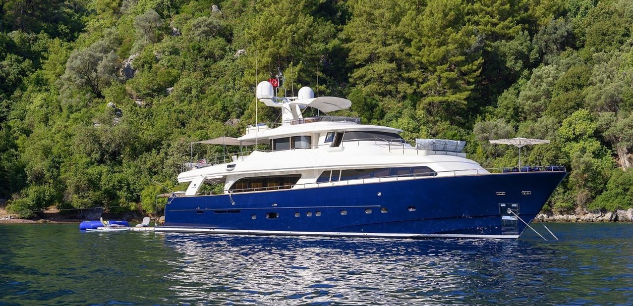 Meet M/Y HAG, a standout Navetta 30 tri-deck yacht blending timeless Zuccon International Project design with modern updates. Sporting a striking navy blue hull and white superstructure, she was delivered by her Italian builders in 2007 and received major refits in both 2023 and 2025.