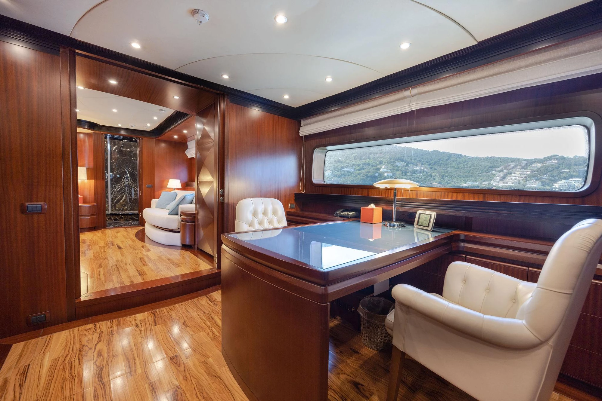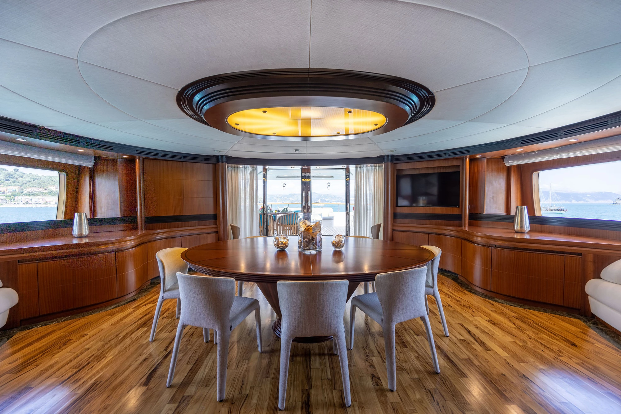 HOLIDAY welcomes up to 12 guests in five meticulously styled staterooms. The full-beam Owner’s Stateroom, located forward on the main deck, promises tranquility with its dedicated office for work or reflection. Four additional staterooms on the lower deck cater to guests with two doubles and two twins, each featuring a Pullman berth.