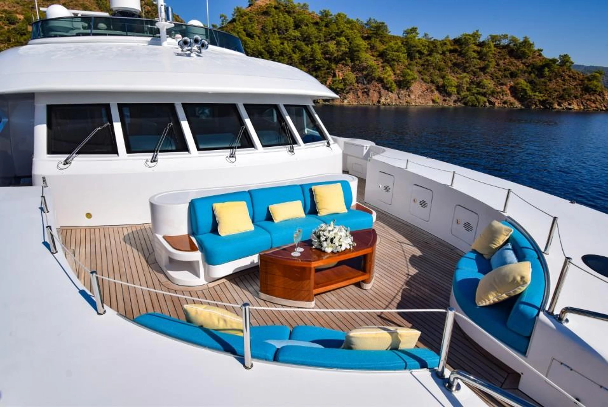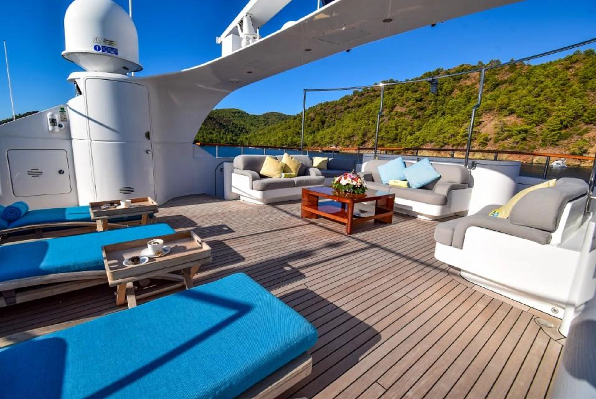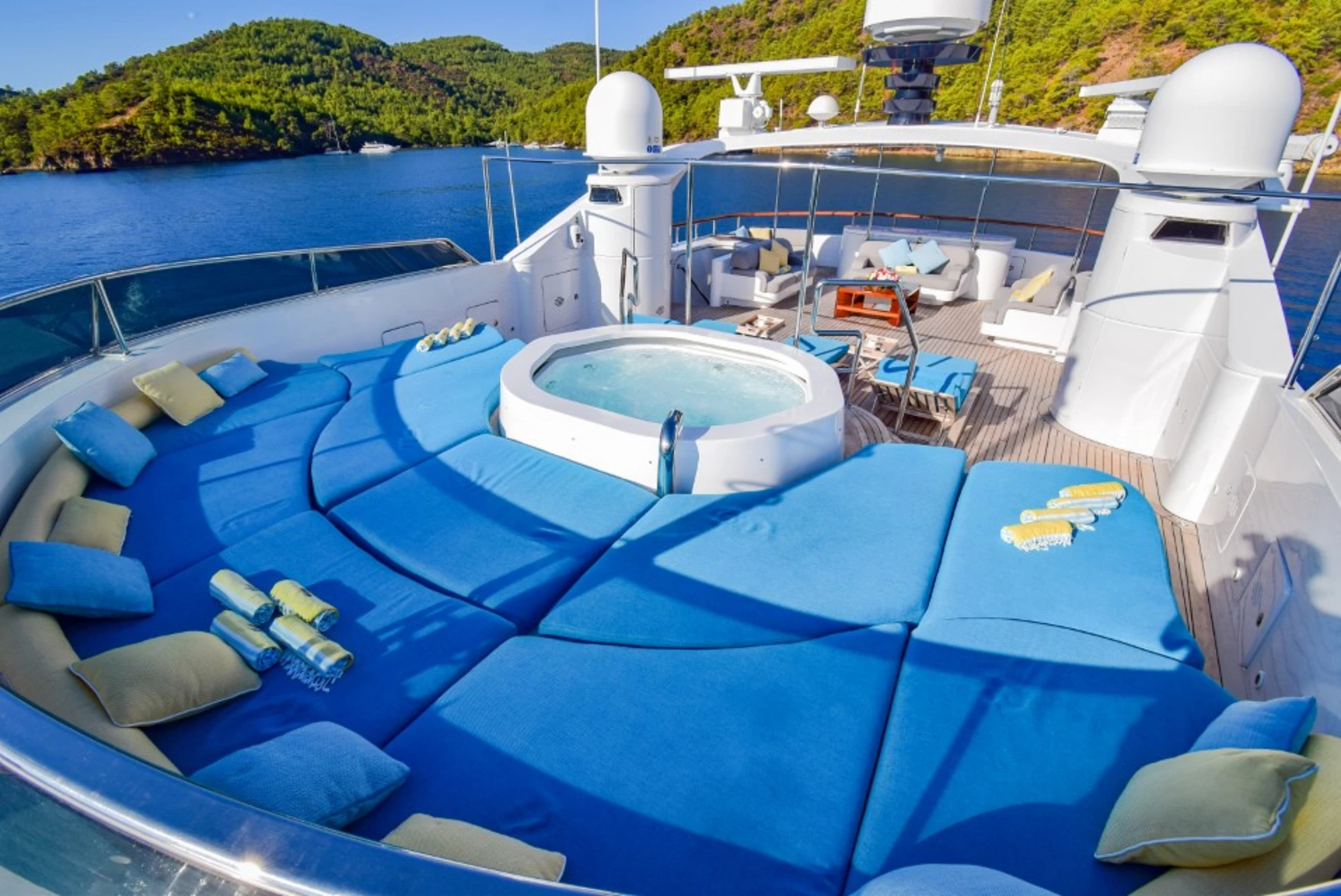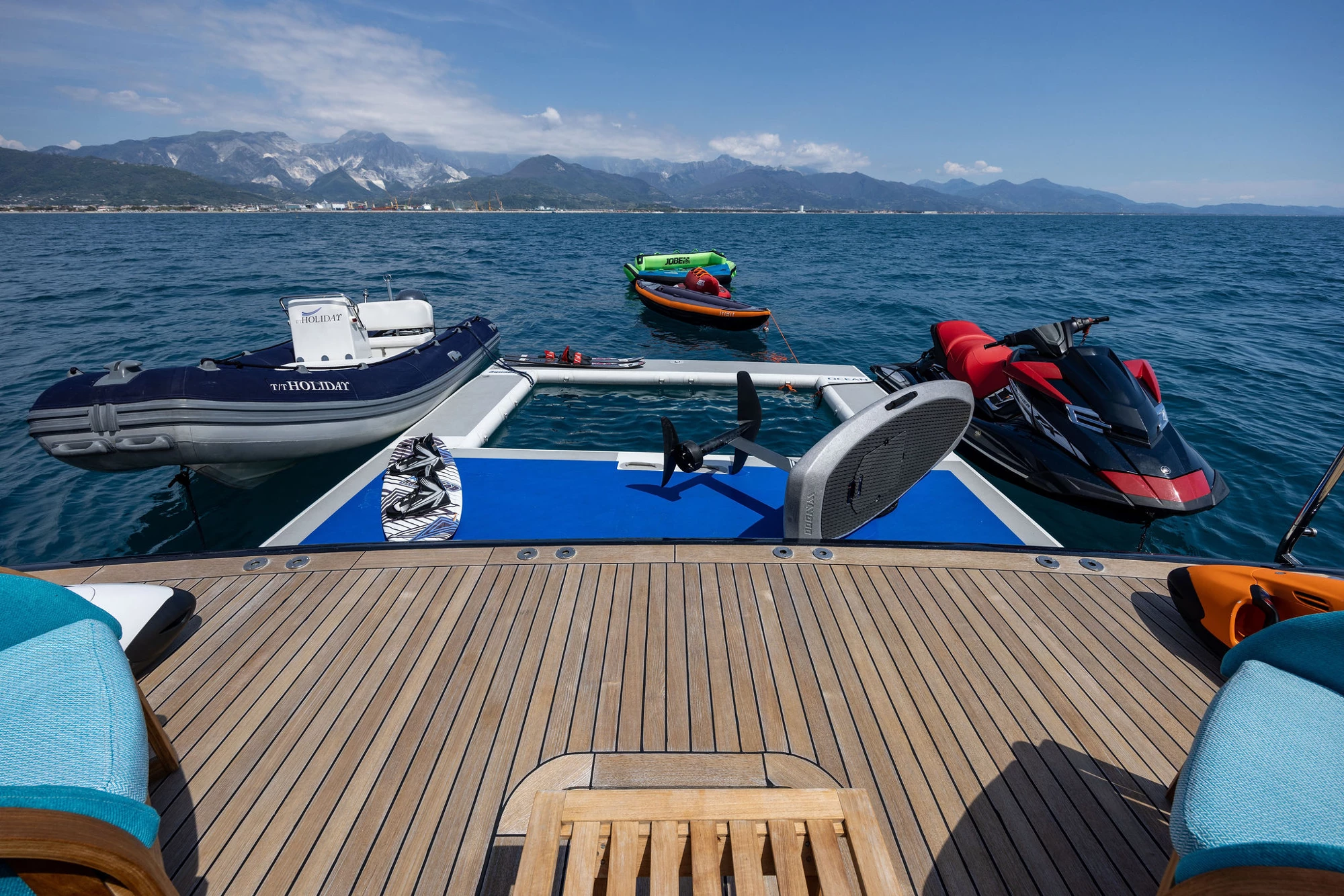 The yacht’s outdoor spaces are designed for relaxation and entertainment. Enjoy the expansive top deck with a hot tub and sun beds, or the forward lounge and open-air bar—perfect for gatherings under the sun or stars. HOLIDAY captures the spirit of escape in every detail, offering a sanctuary for long-distance cruising with loved ones.