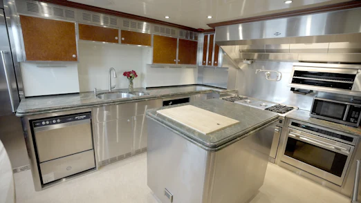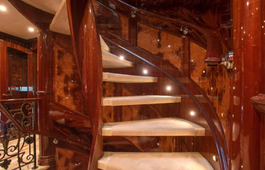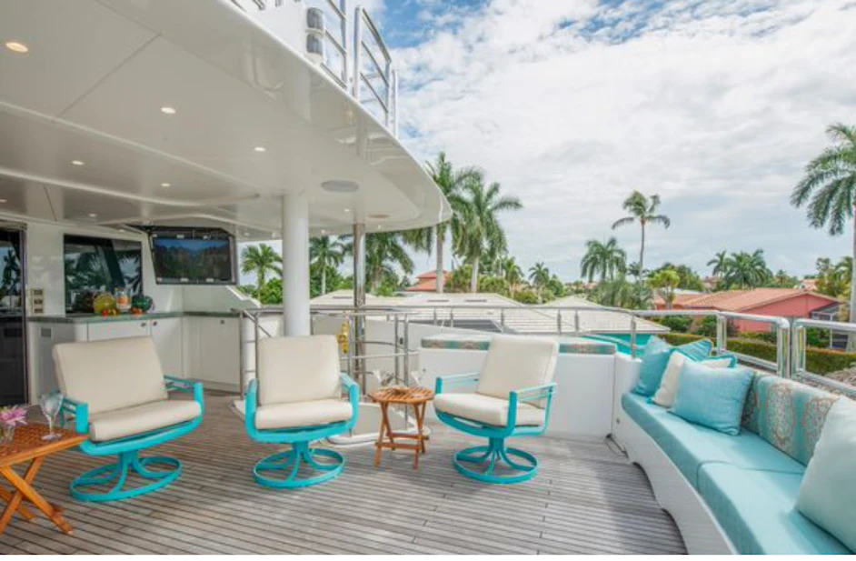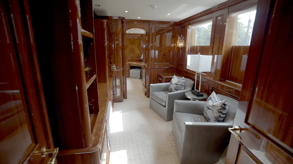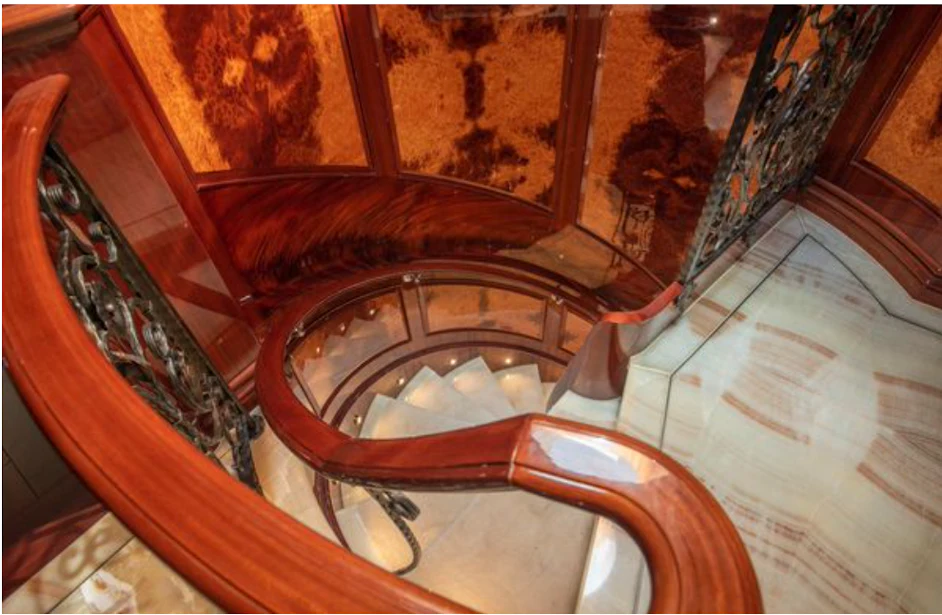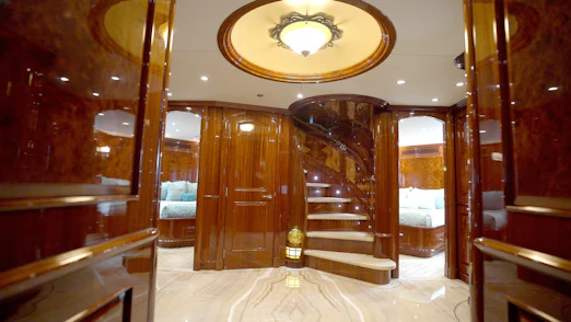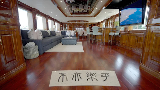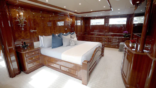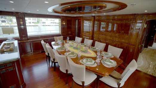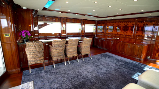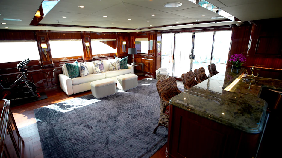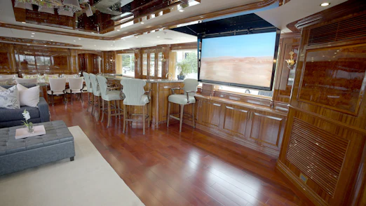 HOMECOMING’s interior showcases rich, high-gloss wood, custom marble in every room, new headliners, and hand-woven carpets. A striking circular staircase with skylight connects all decks. The main deck includes a commercial-grade galley, butler’s pantry, formal dining for 10, and a spacious salon with full-service bar.