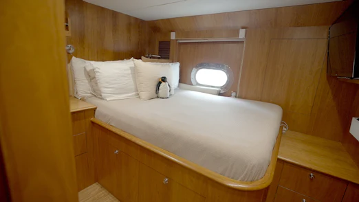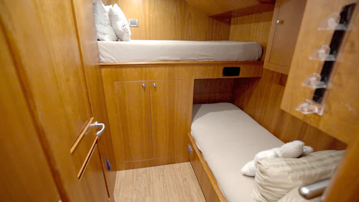 Up to 12 guests are pampered in six beautifully appointed staterooms. The main deck master suite features a king bed, his-and-hers baths, a Jacuzzi tub, central shower, and a private sitting room/office. The lower deck presents a VIP king suite, two queen suites, two single suites, and a full laundry/commissary. Crew quarters—three suites—are discreetly separated, accessible via the swim platform and port side deck, ensuring guest privacy.