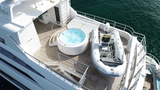 - Flybridge features jacuzzi/hot tub and sauna.