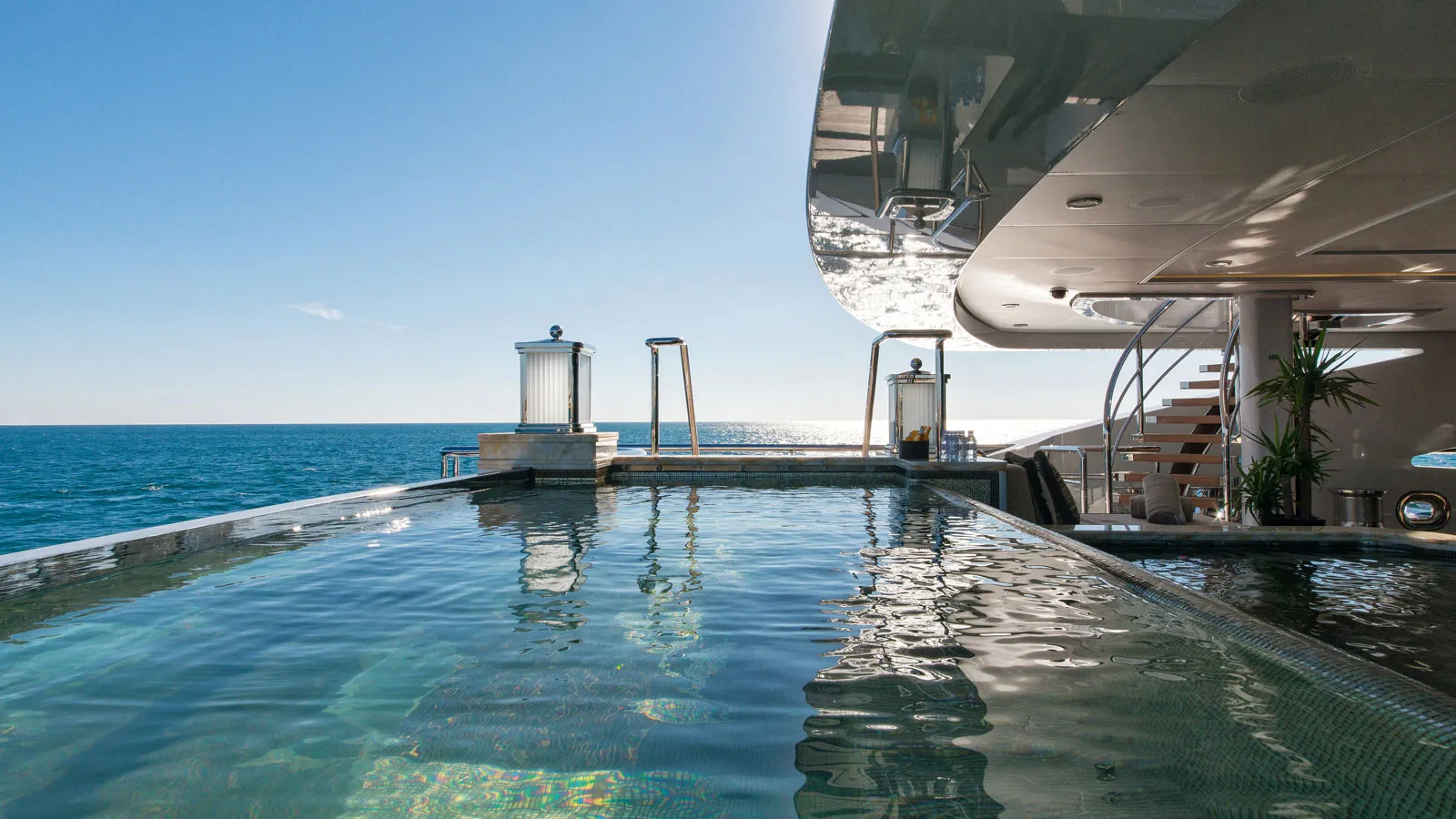 Outdoor spaces are equally inviting: dining areas, sundecks, a covered cinema, and a float-in tender garage that doubles as a salt-water pool. Behind the scenes, Hein dedicated ample space to machinery, crew quarters, and storage, ensuring smooth operations for a 32-strong crew.
