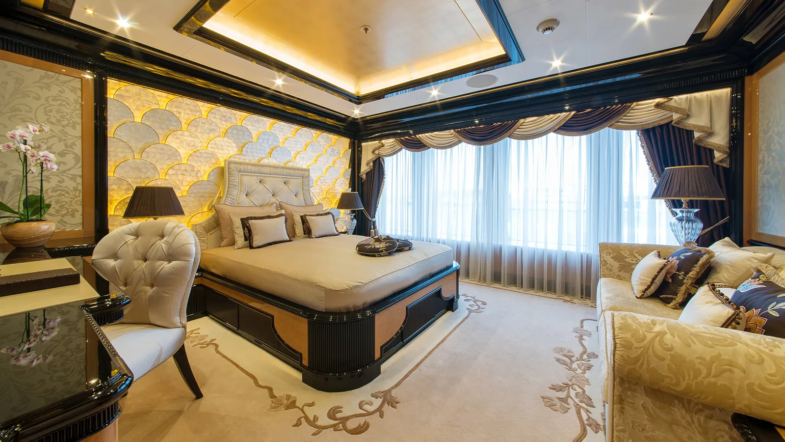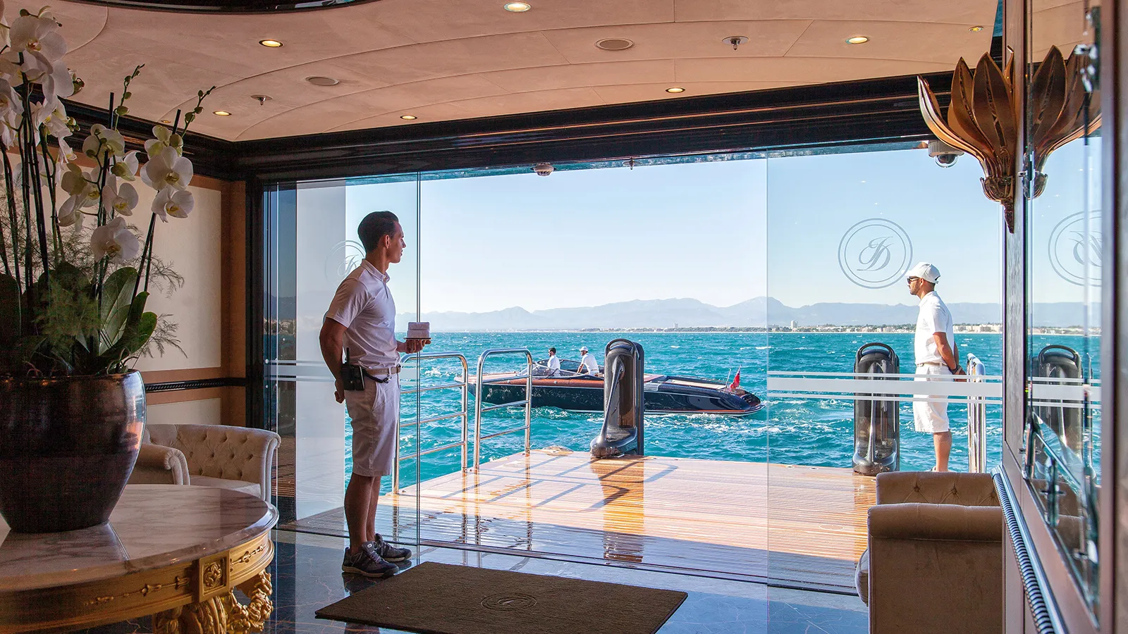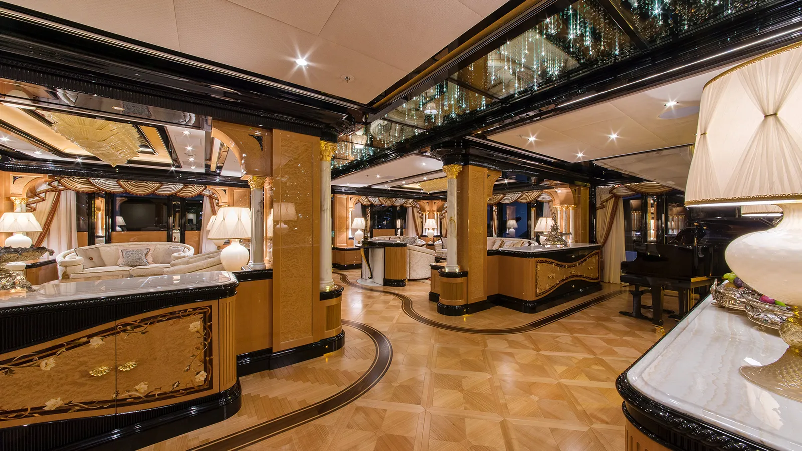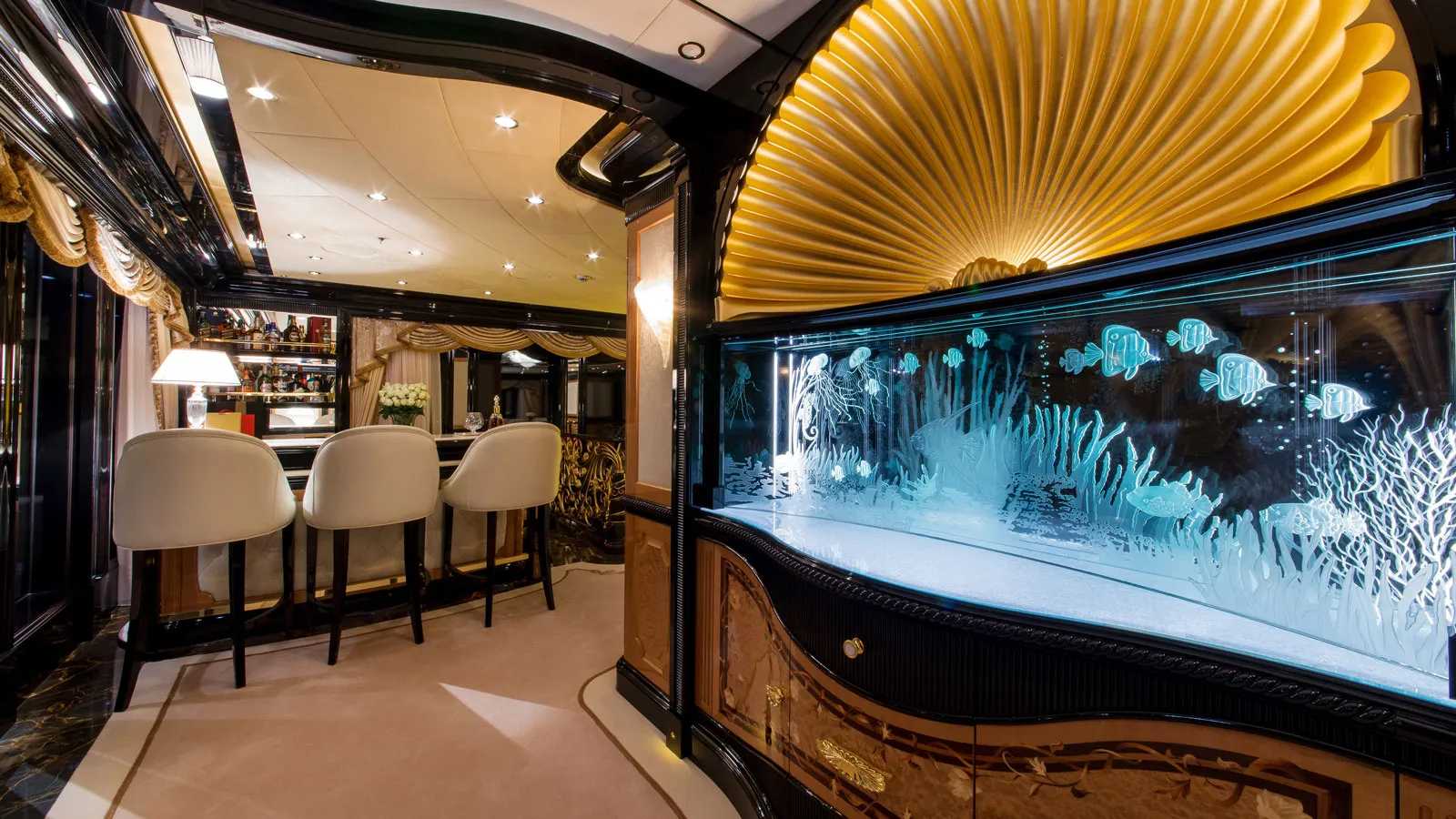 Creativity flourished under constraint. Traditional mahogany details were recreated using non-combustible plaster and faux finishes. Leather, not fabric, became the material of choice for wall panels. The interiors, designed by Alessandro Massari, blend contemporary glasswork with classic motifs and floral themes. Warm woods, intricate marquetry, and a show-stopping five-metre Murano chandelier set the tone. The main saloon is a multifunctional hub, seamlessly connected to the upper saloon by an open staircase—a true “heart of the yacht.”