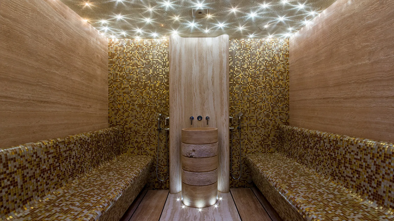 The “wow” factor peaks in the stone foyer, where Michelangelo-inspired marblework surrounds a glass elevator. Gold leaf and rare marbles add luxury, while each cabin is a unique retreat, featuring backlit 3D oyster shell headboards and Italian-inspired design.