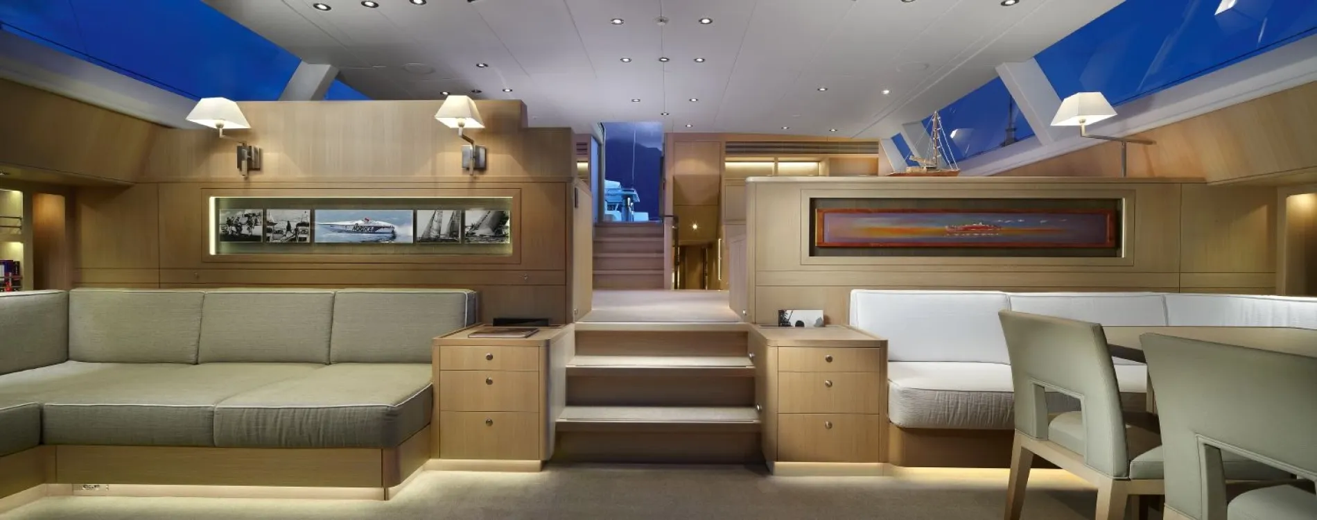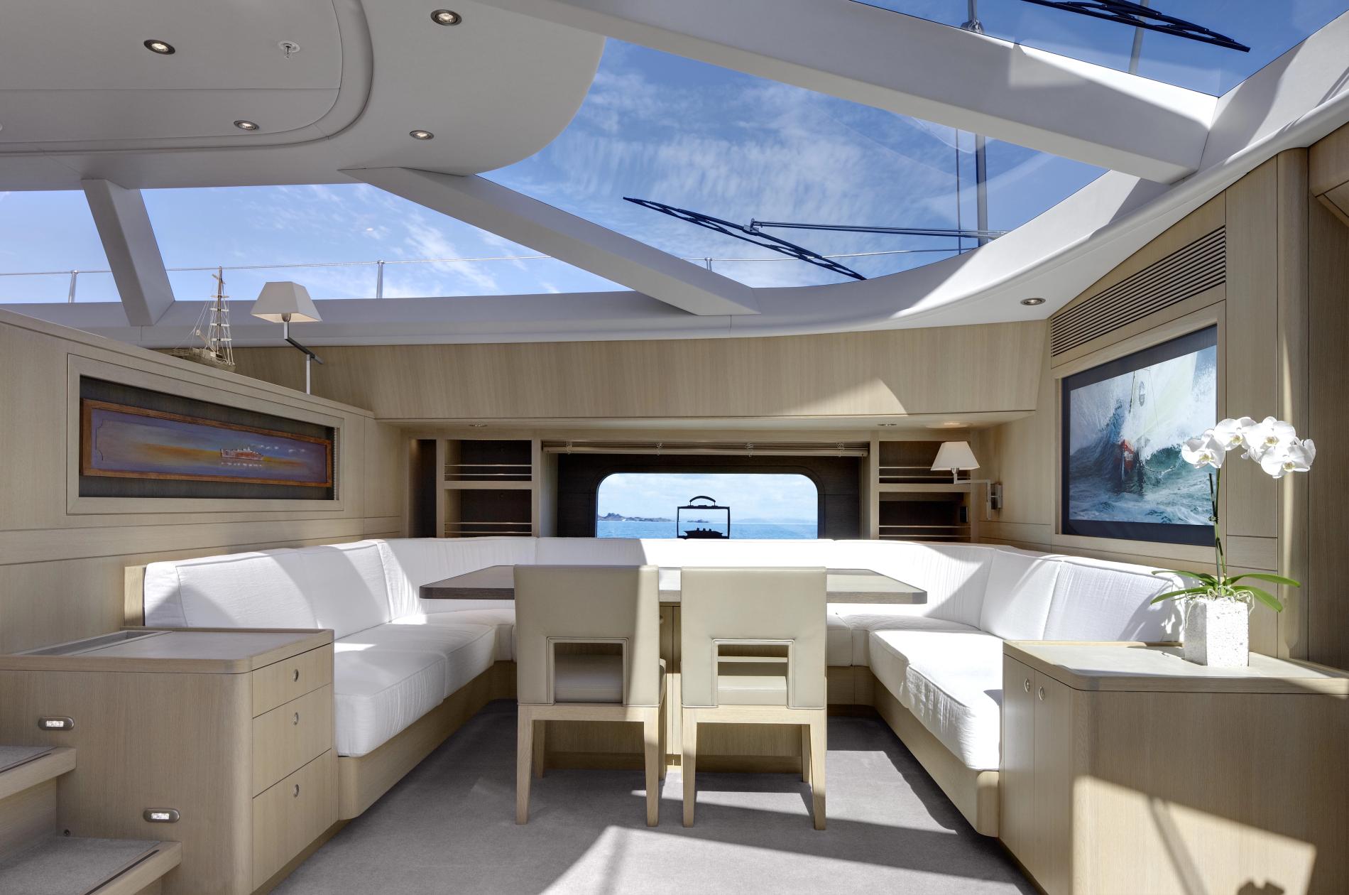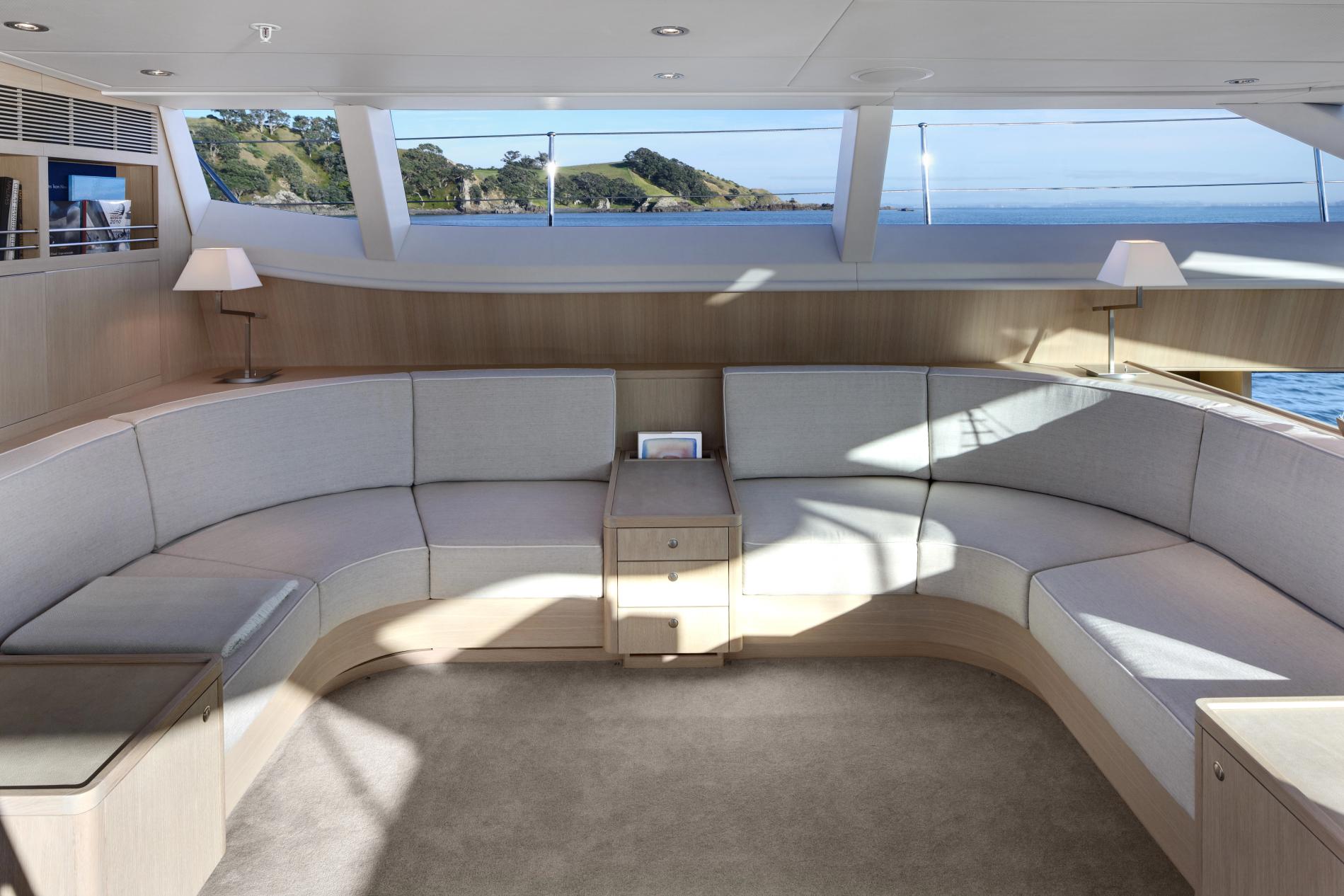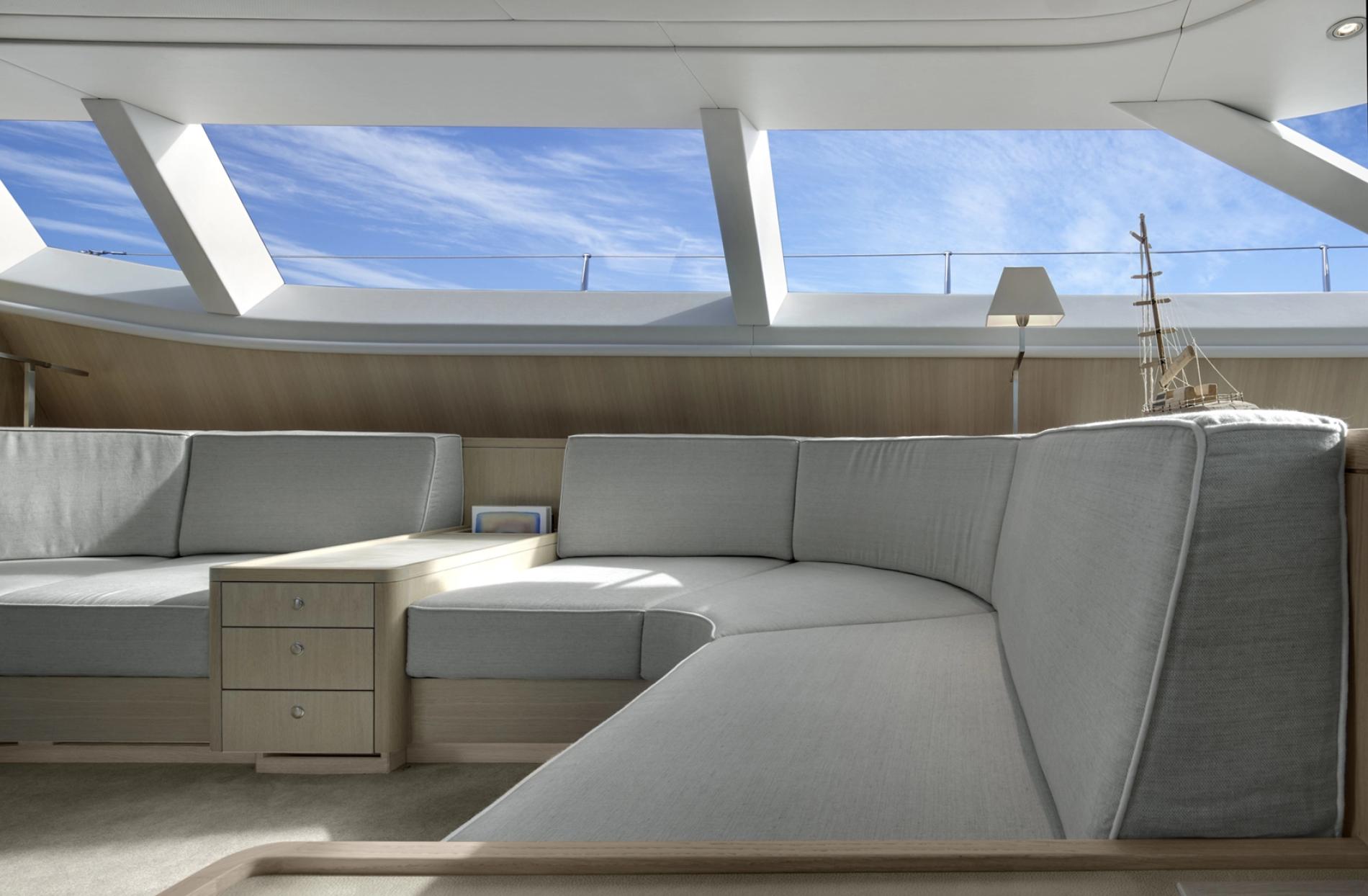 Inside, wraparound glass surrounds a raised salon providing panoramic vistas flooded by natural light—a lounge area on one side balanced by navigation capabilities on the other within this split-level layout where deckhouse windows serve as skylights above dining arrangements below finished elegantly using white oak joinery paired seamlessly alongside Loro Piana fabrics complementing alpaca carpets adorned uniquely through custom elements like recessed vase holders or magazine racks integrated gracefully throughout interiors enhanced further upon special request such as automated sliding doors or opening portholes enhancing master suite experiences enriched notably beyond mere aesthetics towards functional enhancements ranging from sizeable freezer spaces ensuring cold storage optimization requisite firearm safes catering Arctic voyages against polar bear threats safeguarding overall passenger security impeccably anticipated aboard every expedition embarked upon therein.