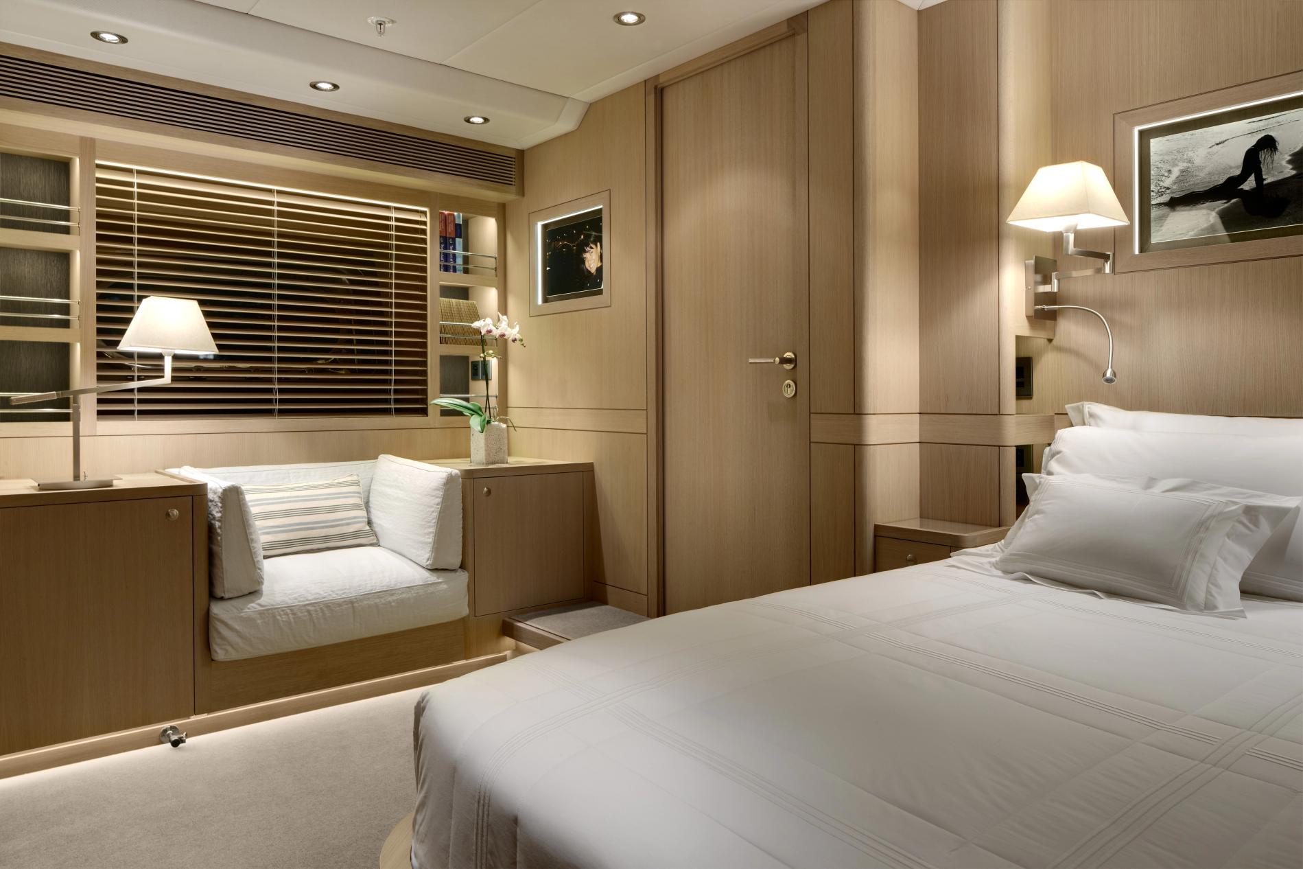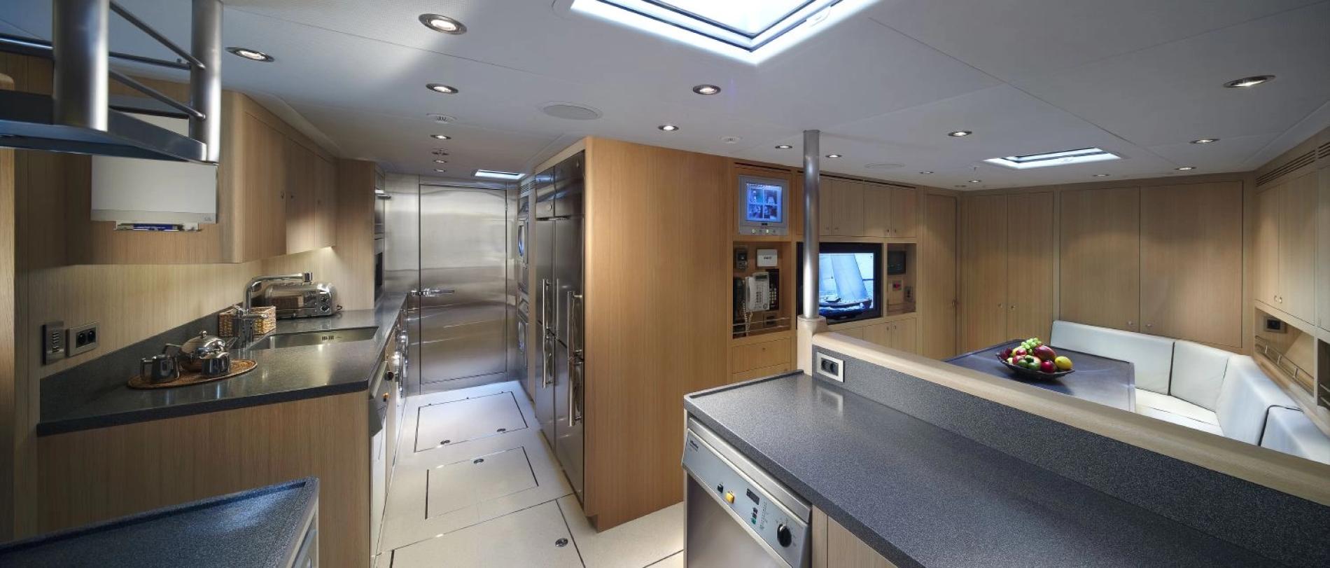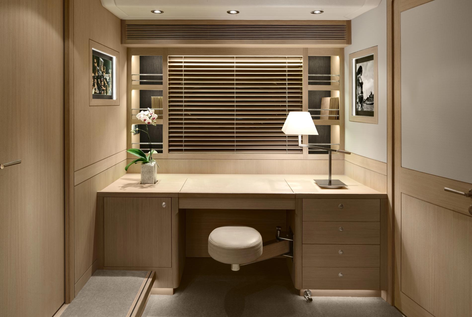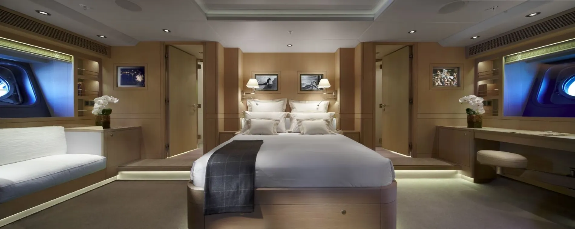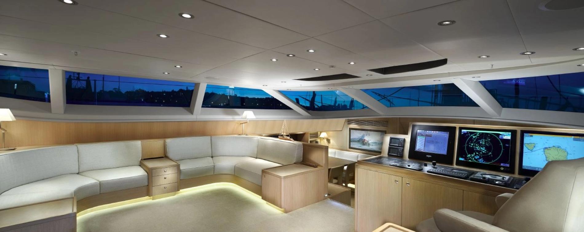 Inside, wraparound glass surrounds a raised salon providing panoramic vistas flooded by natural light—a lounge area on one side balanced by navigation capabilities on the other within this split-level layout where deckhouse windows serve as skylights above dining arrangements below finished elegantly using white oak joinery paired seamlessly alongside Loro Piana fabrics complementing alpaca carpets adorned uniquely through custom elements like recessed vase holders or magazine racks integrated gracefully throughout interiors enhanced further upon special request such as automated sliding doors or opening portholes enhancing master suite experiences enriched notably beyond mere aesthetics towards functional enhancements ranging from sizeable freezer spaces ensuring cold storage optimization requisite firearm safes catering Arctic voyages against polar bear threats safeguarding overall passenger security impeccably anticipated aboard every expedition embarked upon therein.