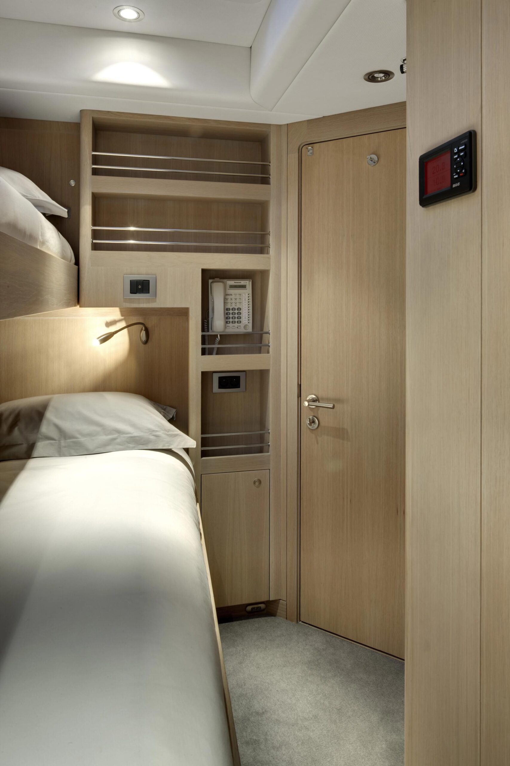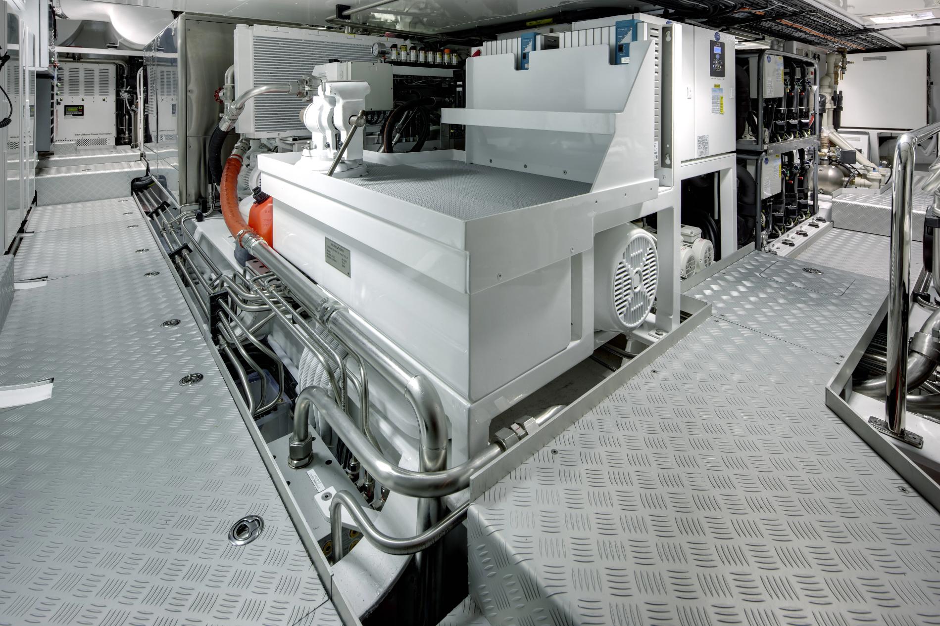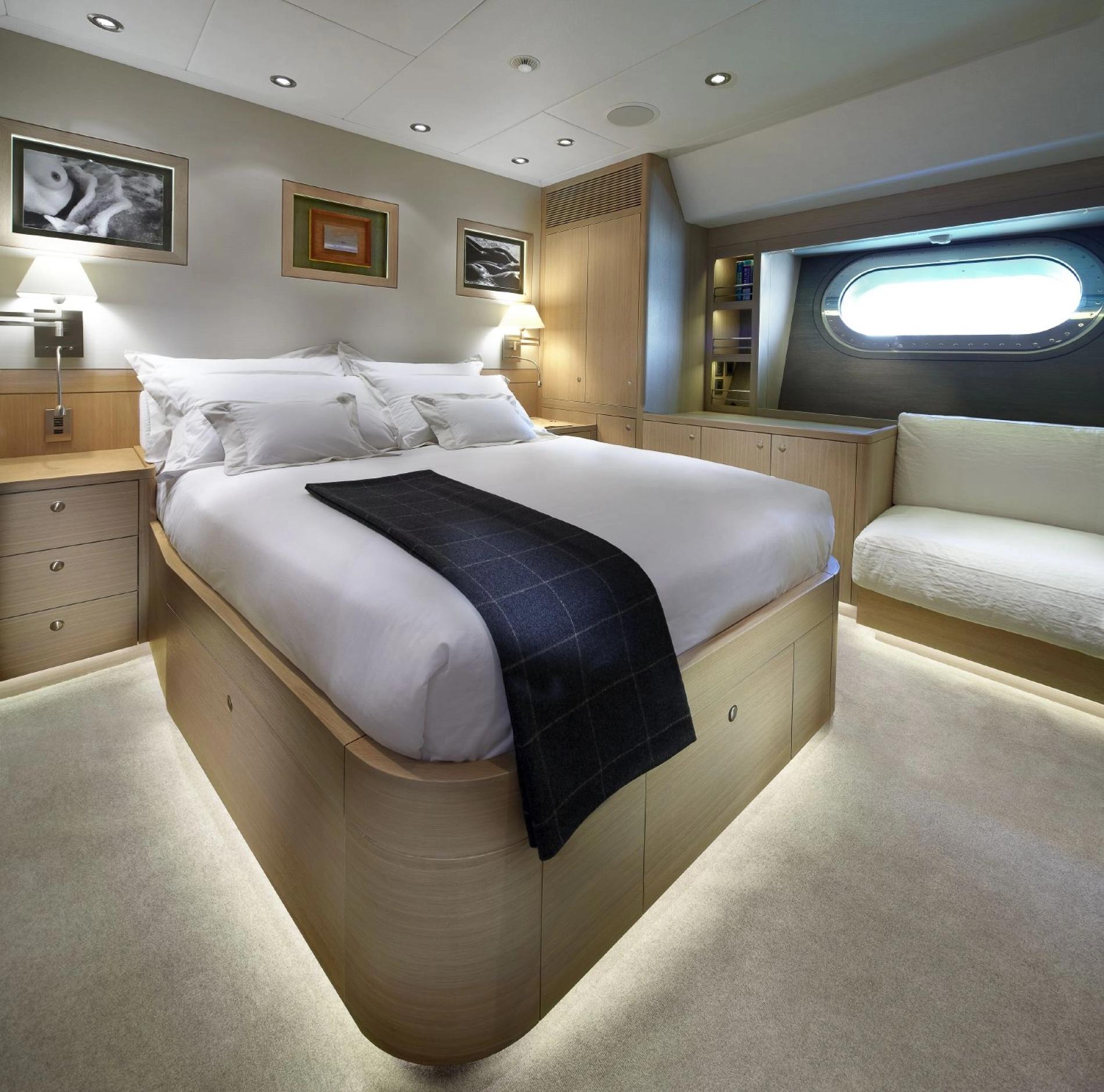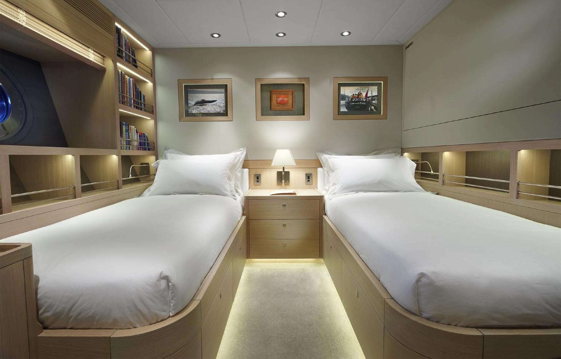 Inside, wraparound glass surrounds a raised salon providing panoramic vistas flooded by natural light—a lounge area on one side balanced by navigation capabilities on the other within this split-level layout where deckhouse windows serve as skylights above dining arrangements below finished elegantly using white oak joinery paired seamlessly alongside Loro Piana fabrics complementing alpaca carpets adorned uniquely through custom elements like recessed vase holders or magazine racks integrated gracefully throughout interiors enhanced further upon special request such as automated sliding doors or opening portholes enhancing master suite experiences enriched notably beyond mere aesthetics towards functional enhancements ranging from sizeable freezer spaces ensuring cold storage optimization requisite firearm safes catering Arctic voyages against polar bear threats safeguarding overall passenger security impeccably anticipated aboard every expedition embarked upon therein.