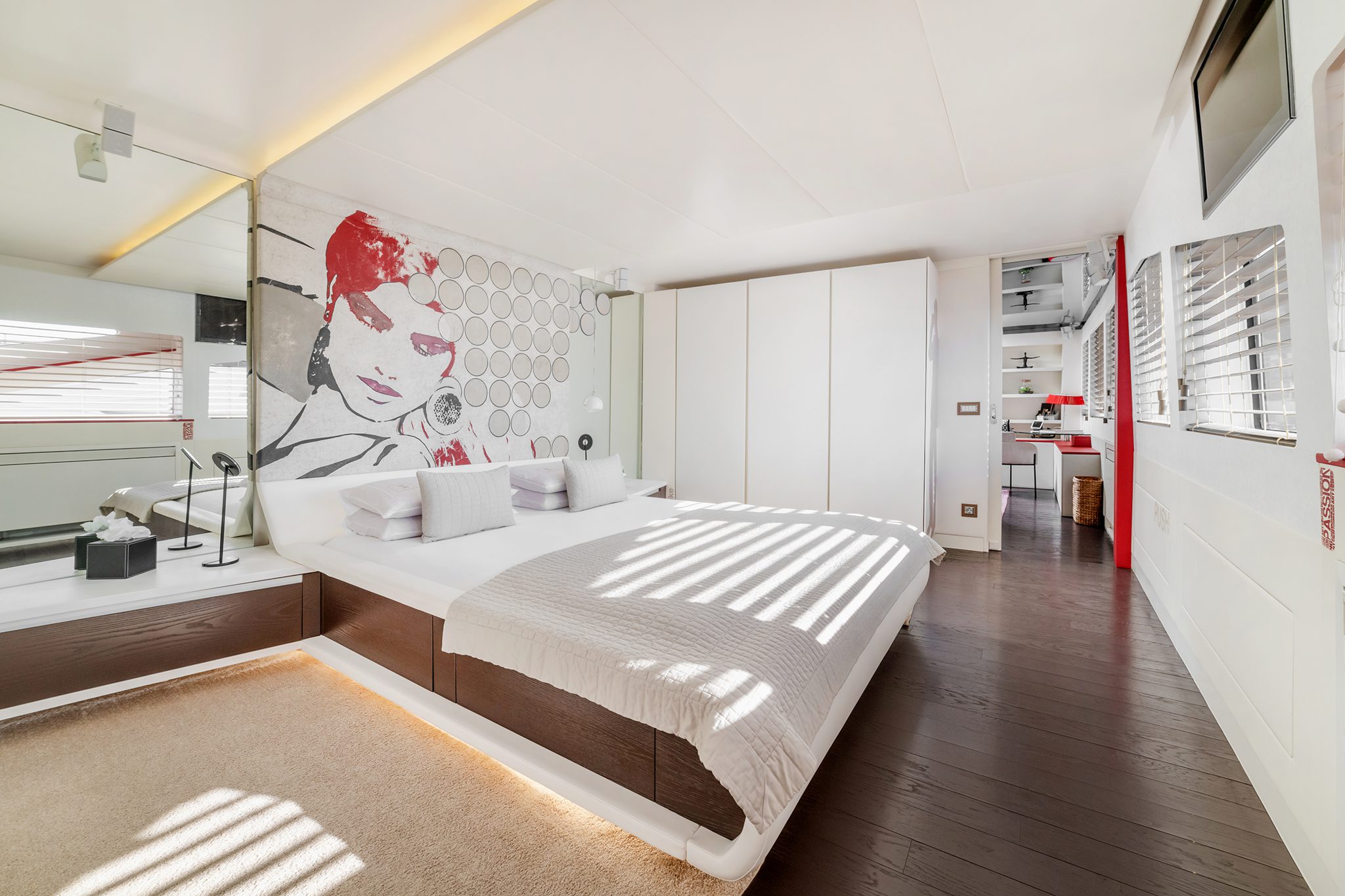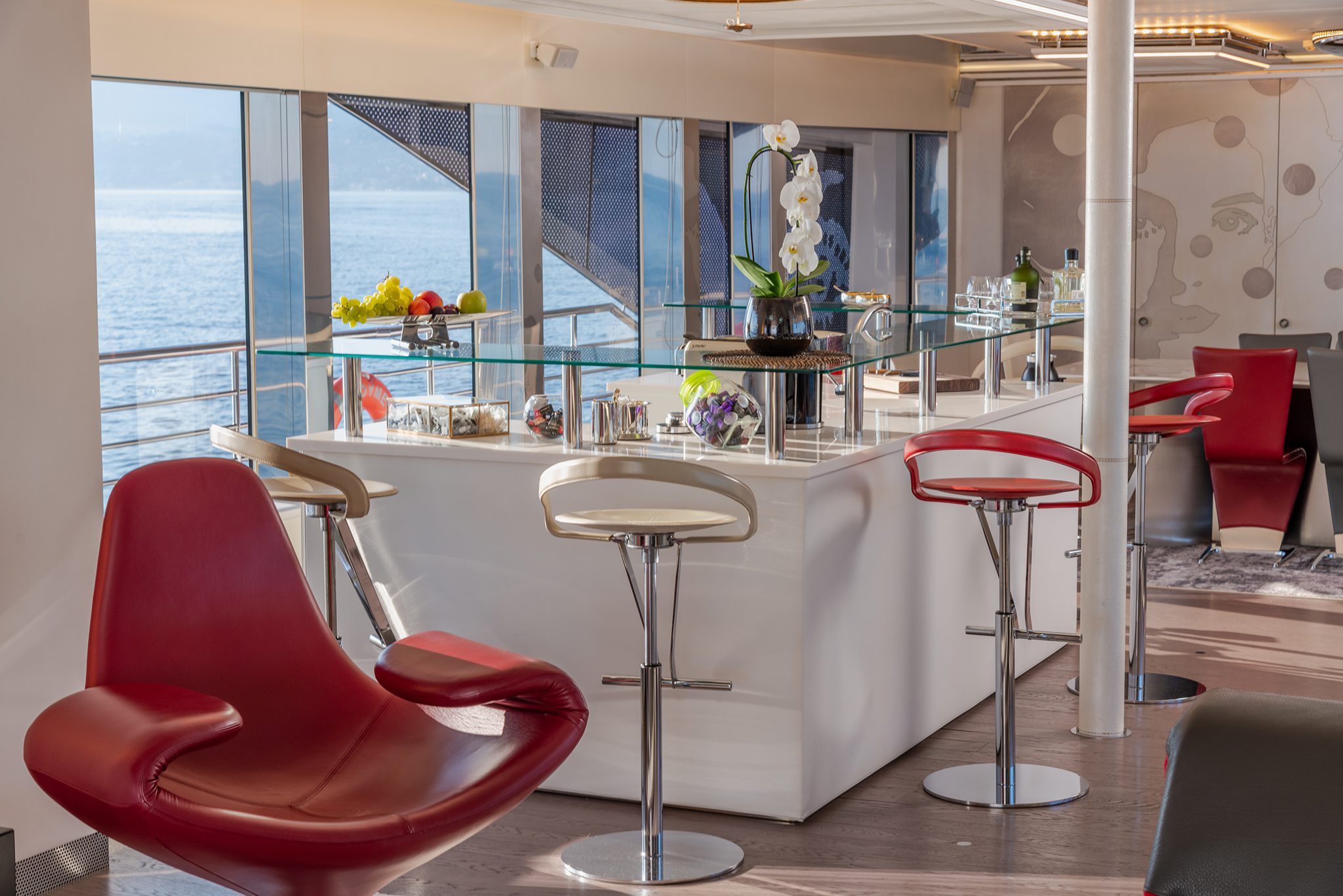 Step inside, and the extraordinary story continues. Designed by visionary Philip Zepter, The JoyMe’s interiors celebrate pop-art glamour and modern creativity. Each space has its own character, featuring playful motifs, vibrant colors, and a gallery-like ambiance where art meets function. The six guest cabins each offer a unique style, ensuring a fresh experience for every visitor. The master suite and VIP suite boast private terraces perfect for sunrise coffees and sunset cocktails with panoramic sea views.
