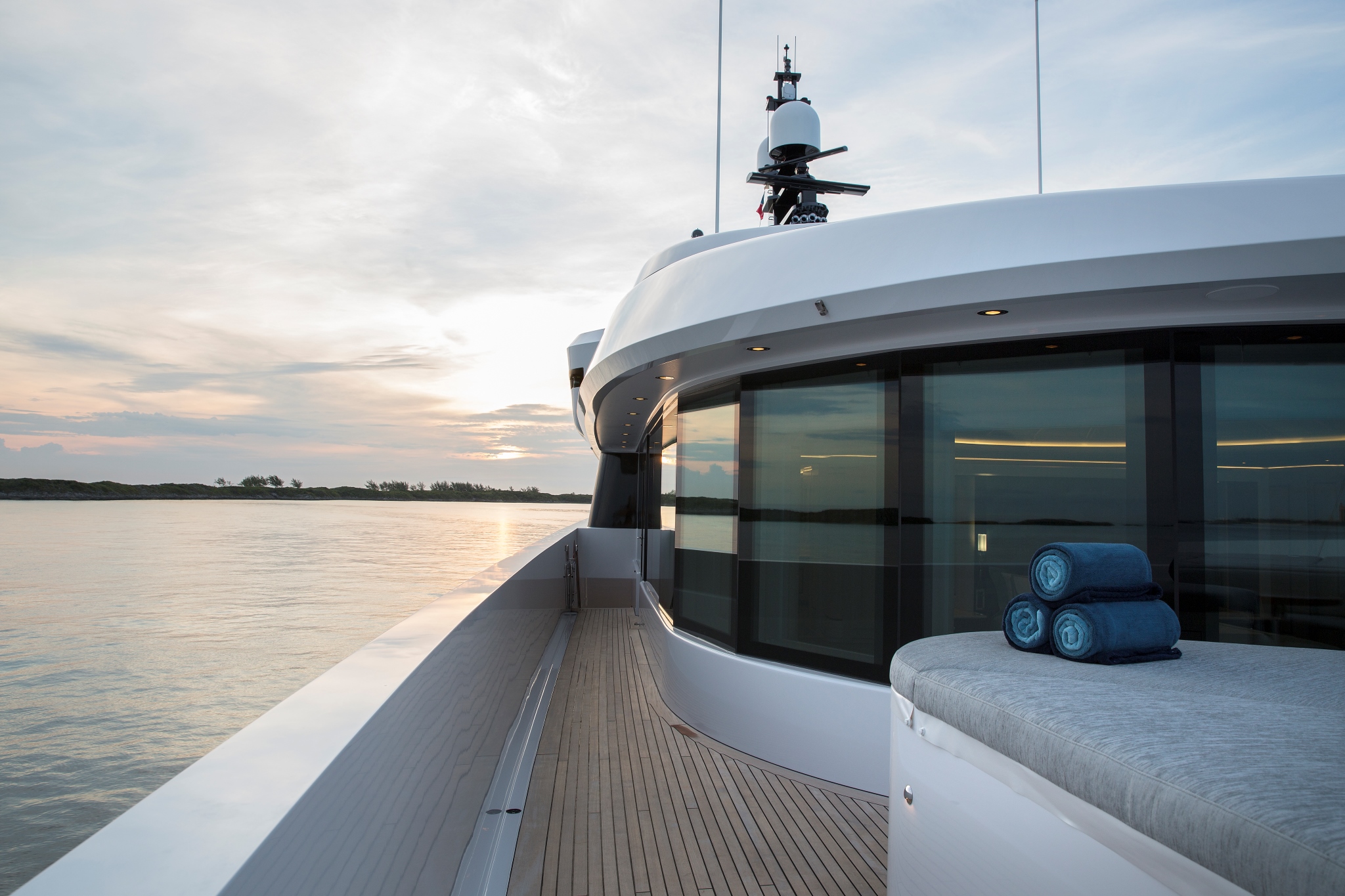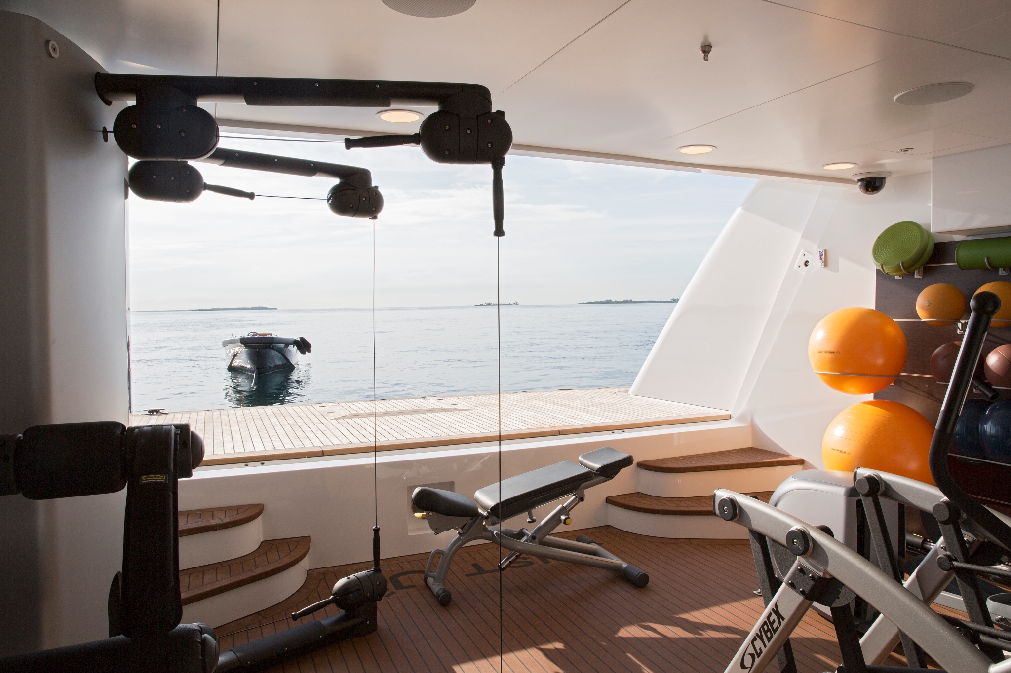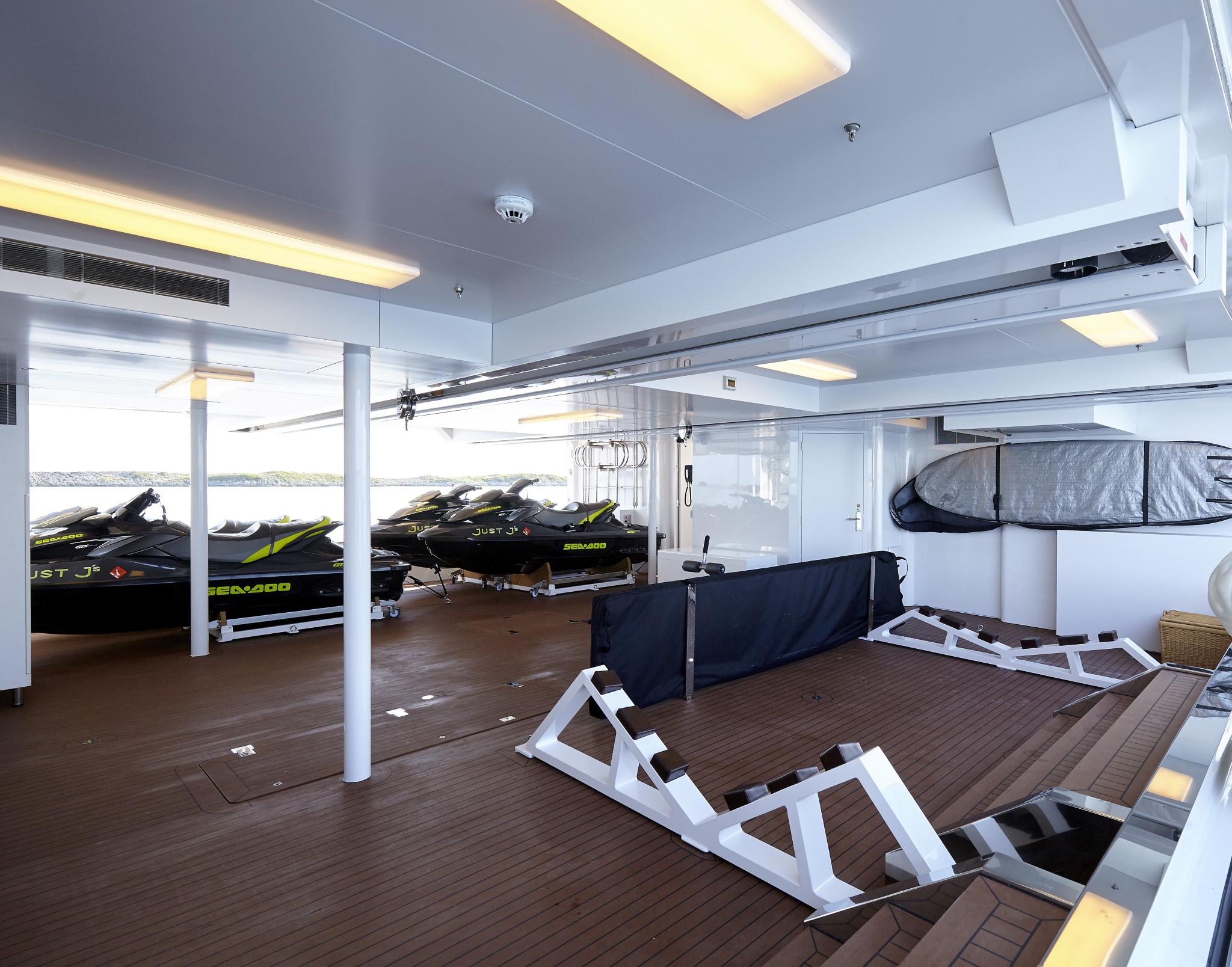 Key features include a custom‑built elevator, a spacious lazarette gym, and a large tender garage housing four jetskis with port and starboard launch. Her sun deck features a 3×2‑metre pool, adding to her strong lifestyle appeal.