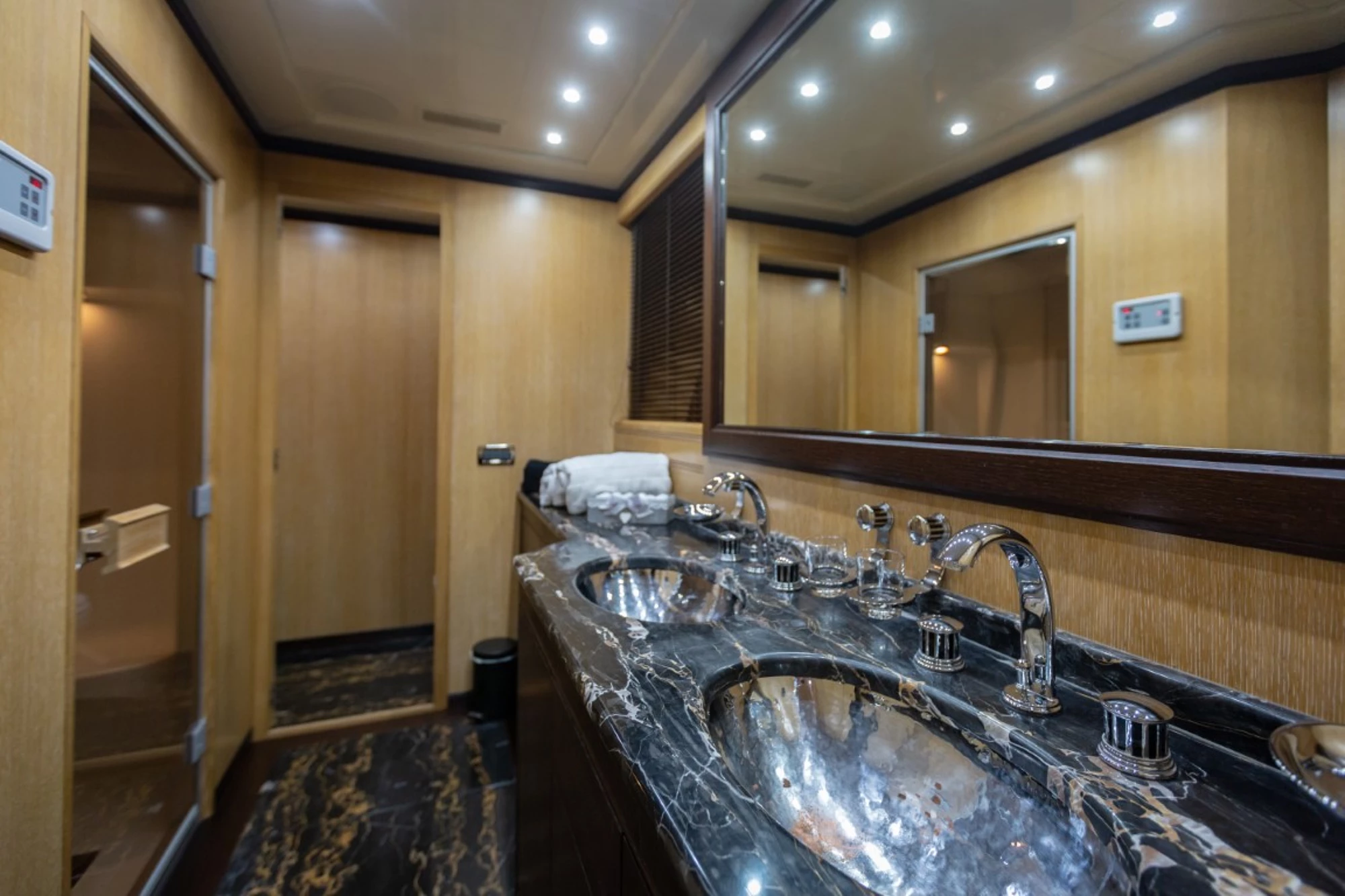 She accommodates nine guests in four en-suite cabins, including a full-beam master suite with a spacious bathroom and steam bath. The additional cabins are thoughtfully designed for comfort and storage. Plus, the yacht provides crew quarters for five across three cabins, each with en-suite facilities and a dedicated mess.