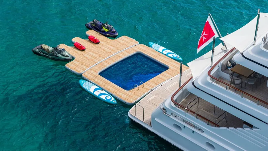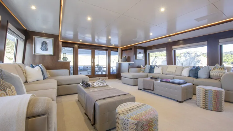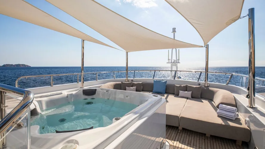 The main deck aft offers alfresco dining with a table, sofa, and chairs, perfect for outdoor meals. Walkways lead to the foredeck, where sunbeds await above. The upper deck aft provides seating ideal for sunset conversations and drinks. The sundeck presents breathtaking views, featuring sun pads, a Jacuzzi, and options for sun or shade with a canvas cover. A bar and seating along the stern complete the experience.