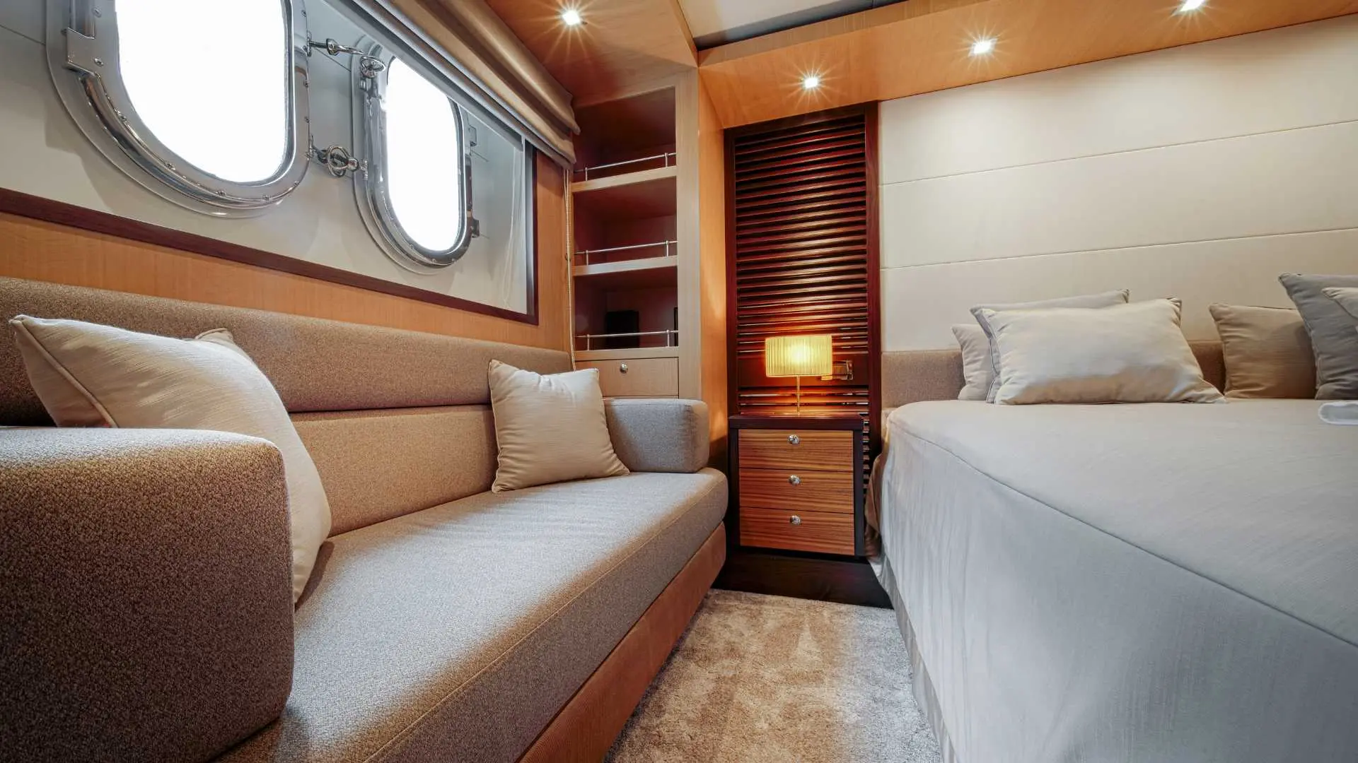 The yacht accommodates up to eight guests in four cabins. The full-beam master suite, located aft, features a king-size bed, dual sinks, and an en-suite. Two twin guest cabins with en-suite bathrooms offer updated finishes, while a fourth cabin, previously a sauna, includes two nearly double-sized beds, a single bed, and private access.