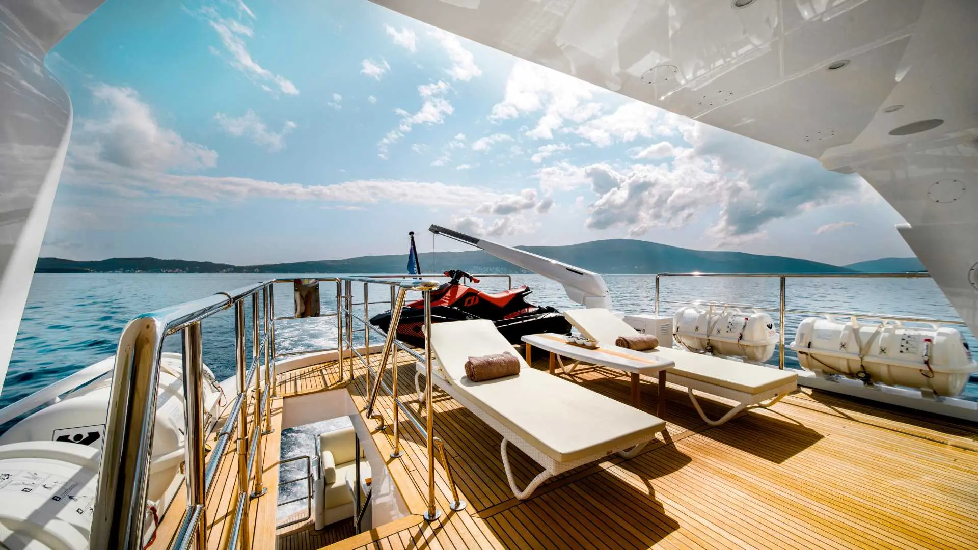 A teak-laid swim platform enhances water access, aided by a crane for tender deployment. Hydraulic capstans, oversized cleats, and Muir winches with substantial anchors underscore her seagoing capability.