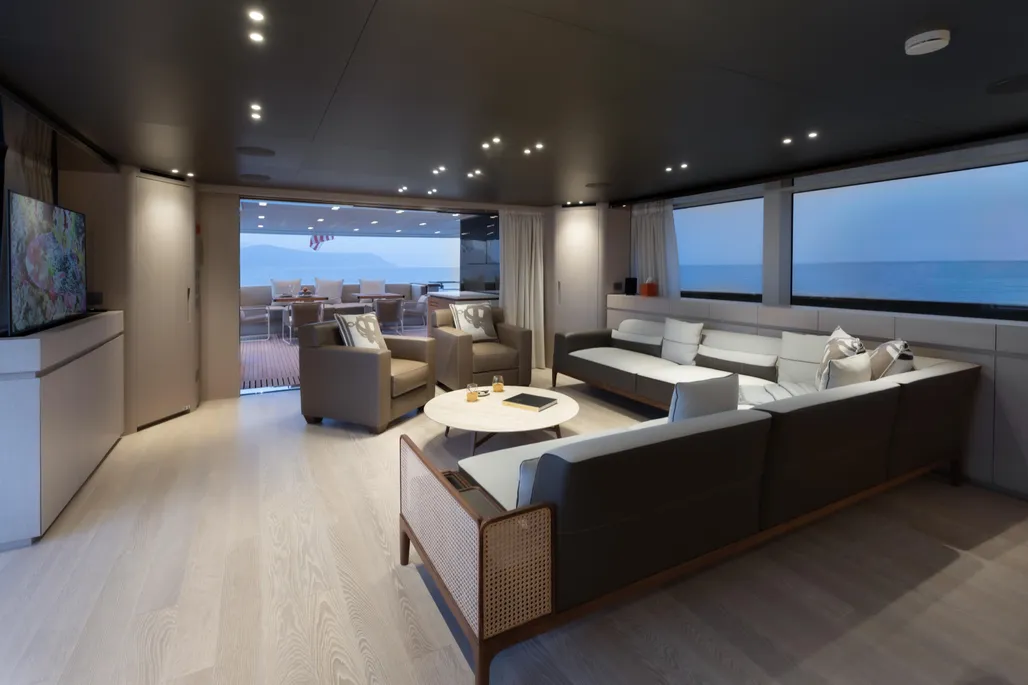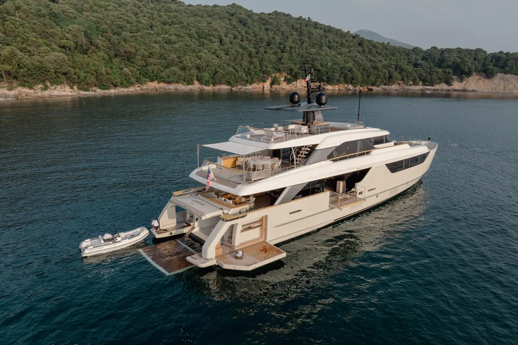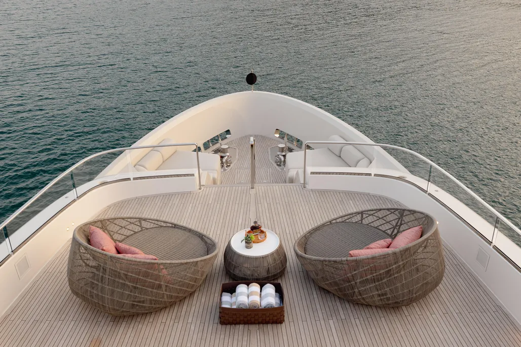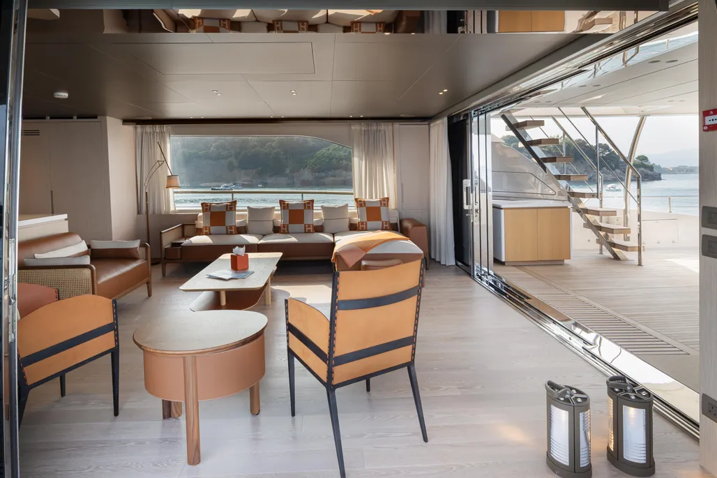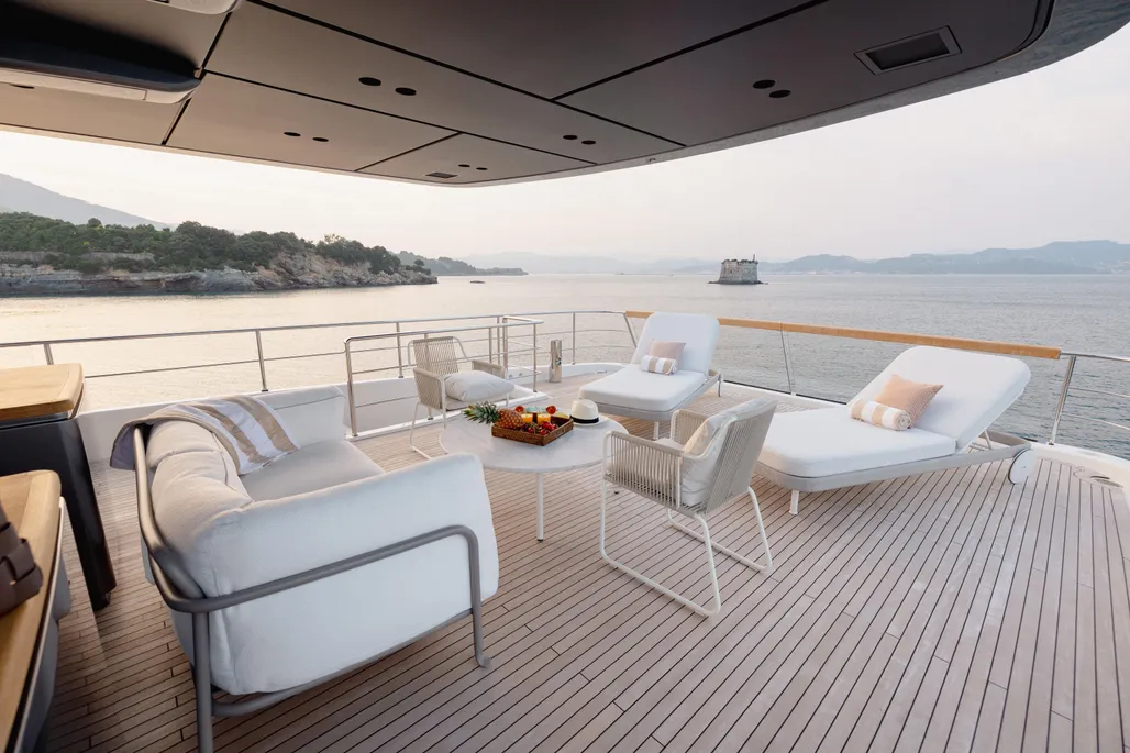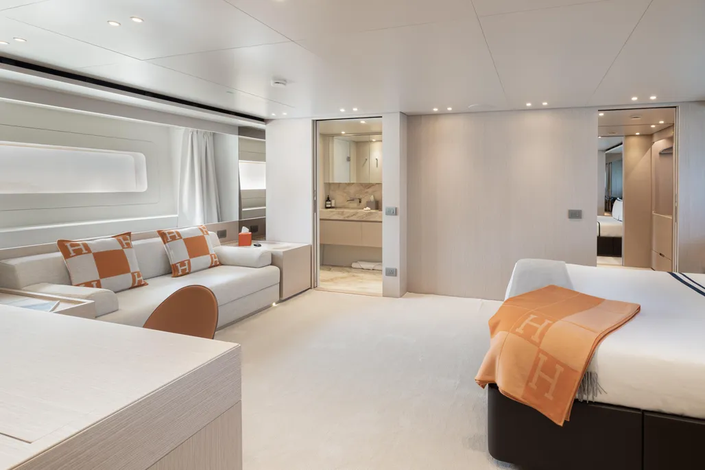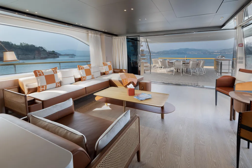Highlights include immaculate presentation after only one season of private use; an exclusive layout featuring two master suites plus a massage room convertible into another guest cabin; renowned Sanlorenzo design enhanced with Hermès furnishings; luxurious interiors featuring upgraded marble bathrooms and oak floors in main areas. An al fresco balcony off the main salon facilitates effortless indoor-outdoor living experiences.