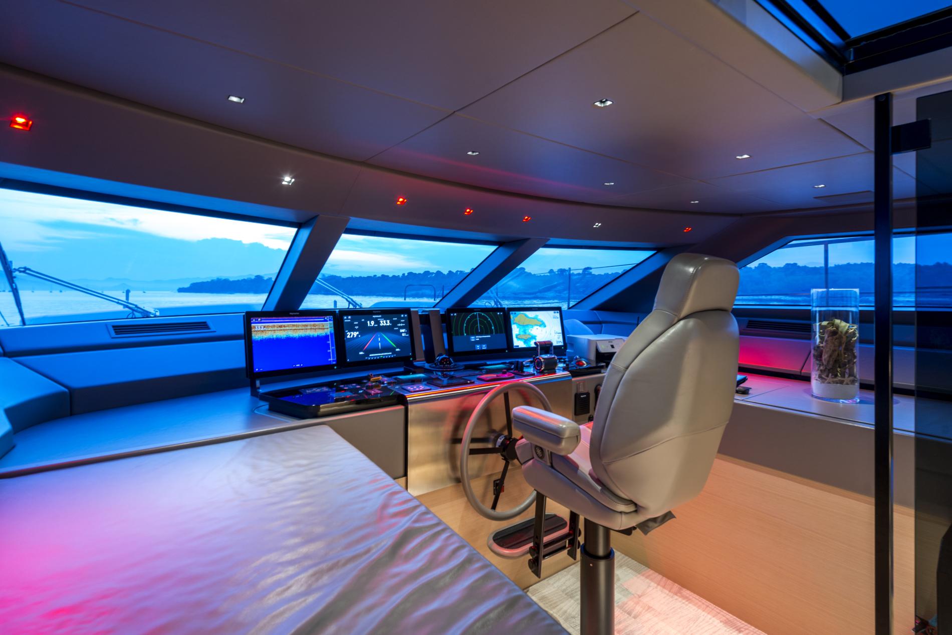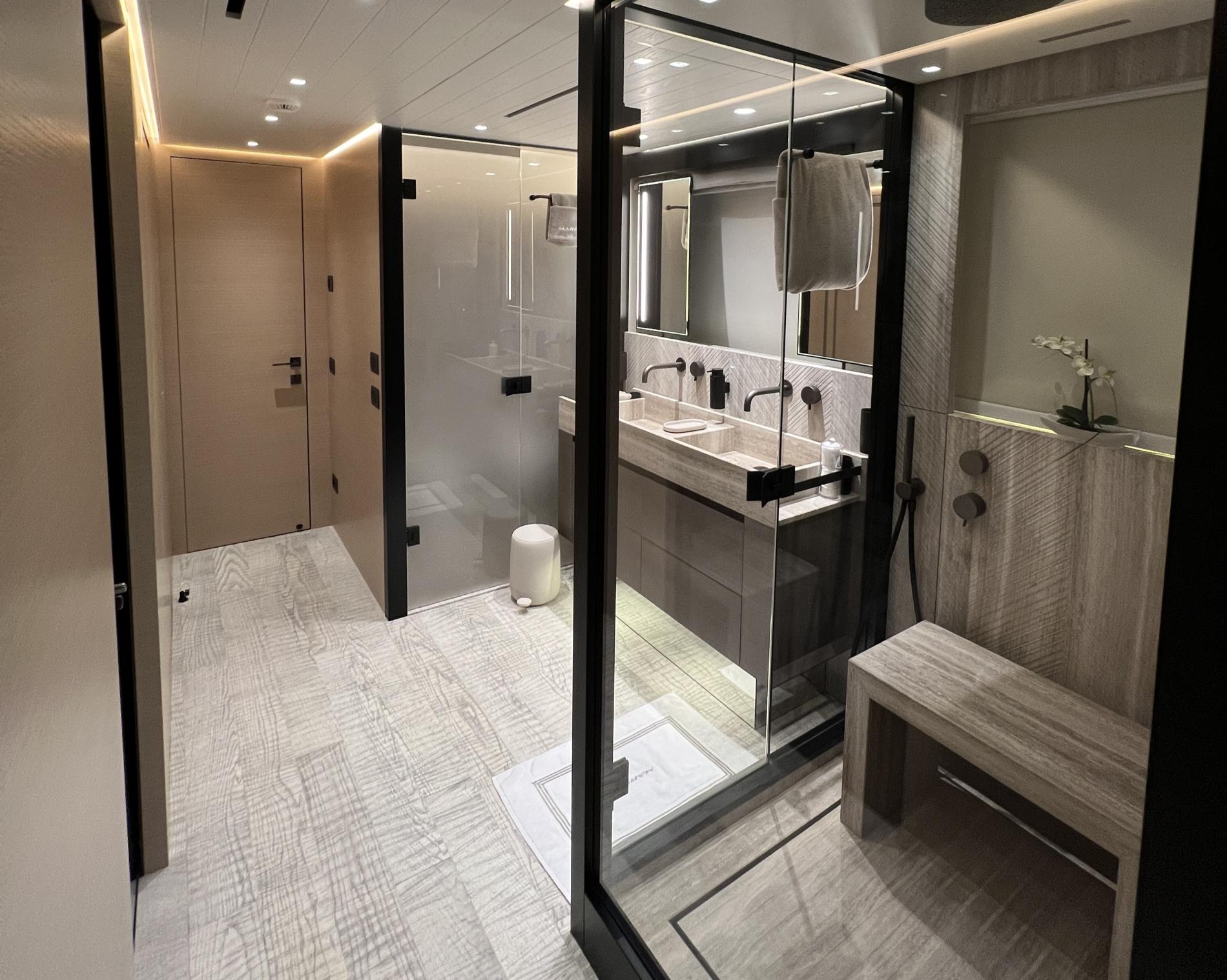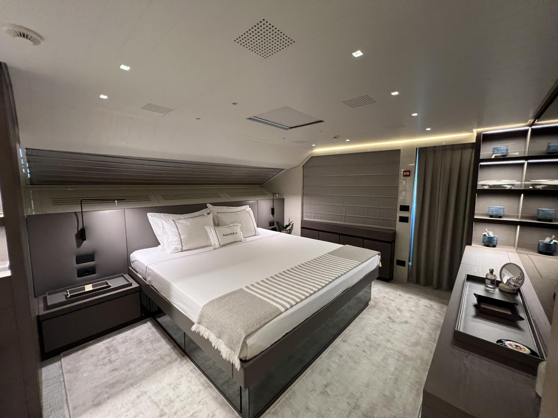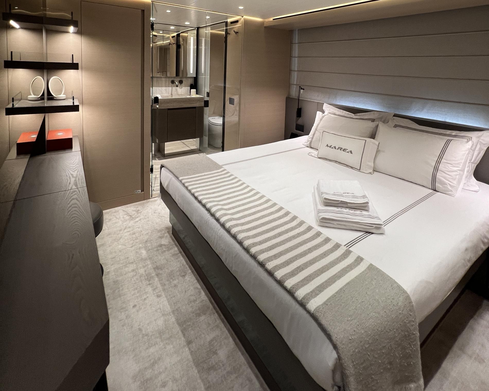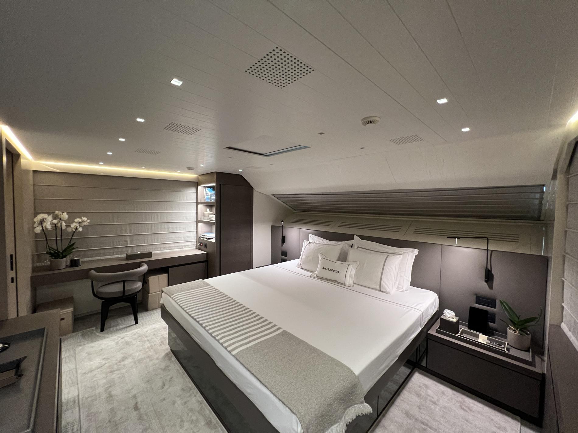 MAREA comfortably hosts ten across five inviting cabins: foremost is an impressive on-deck master suite featuring picture-window views that actually open up wide along with walk-in wardrobe, luxurious bathroom clad in Silk Georgette marble—and immediate access out onto your own private deck retreat. Down below are two plush VIP doubles plus another double room and twin cabin—all en suite—with Santushi carpets underfoot adding subtle comfort.