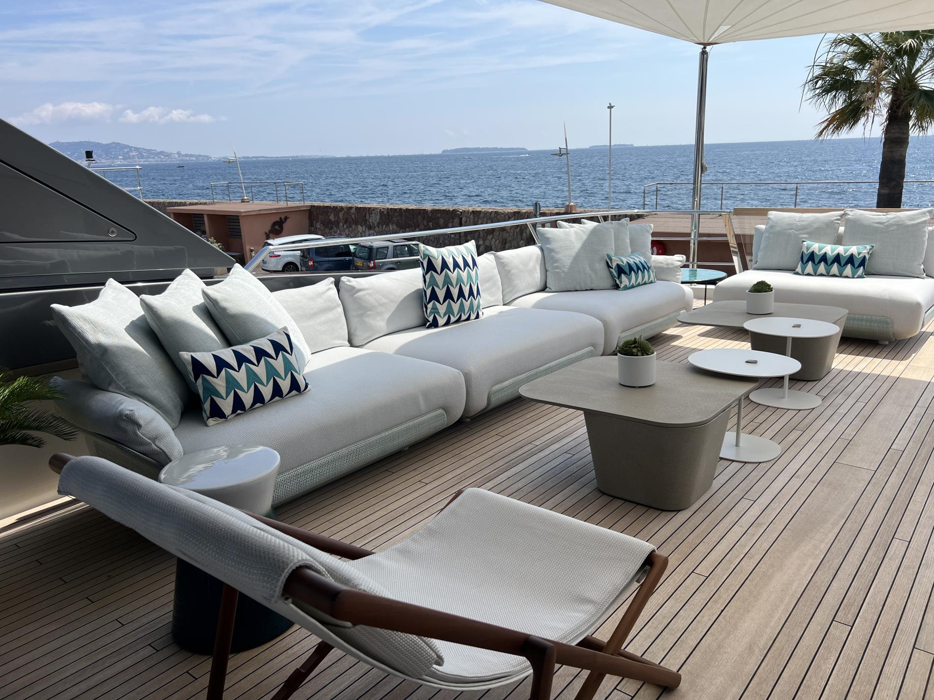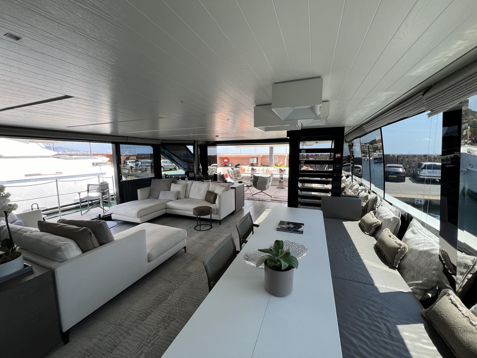 Step inside to see how this innovative configuration truly shines; panoramic windows flood the main salon with light while slide-open balconies bring guests closer to sea breezes. The interior is tastefully modern yet warm—think brushed oak finishes paired with soft natural hues throughout every corner of living space that combines relaxing lounges alongside elegant dining areas.