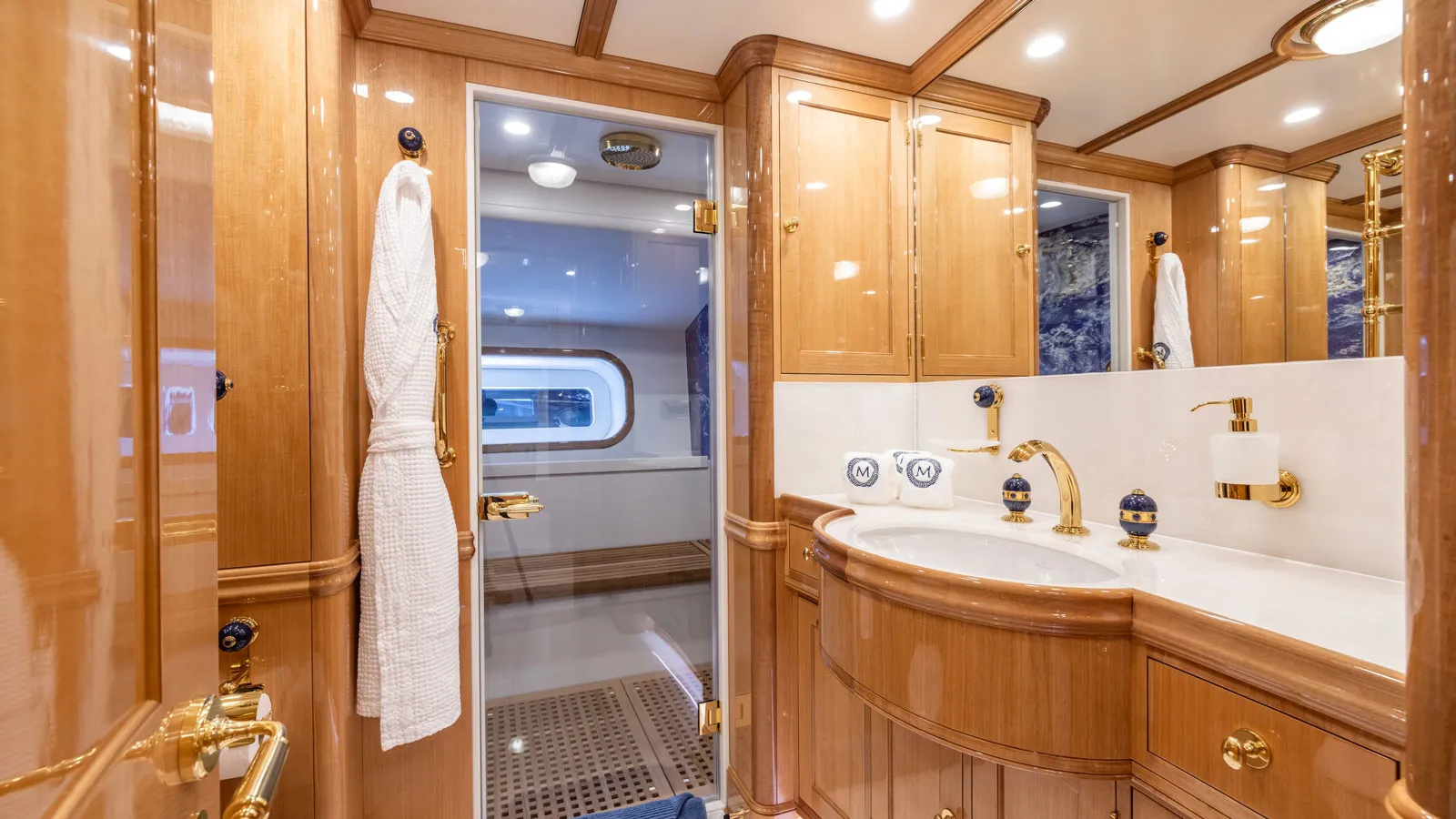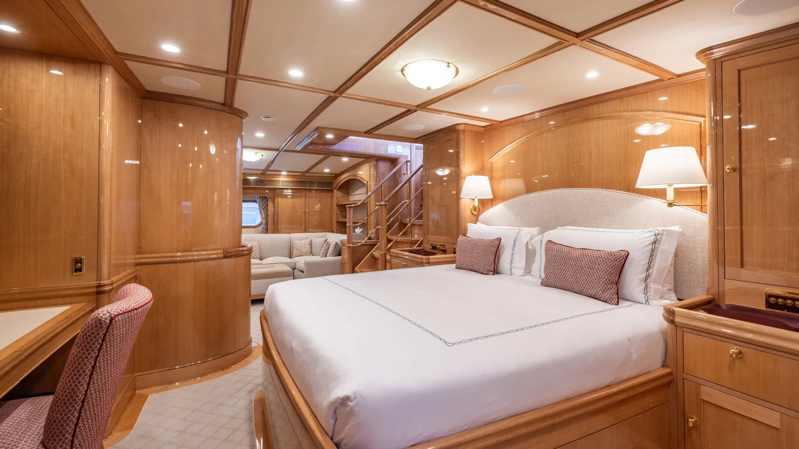 The owner’s private deckhouse and cockpit, located aft, provide direct access to the expansive master suite. This full-beam sanctuary features his-and-hers bathrooms, a jacuzzi bath, and a separate shower. Two additional guest cabins below convert easily between double and twin setups, making MAXIMUS ideal for any charter group.