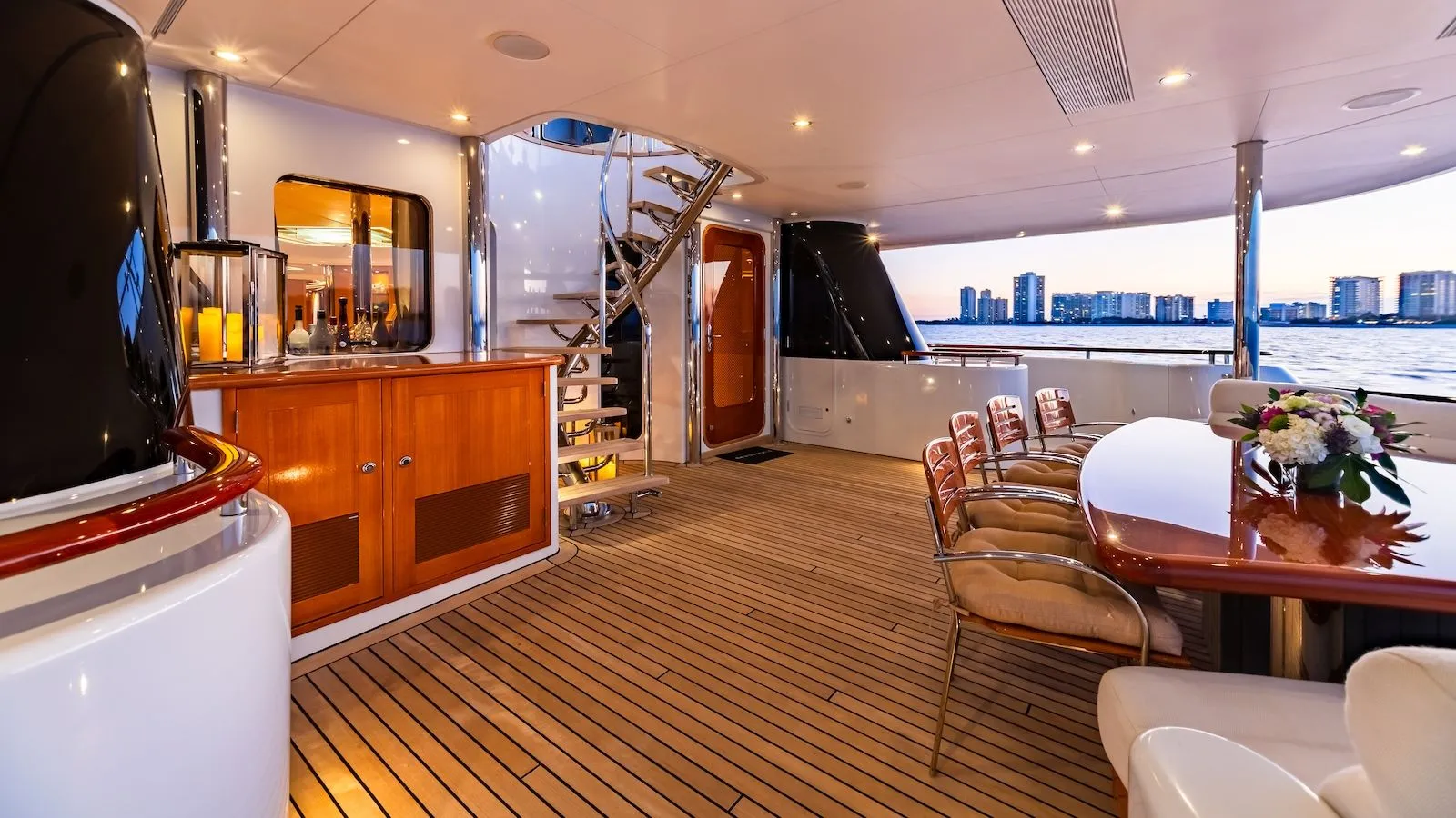 The yacht’s exterior spaces are designed for relaxation and socializing. The cockpit includes a custom hydraulic swim platform and passerelle, while the flybridge offers a raised jacuzzi and multiple seating options. Additional sun loungers on the coach roof create versatile areas for outdoor enjoyment, dining, and panoramic cruising.