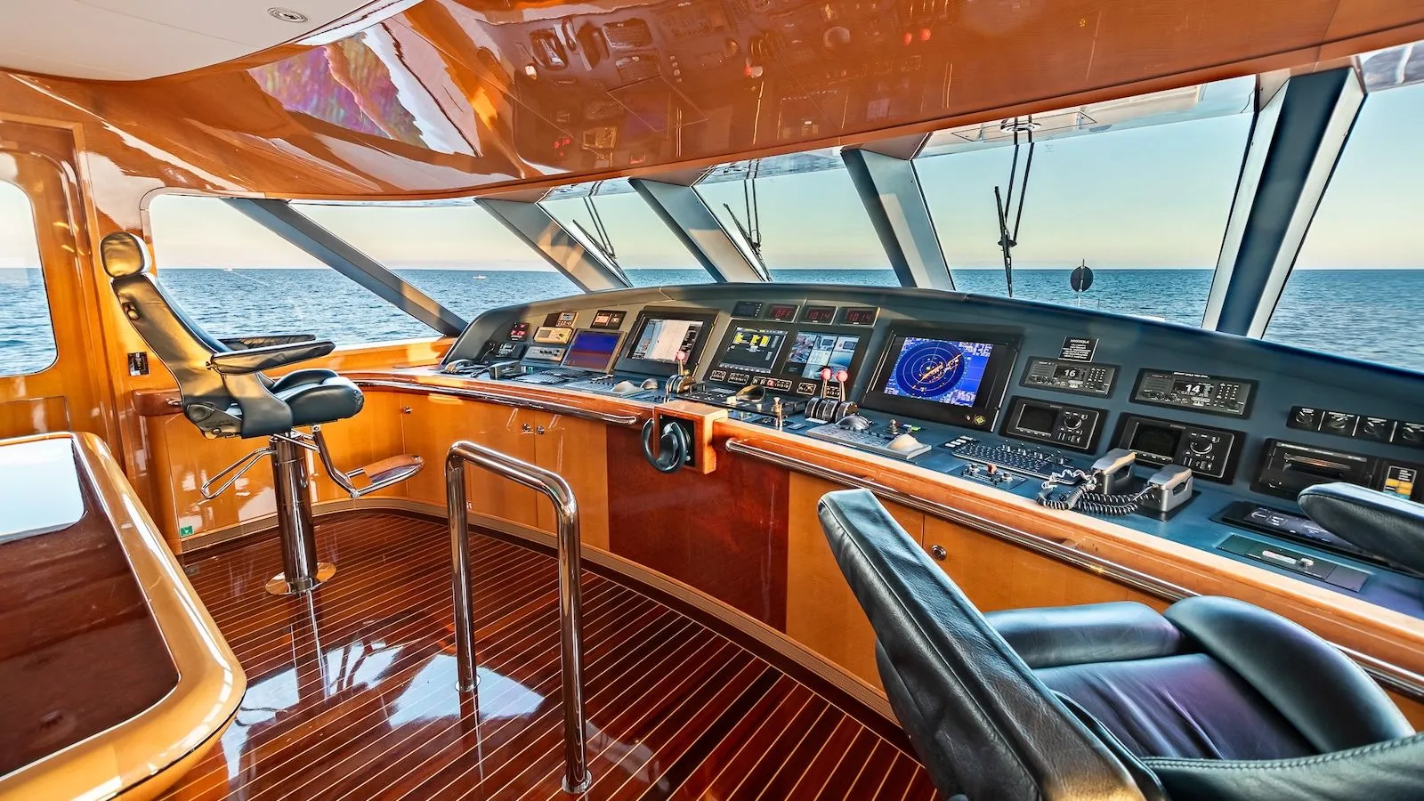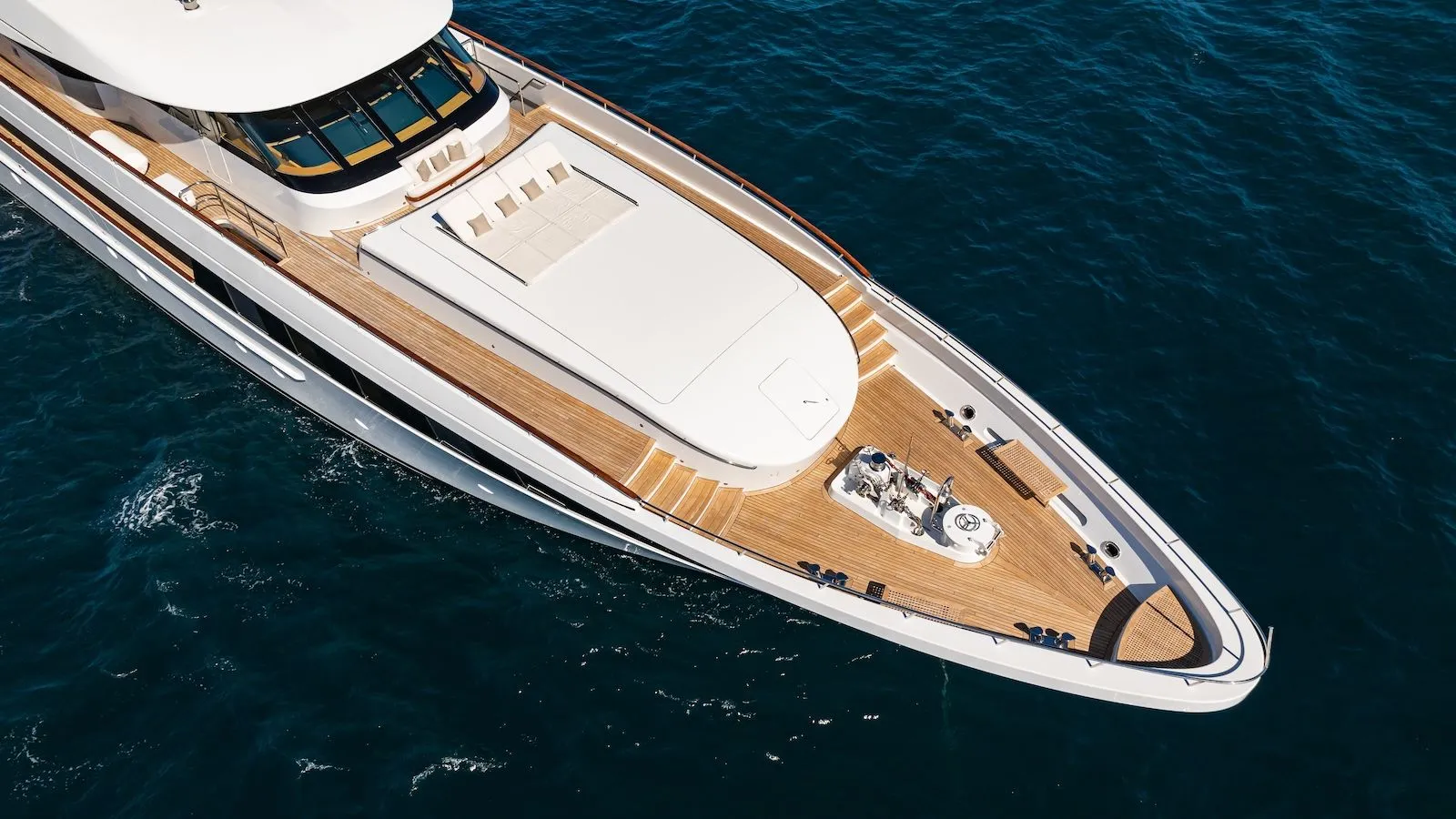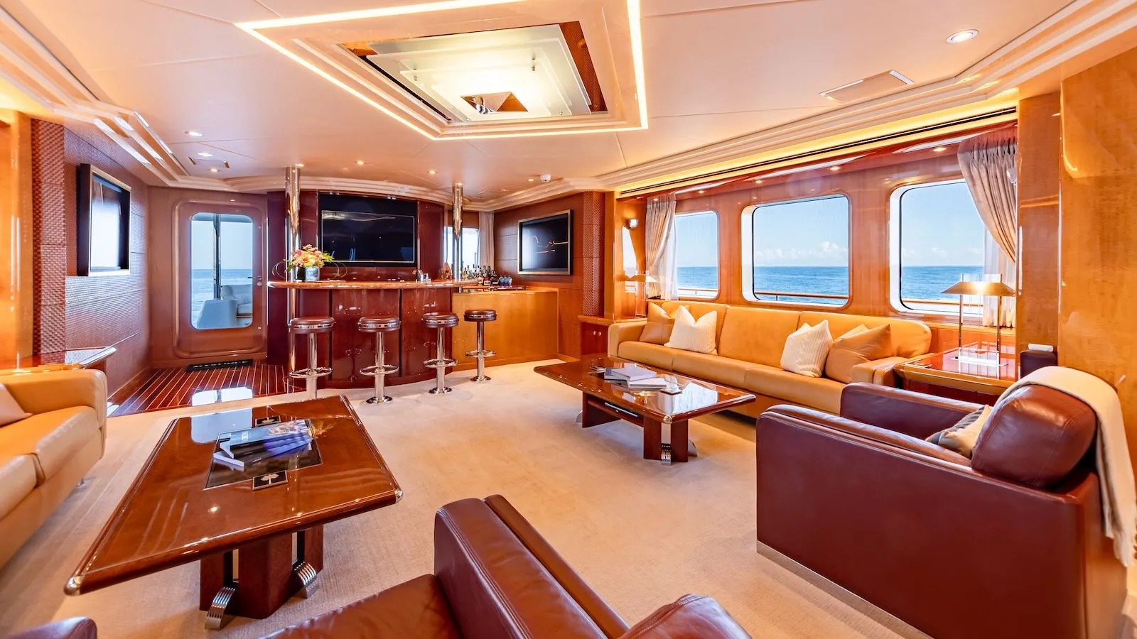 - Flybridge features a raised jacuzzi and five captain’s chairs; four additional chaise loungers on the coach roof