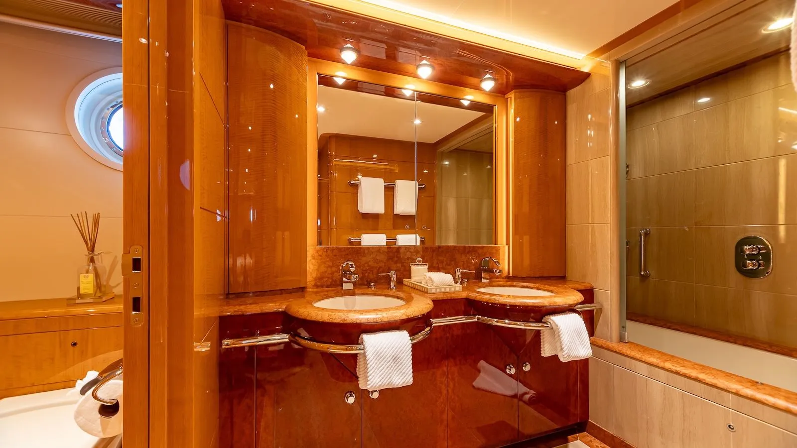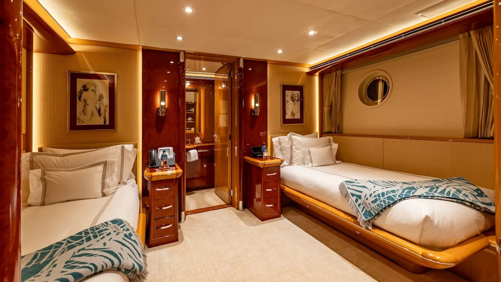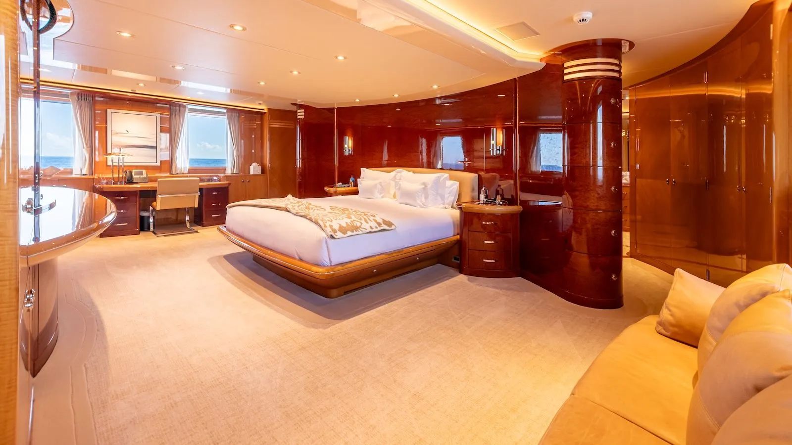 - Five guest cabins, including two full‑beam suites: Owner’s suite (king) on main deck and VIP (queen) below