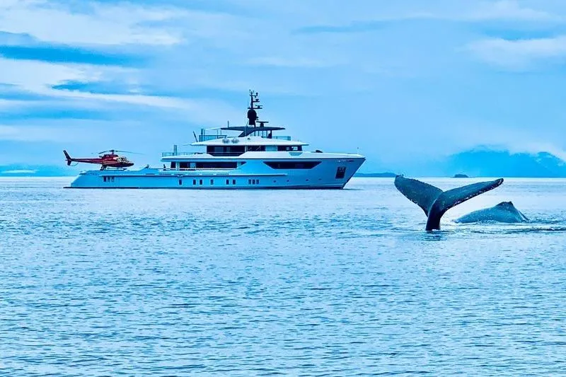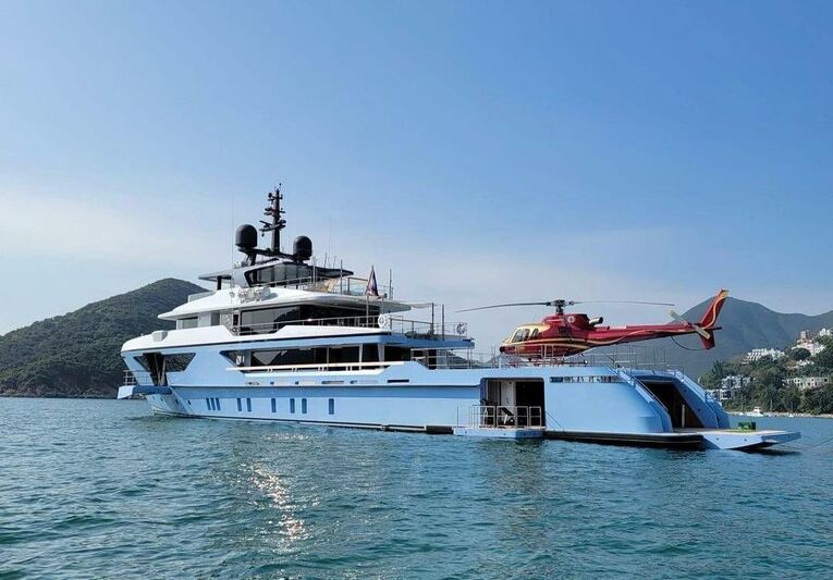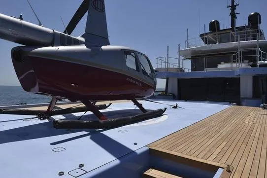 Her extended aft deck accommodates a wide range of water toys and includes an indoor garage for a 5‑metre tender with a dedicated crane. This area converts into a beach club, and the aft deck is reinforced to function as a helicopter deck—previously supporting an Airbus H125 during a documented global voyage.