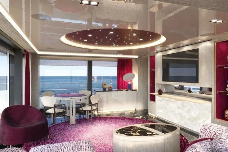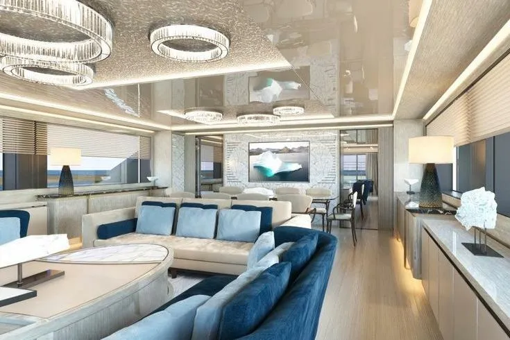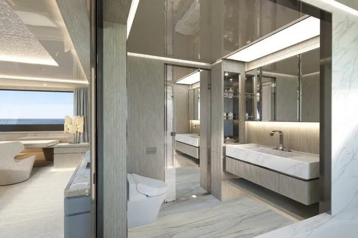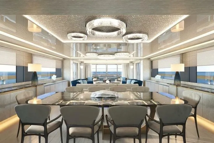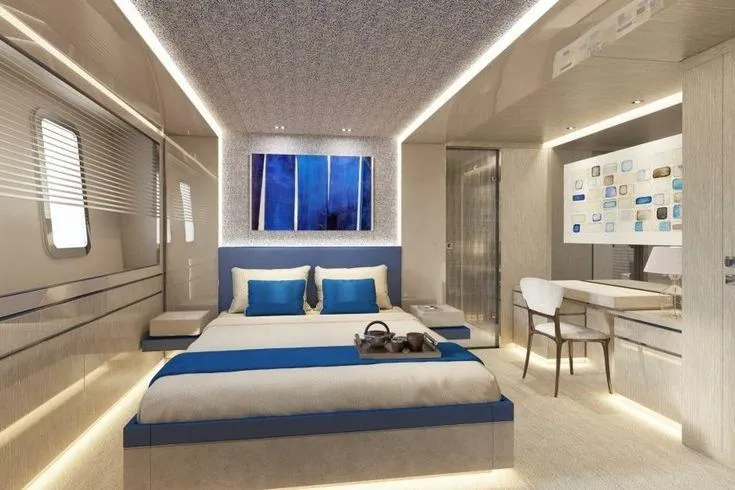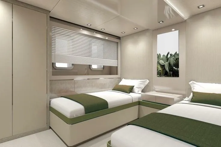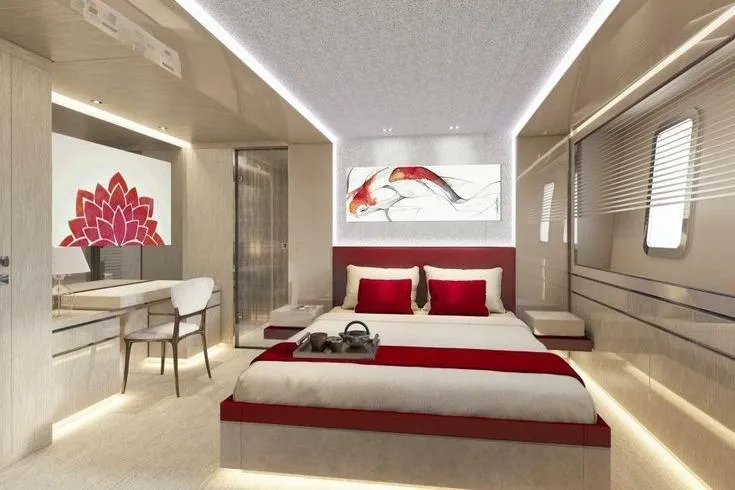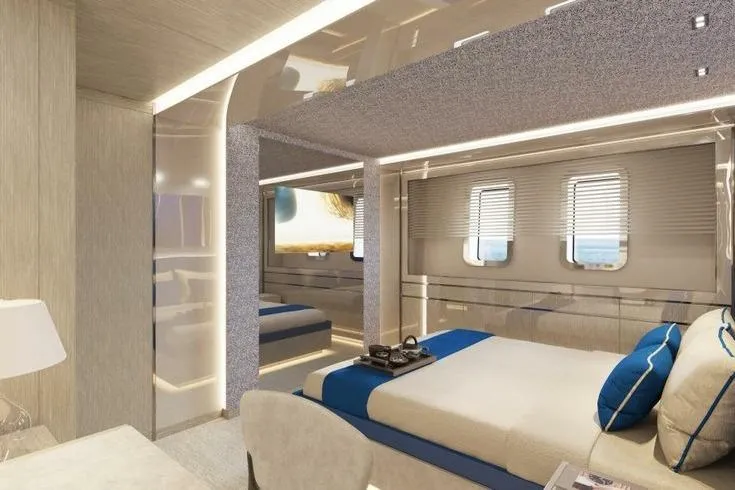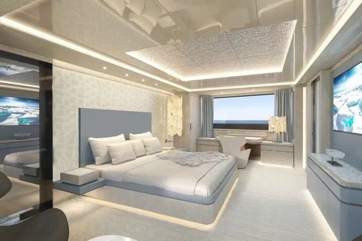 Amenities include a sun deck with an opening glass enclosure, pool, and dining area, as well as a lower‑deck gym and steam shower. The Master suite features an automatic fold‑down balcony. Flexible accommodation options include a concealed staff cabin in the owner’s office, a bridge‑deck saloon convertible into a double cabin, and a guest‑standard nanny cabin on the lower deck sleeping up to four. While officially configured for 12 guests in five cabins with nine crew, the layout can be adapted for up to seven guest cabins and five crew cabins.