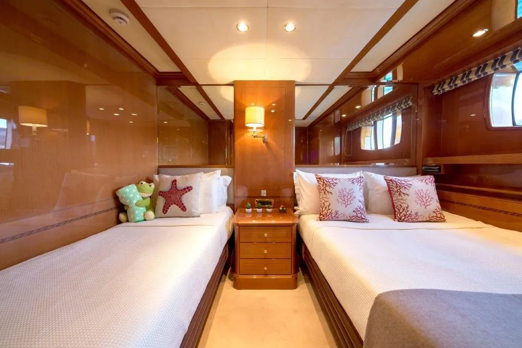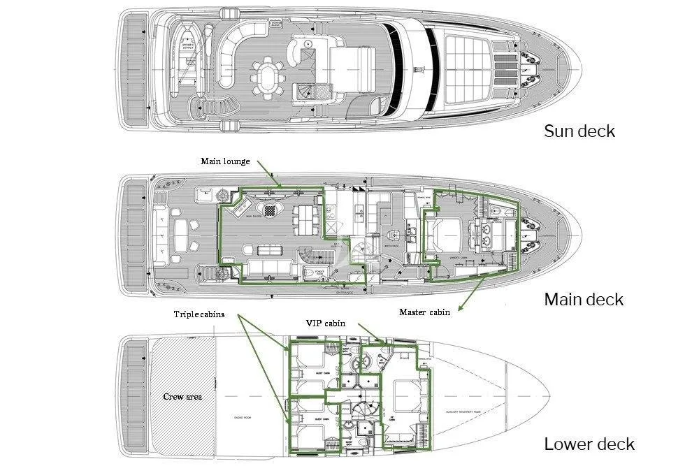 - Main deck master suite plus a full-beam VIP stateroom below