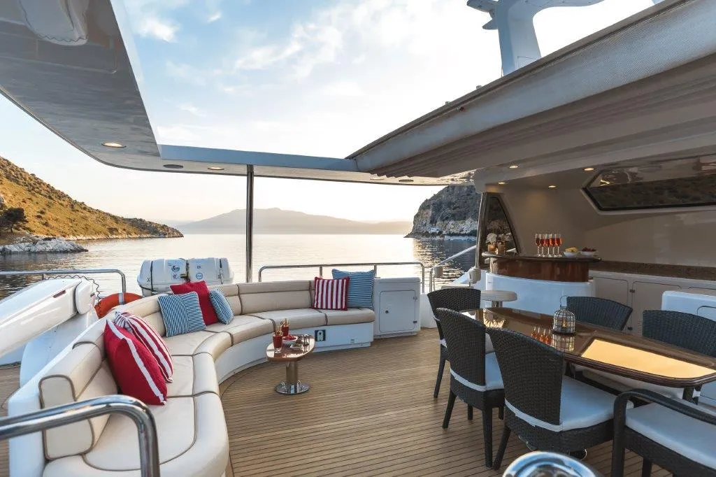 Outdoor living is spread over three decks. Enjoy shaded dining on the aft main deck, private sunbathing on the foredeck, and a lively social scene on the sun deck—complete with built-in seating, a wet bar, and a retractable awning.