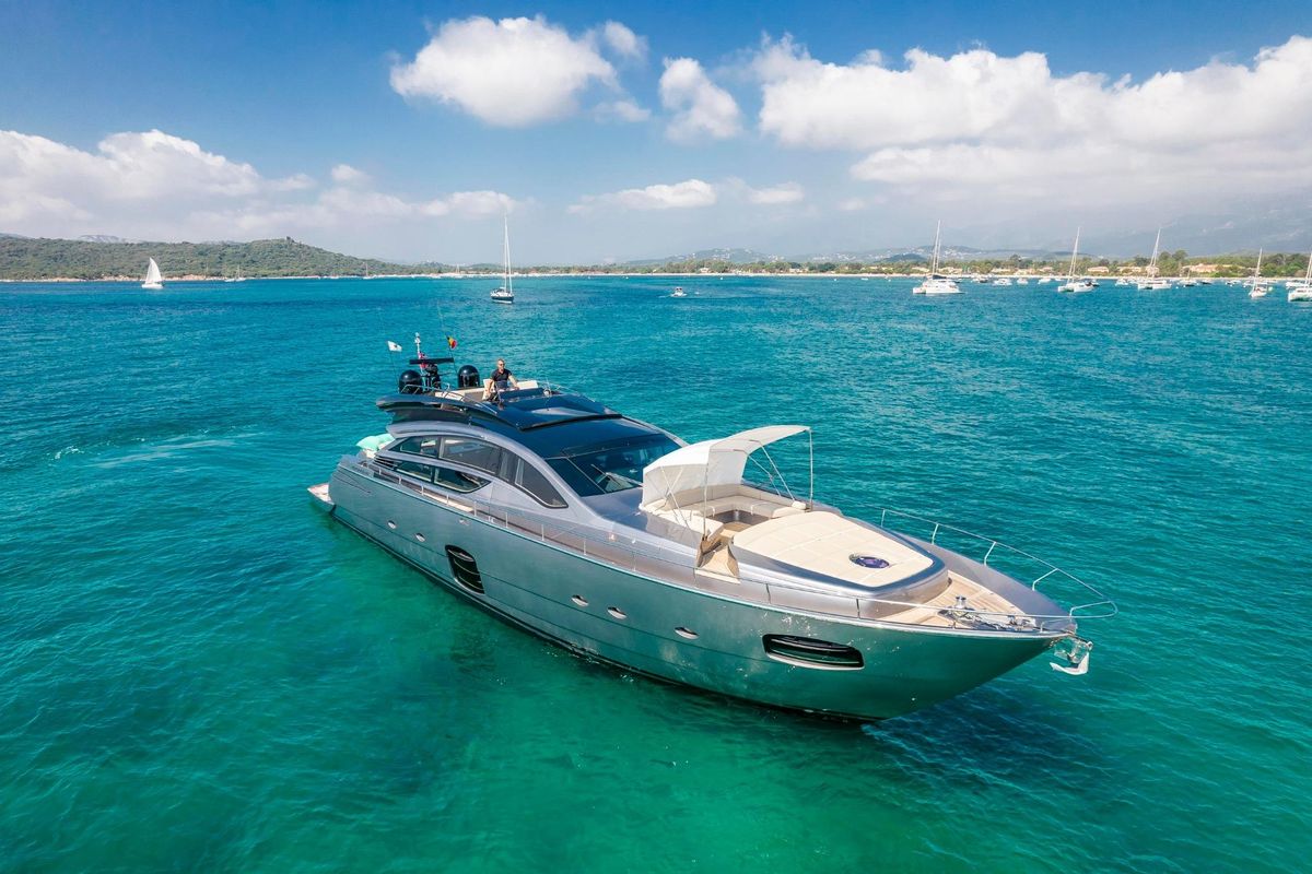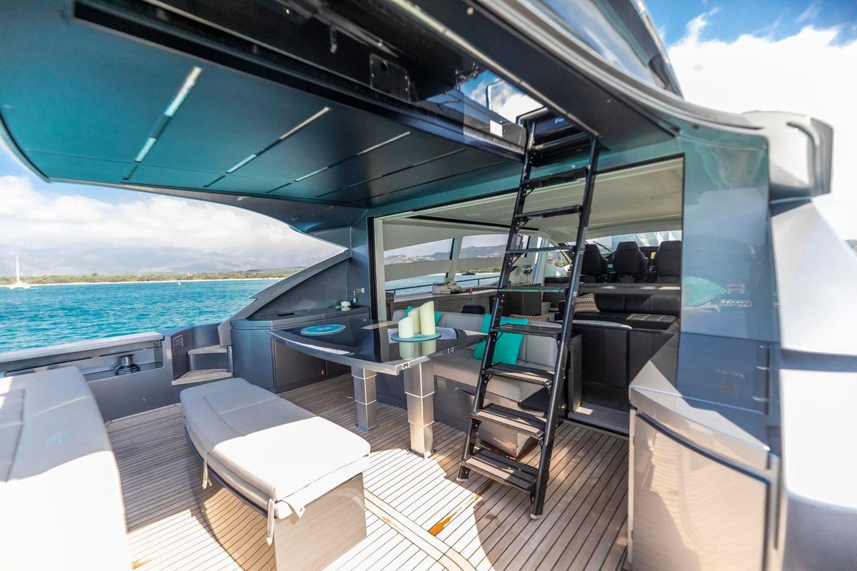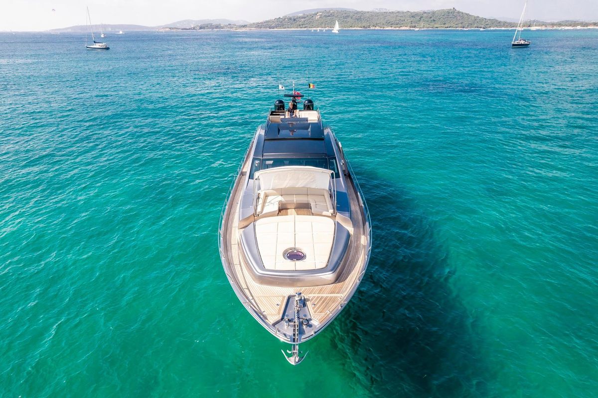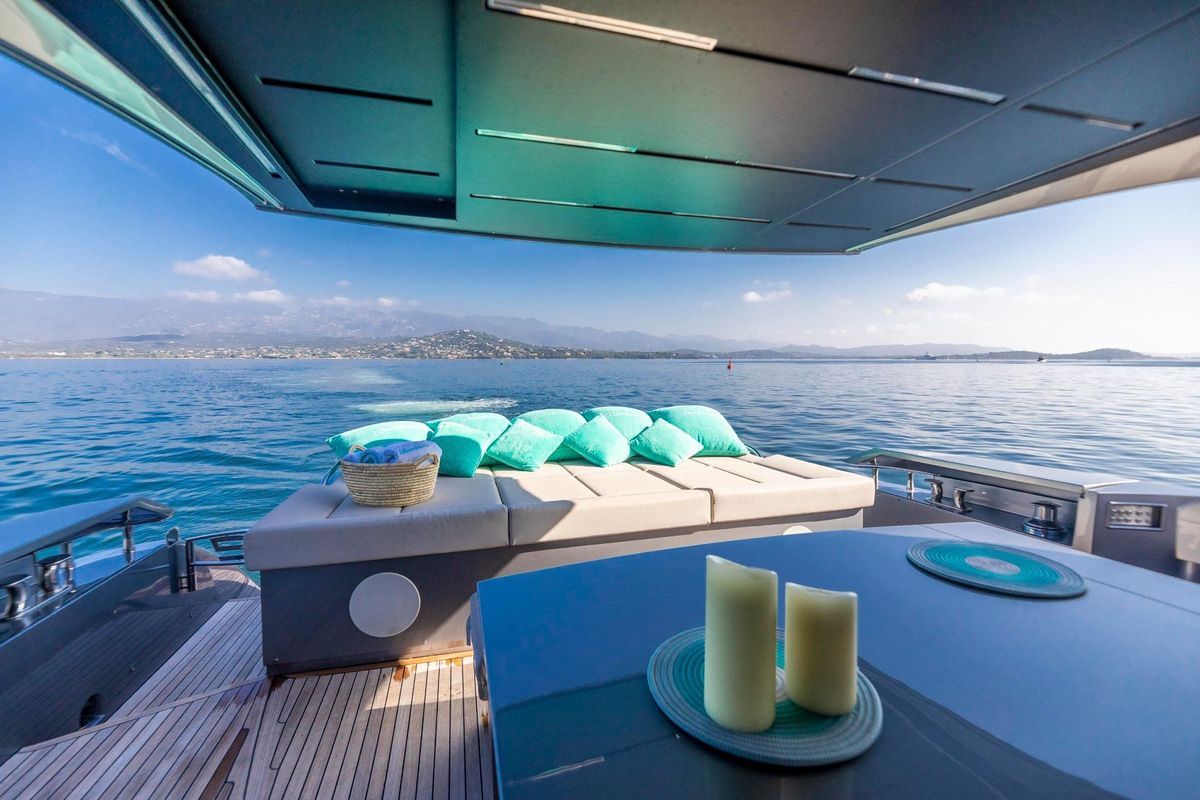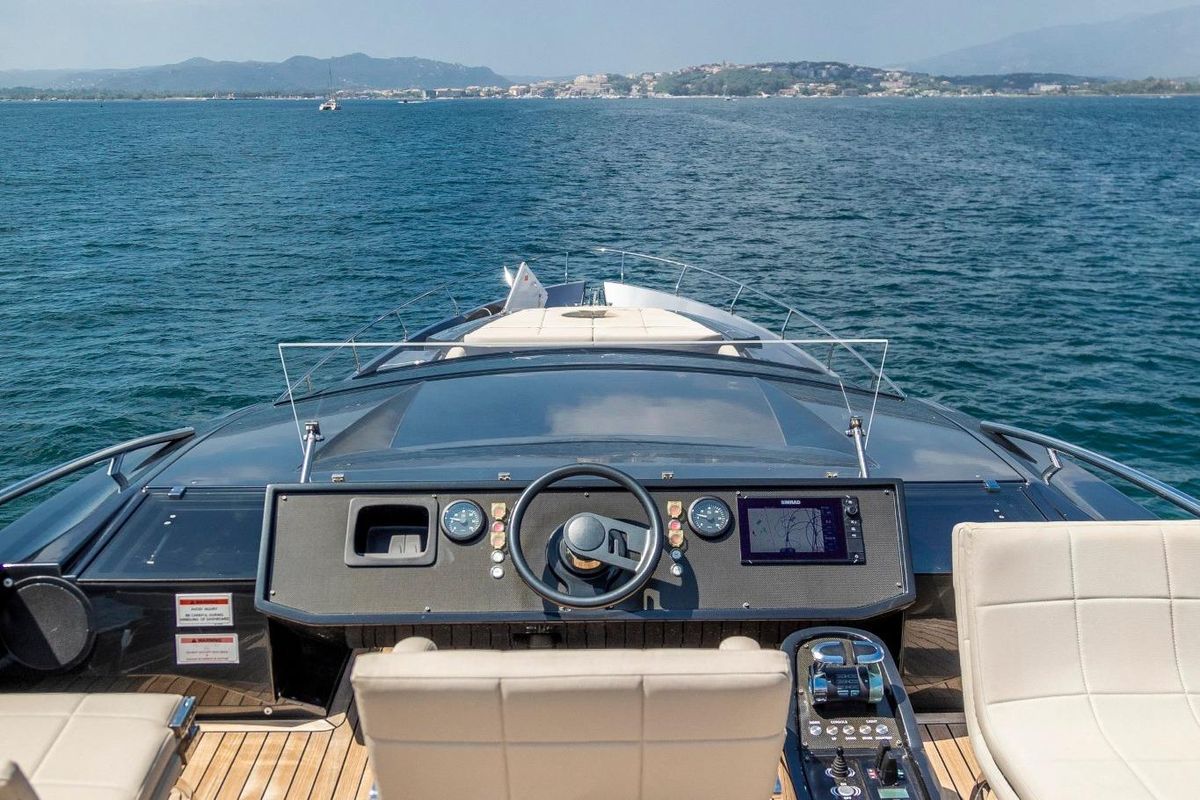 Meticulously maintained by her dedicated crew, she has recently benefited from a full engine service, fresh antifouling, and new batteries. Her metallic grey hull, anthracite roof, and retractable hardtop showcase a sporty yet refined look.