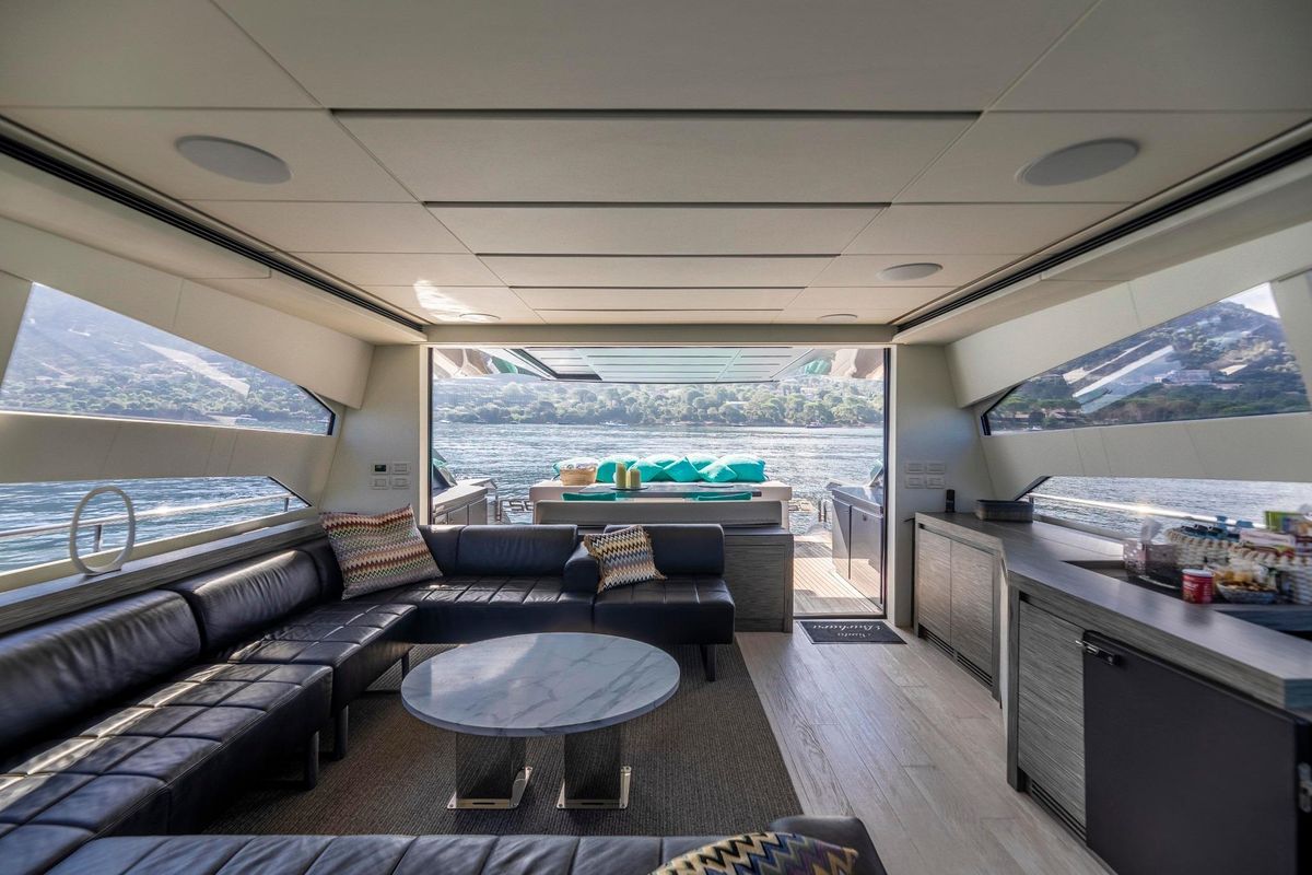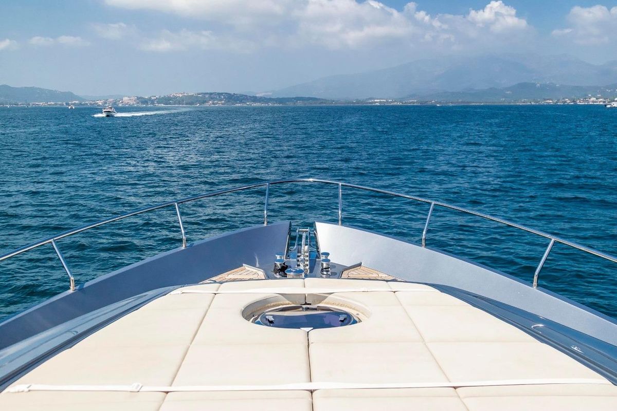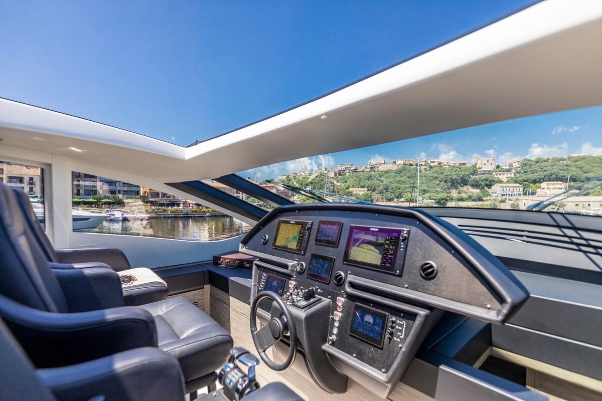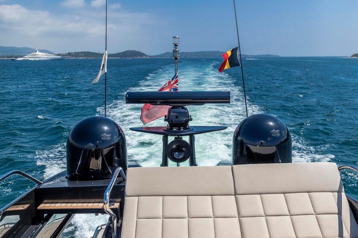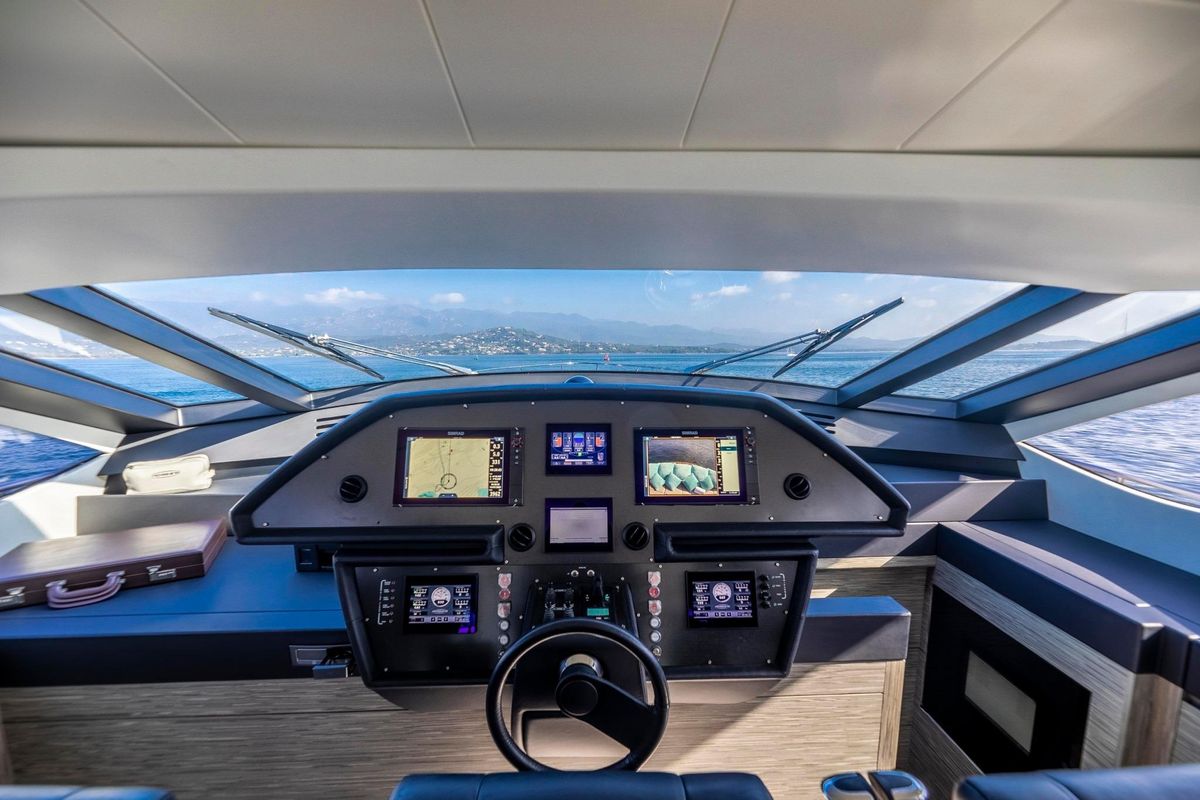 Meticulously maintained by her dedicated crew, she has recently benefited from a full engine service, fresh antifouling, and new batteries. Her metallic grey hull, anthracite roof, and retractable hardtop showcase a sporty yet refined look.