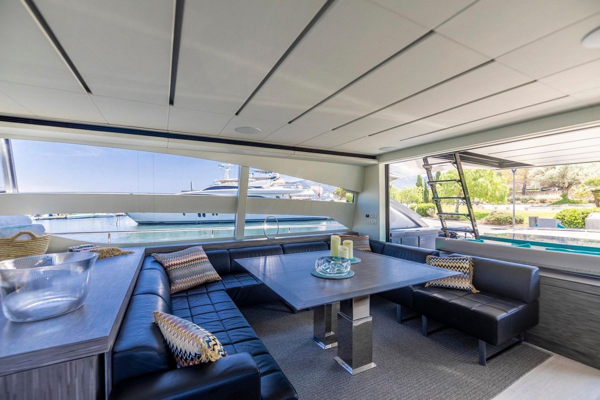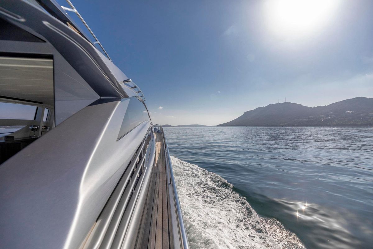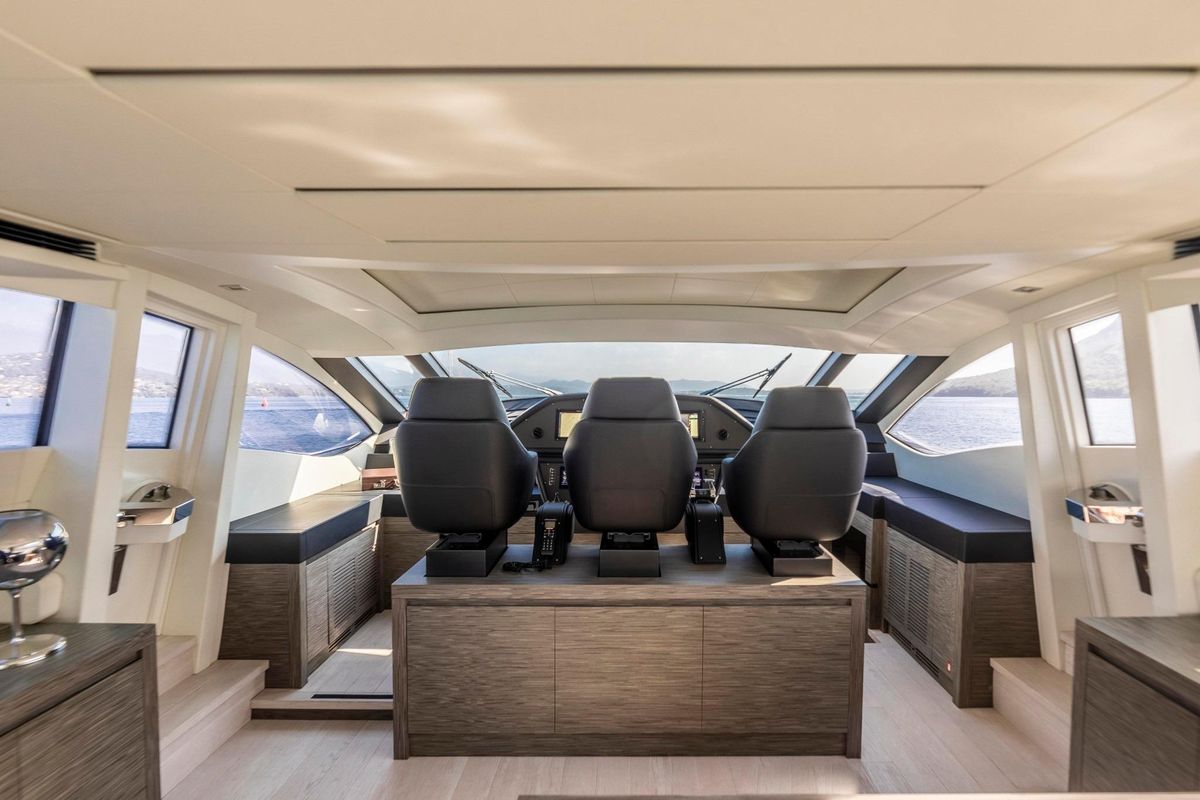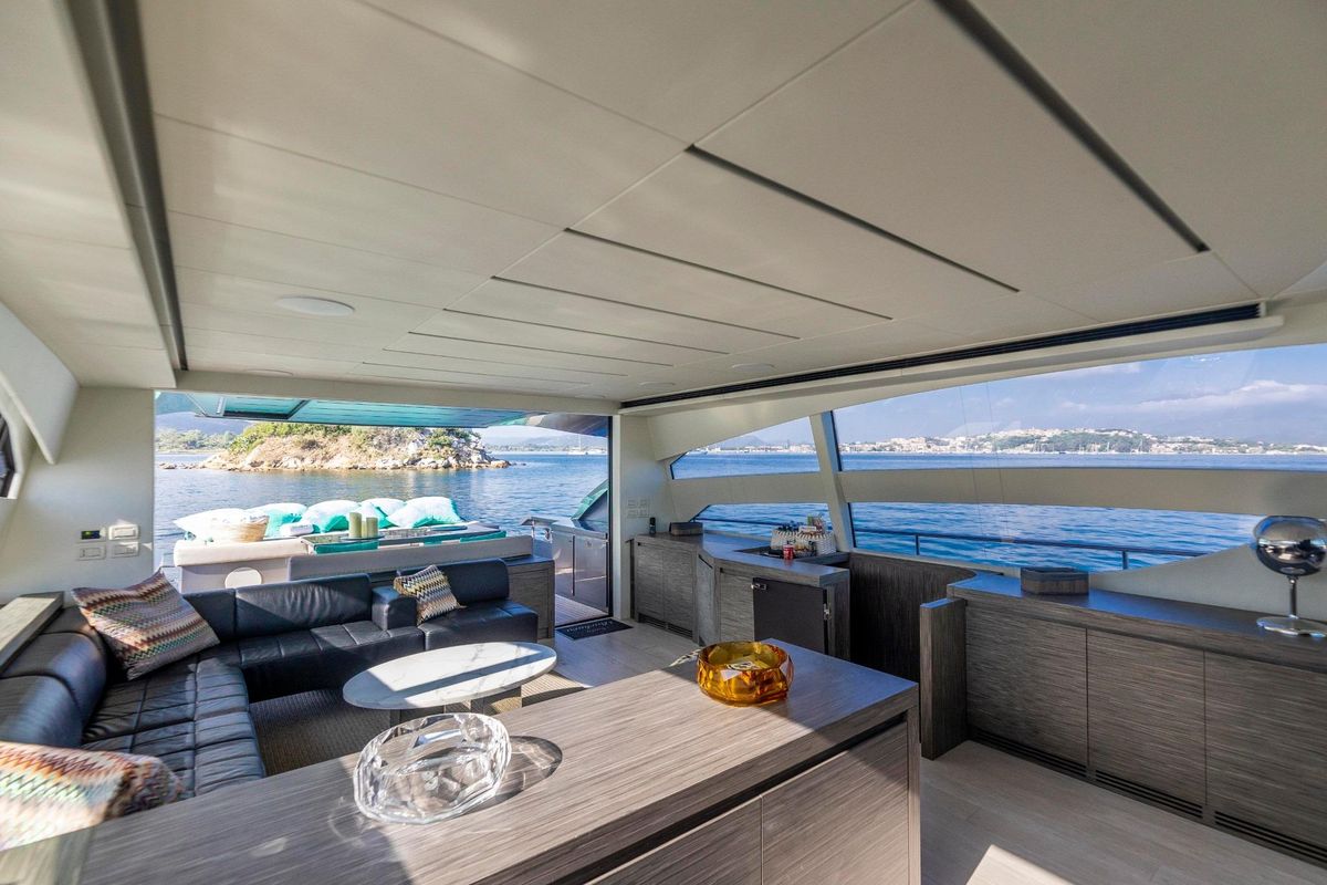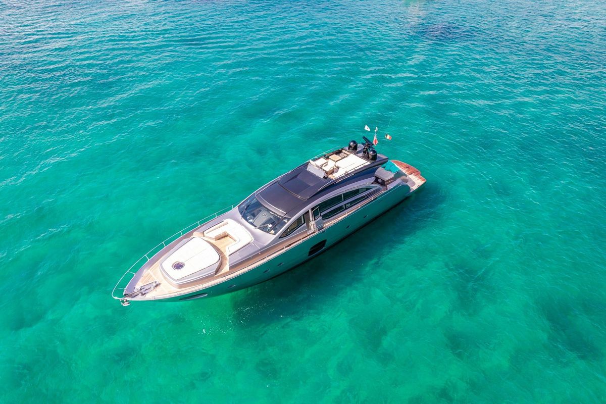 Meticulously maintained by her dedicated crew, she has recently benefited from a full engine service, fresh antifouling, and new batteries. Her metallic grey hull, anthracite roof, and retractable hardtop showcase a sporty yet refined look.