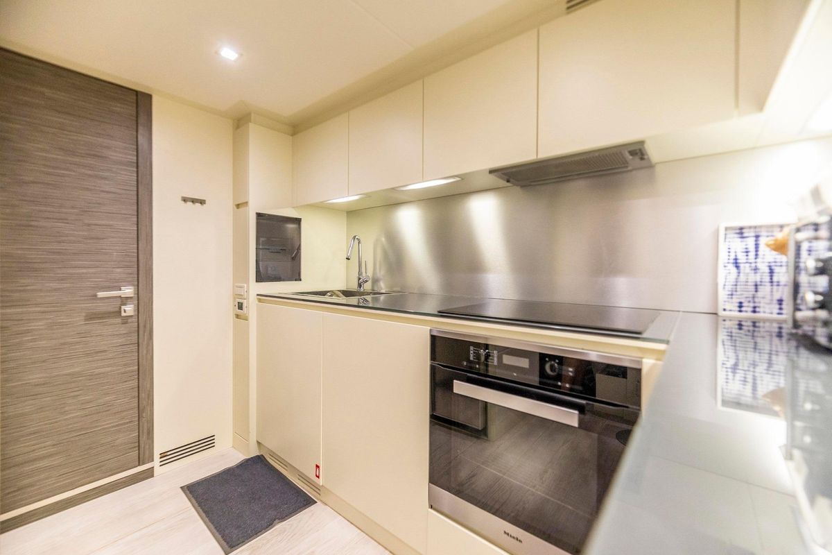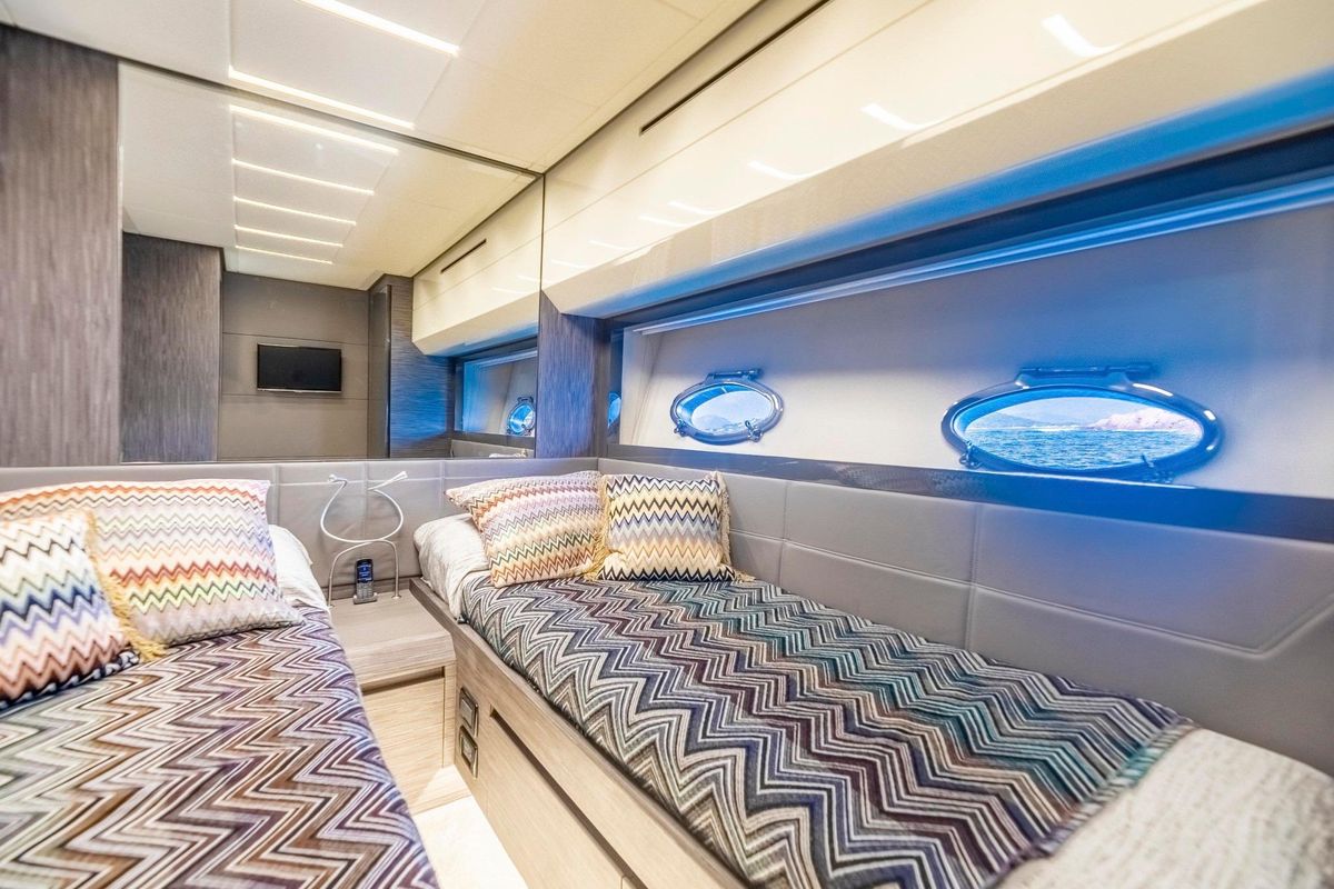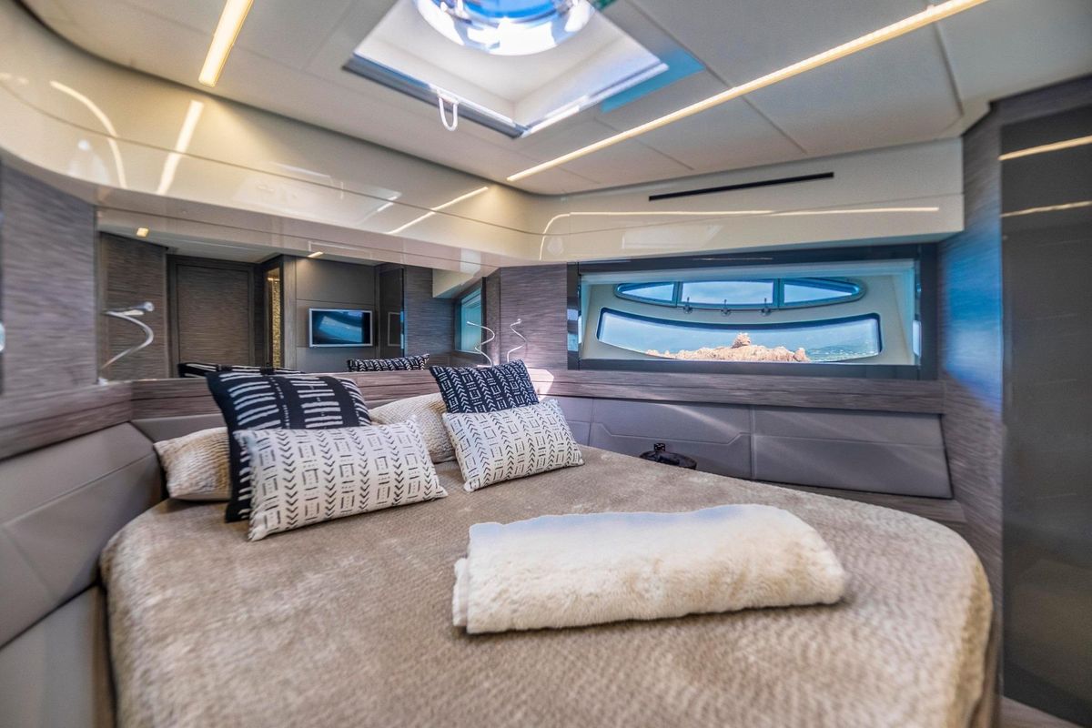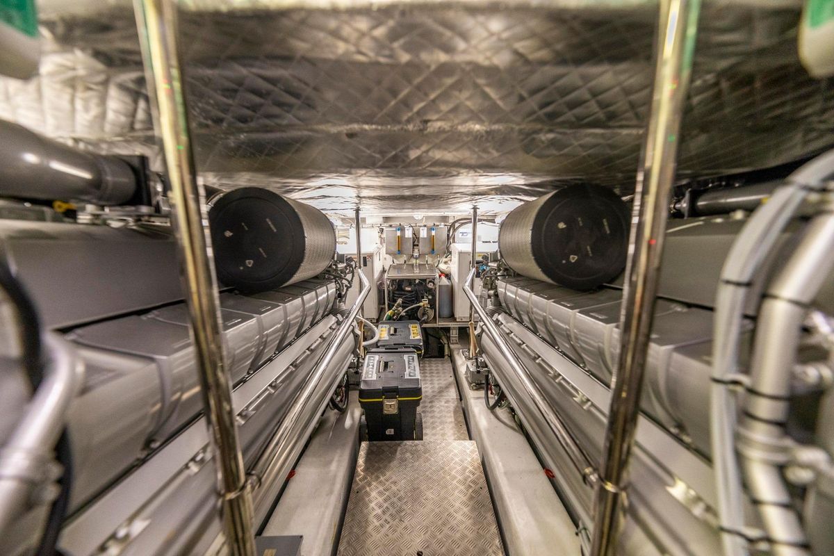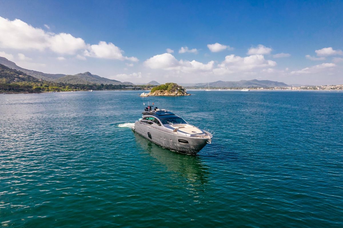 Meticulously maintained by her dedicated crew, she has recently benefited from a full engine service, fresh antifouling, and new batteries. Her metallic grey hull, anthracite roof, and retractable hardtop showcase a sporty yet refined look.