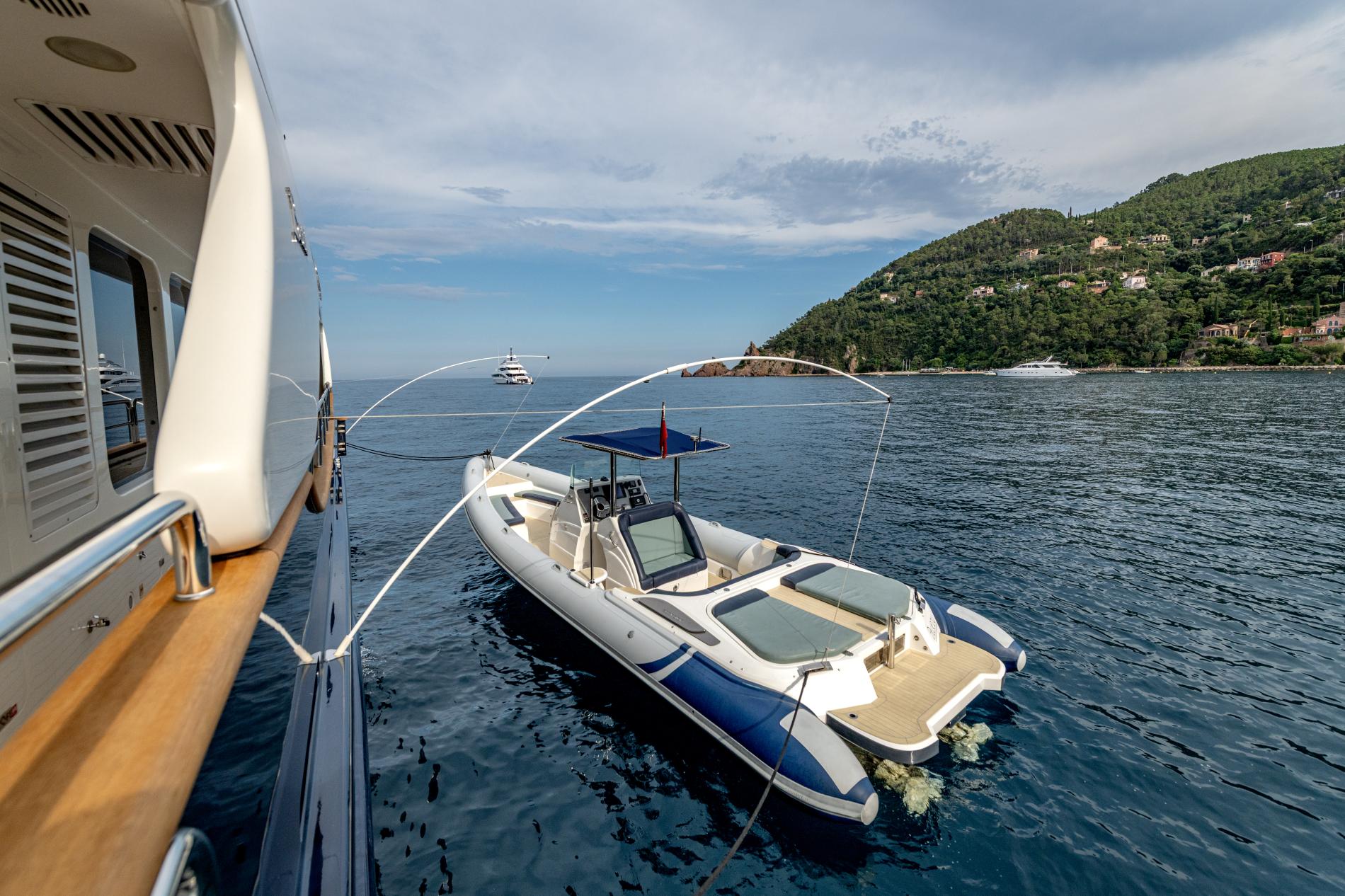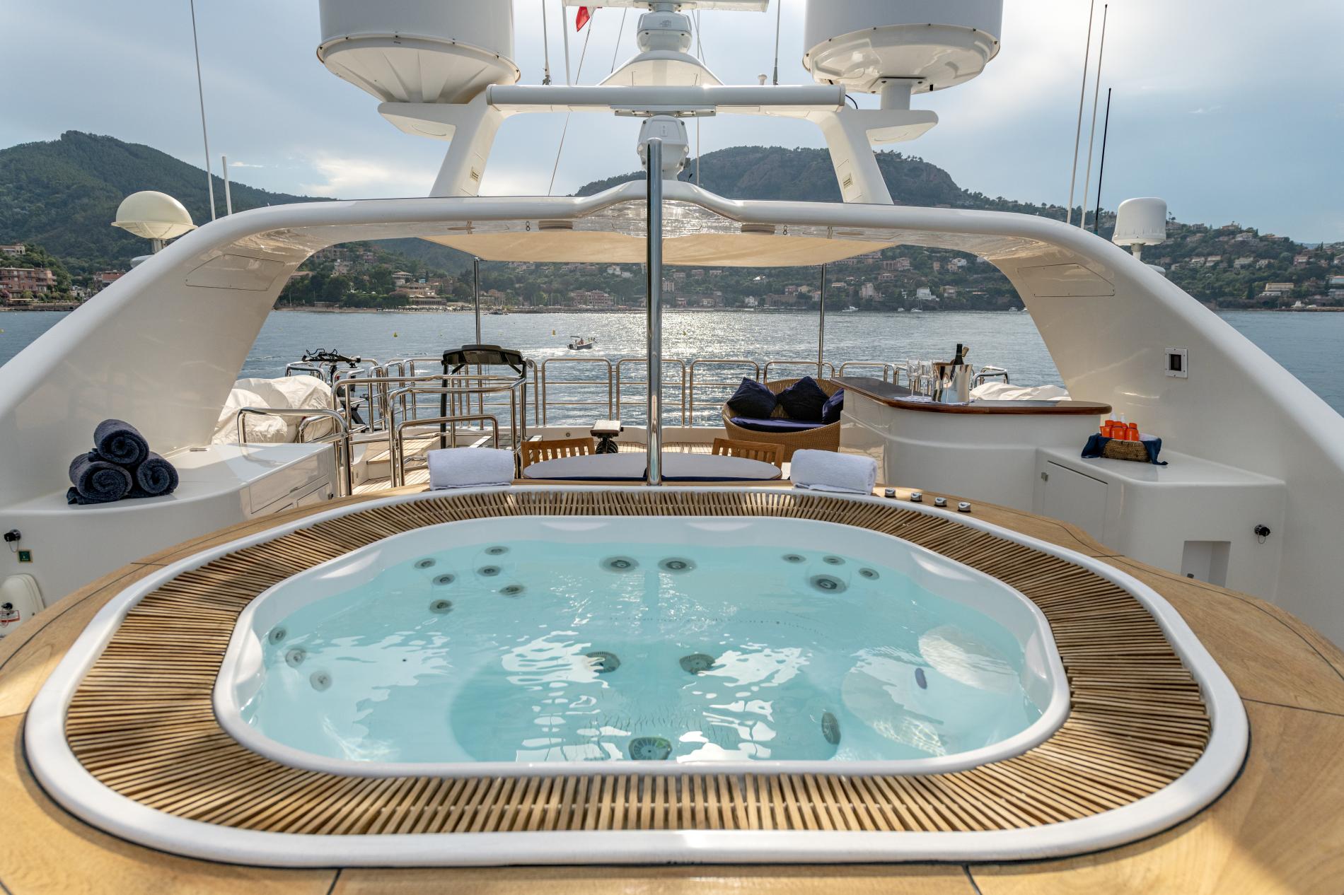 Life on deck is all about comfort and versatility. Three spacious levels invite relaxation and entertaining. The sundeck is a highlight, featuring a raised Jacuzzi surrounded by sun pads, a high-lo table, and ample space for loungers or gym equipment. On the upper deck, a circular dining table provides a sophisticated spot for al fresco meals, complemented by a shaded lounge. The main deck aft tucks in another outdoor dining area, while the hydraulic transom door drops down to create a generous swim platform—perfect for water toys, swimming, and easy tender access. Just inside, the garage stores a tender and watersports gear.