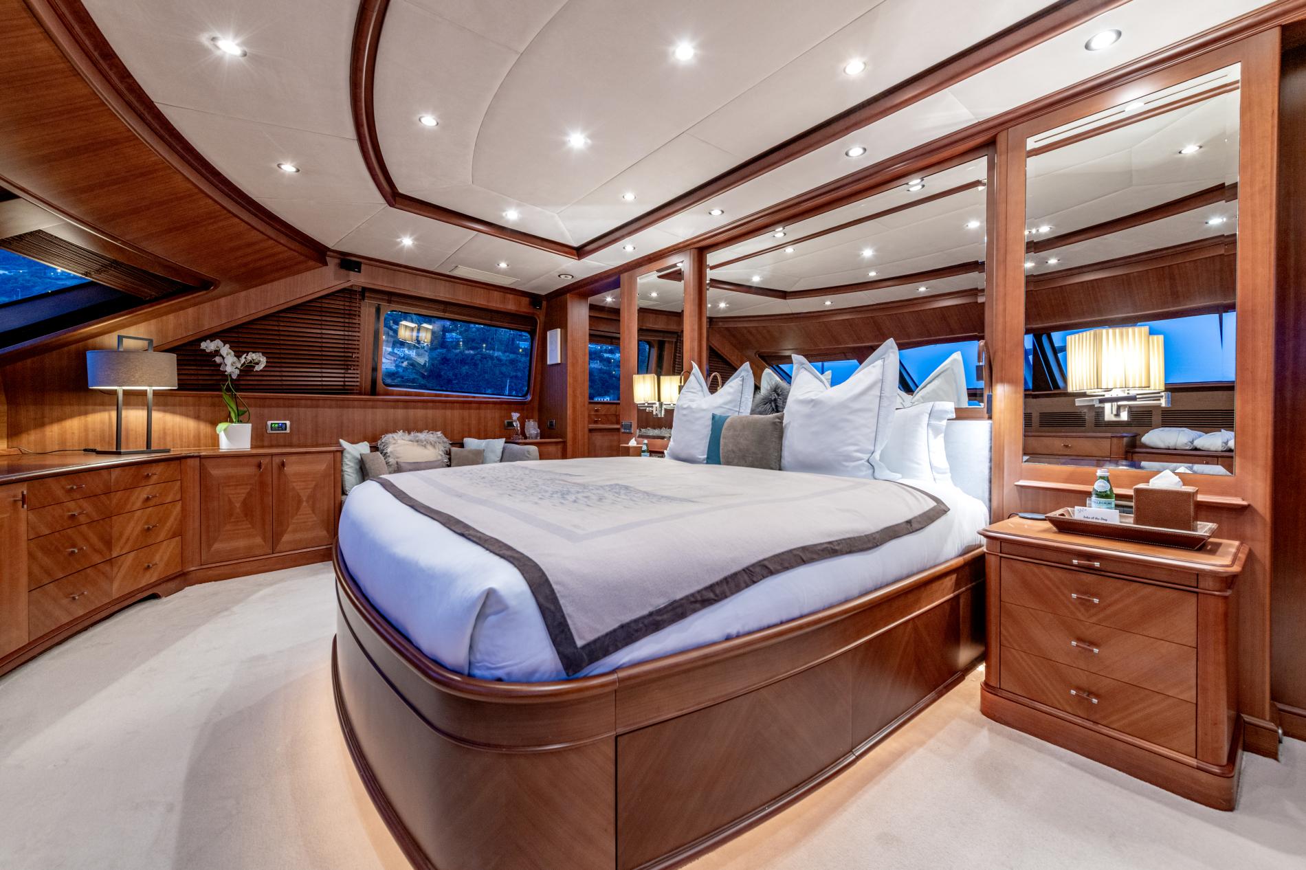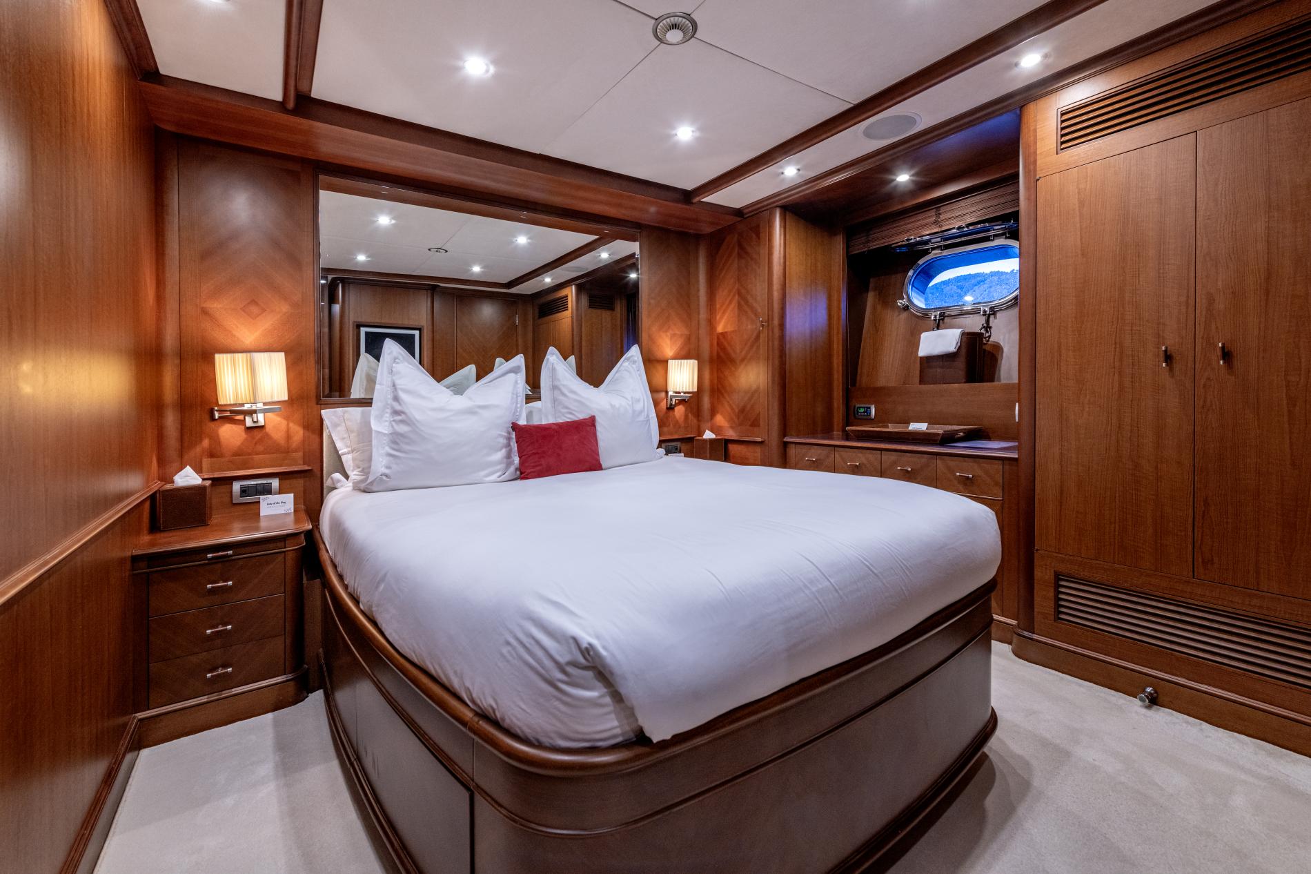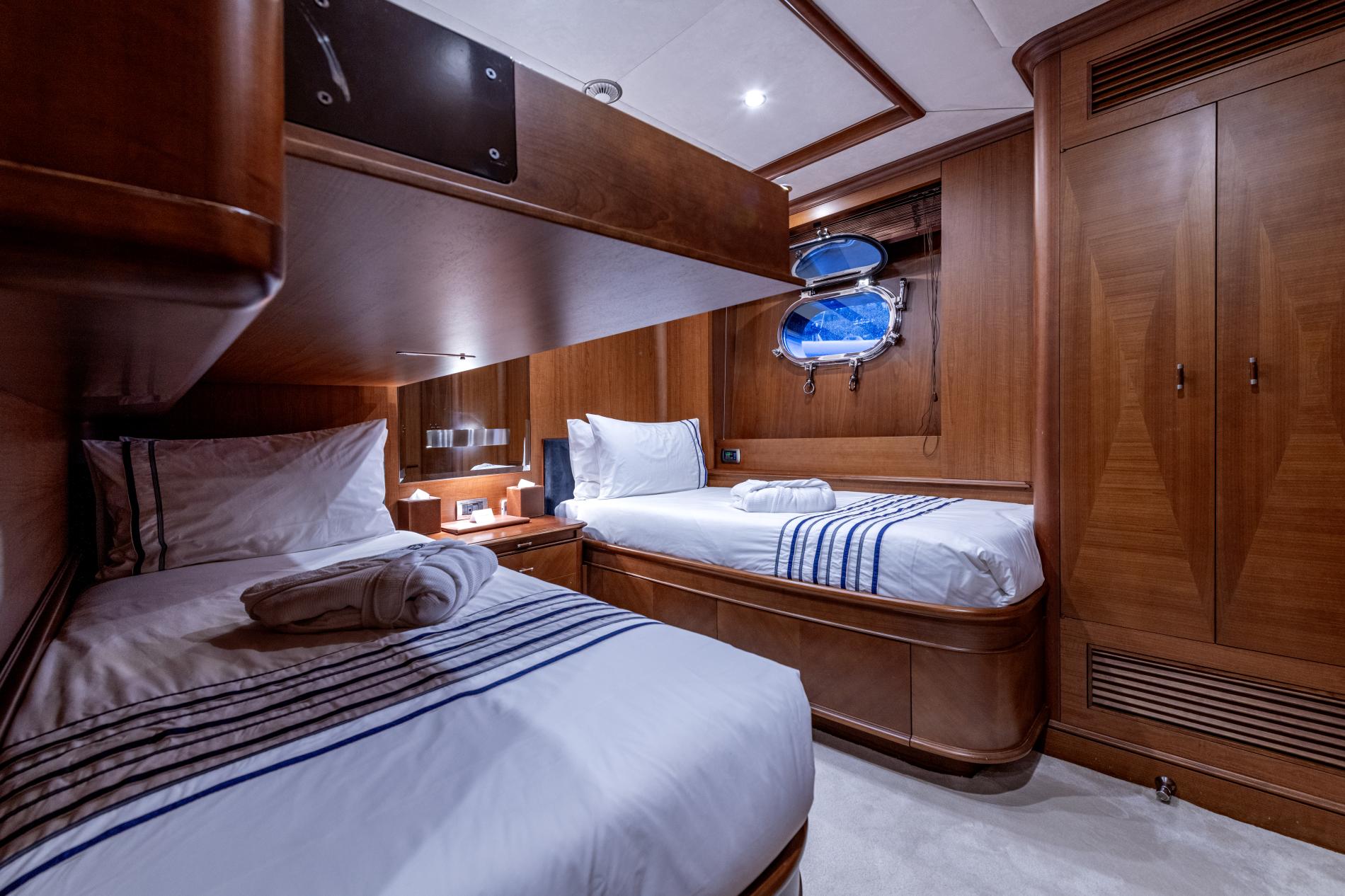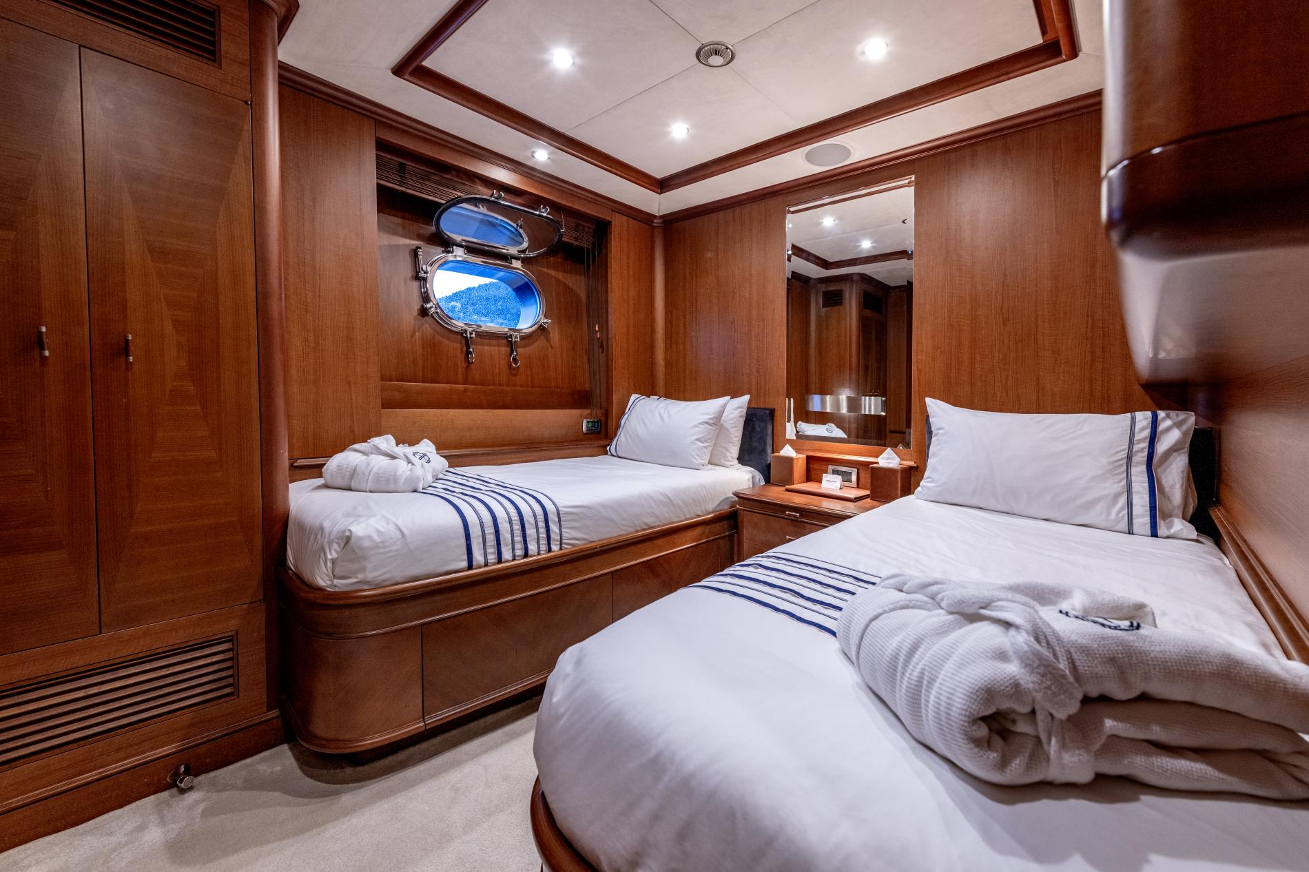 Sea BlueZ accommodates up to 10 guests in five en suite cabins. The main deck master suite faces forward and features a pop-up television, steam shower, and walk-in wardrobe. Two VIP cabins and two twins (one with a Pullman berth) are located on the lower deck.