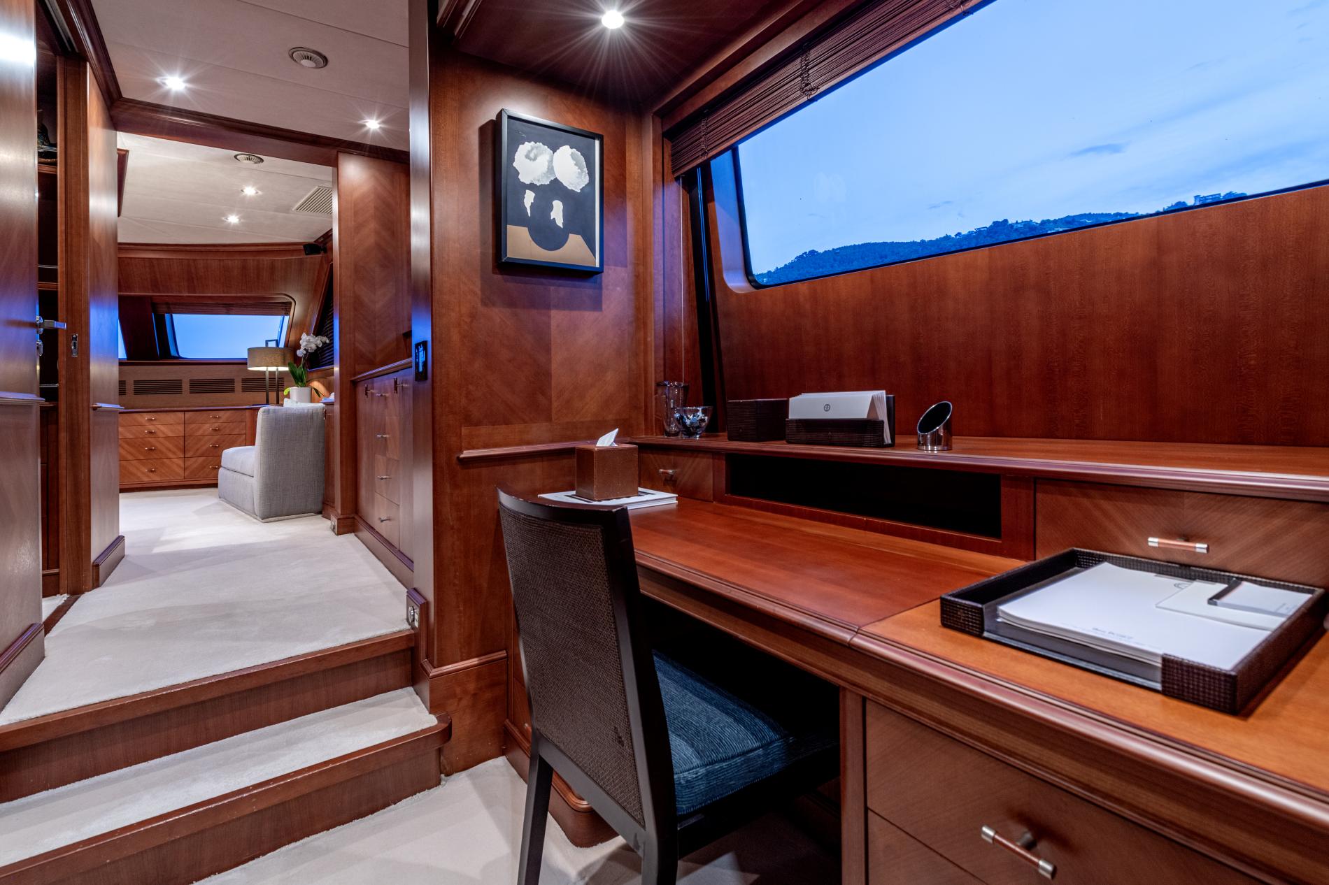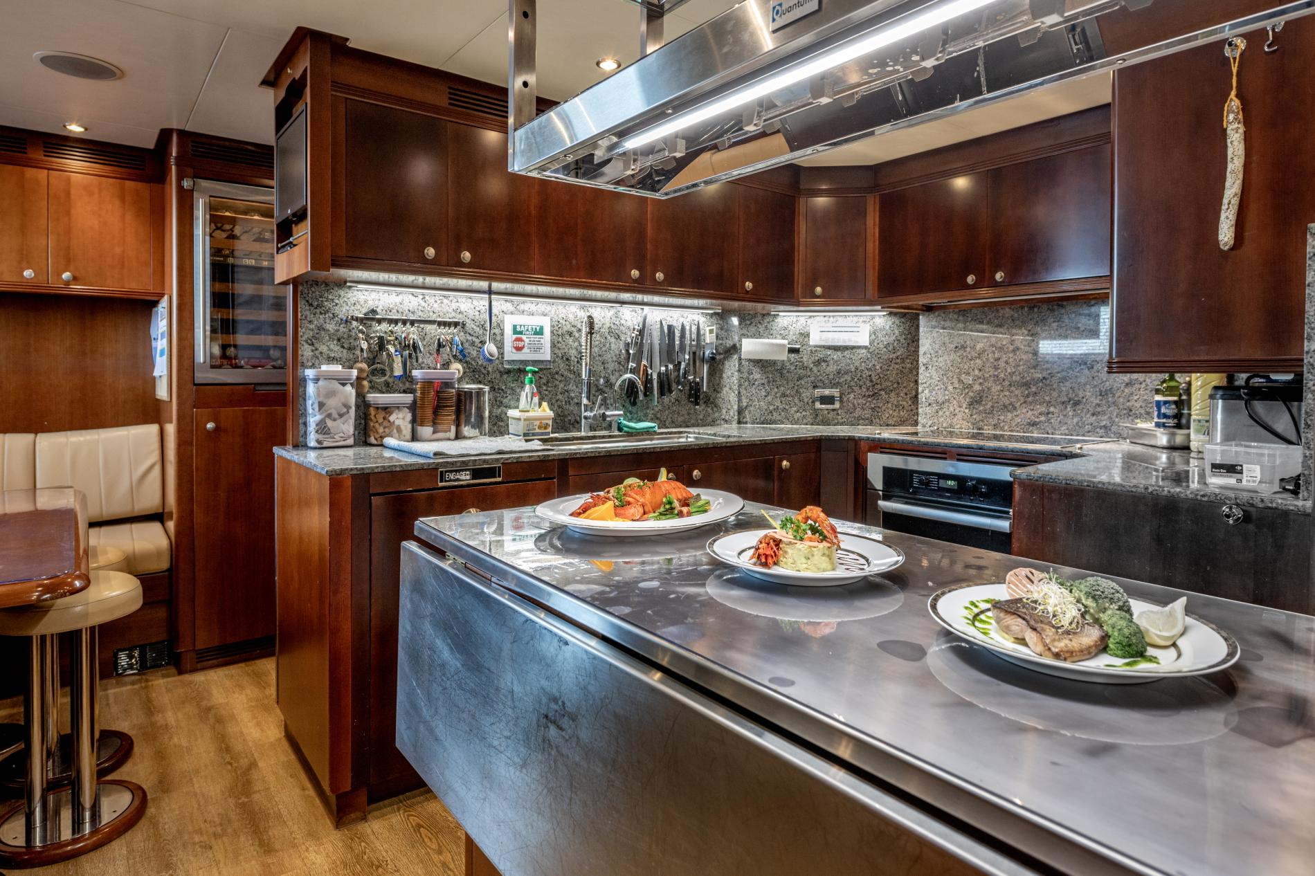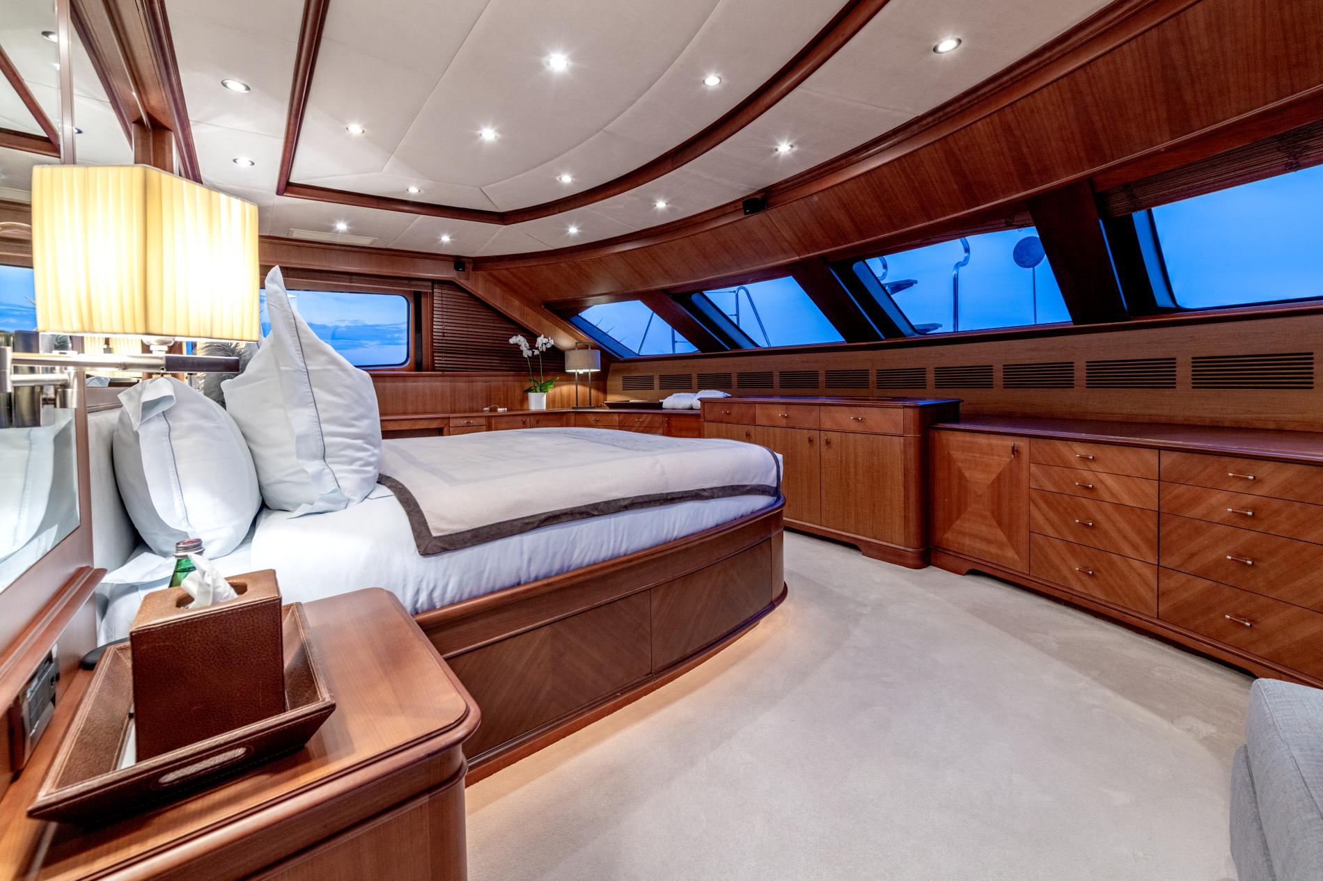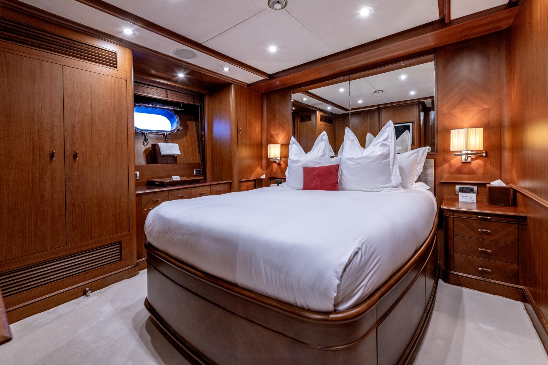 Sea BlueZ accommodates up to 10 guests in five en suite cabins. The main deck master suite faces forward and features a pop-up television, steam shower, and walk-in wardrobe. Two VIP cabins and two twins (one with a Pullman berth) are located on the lower deck.
