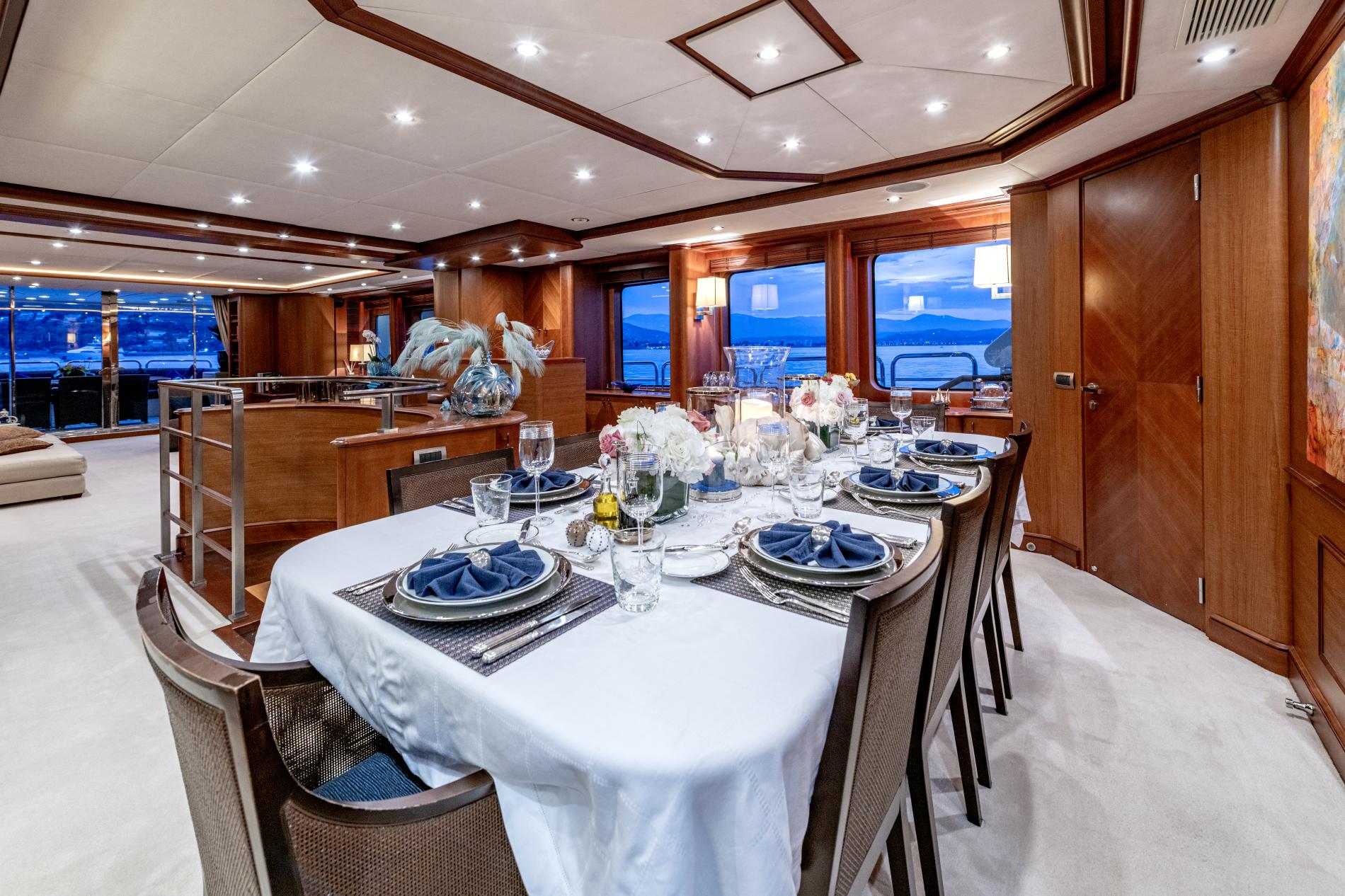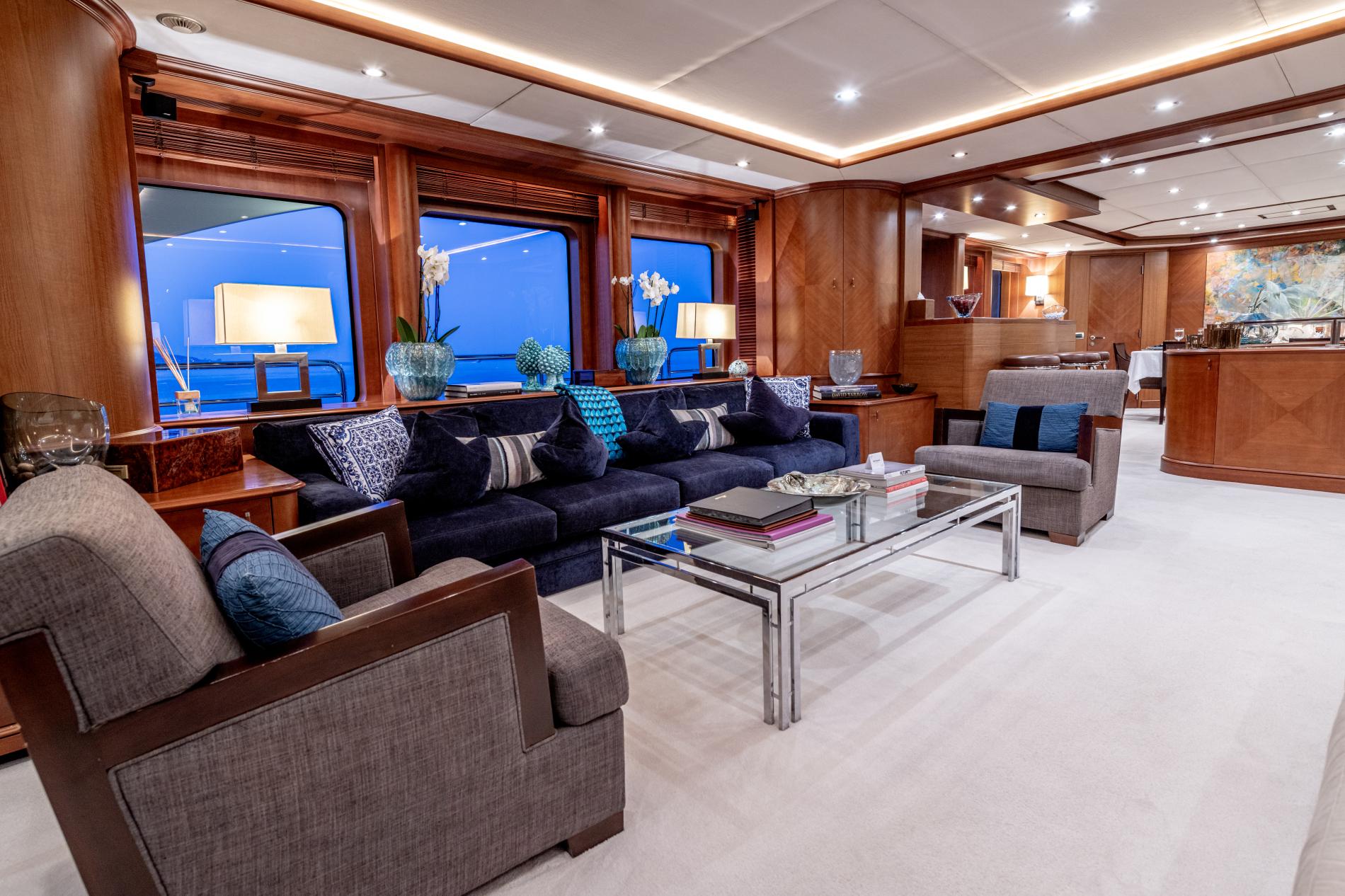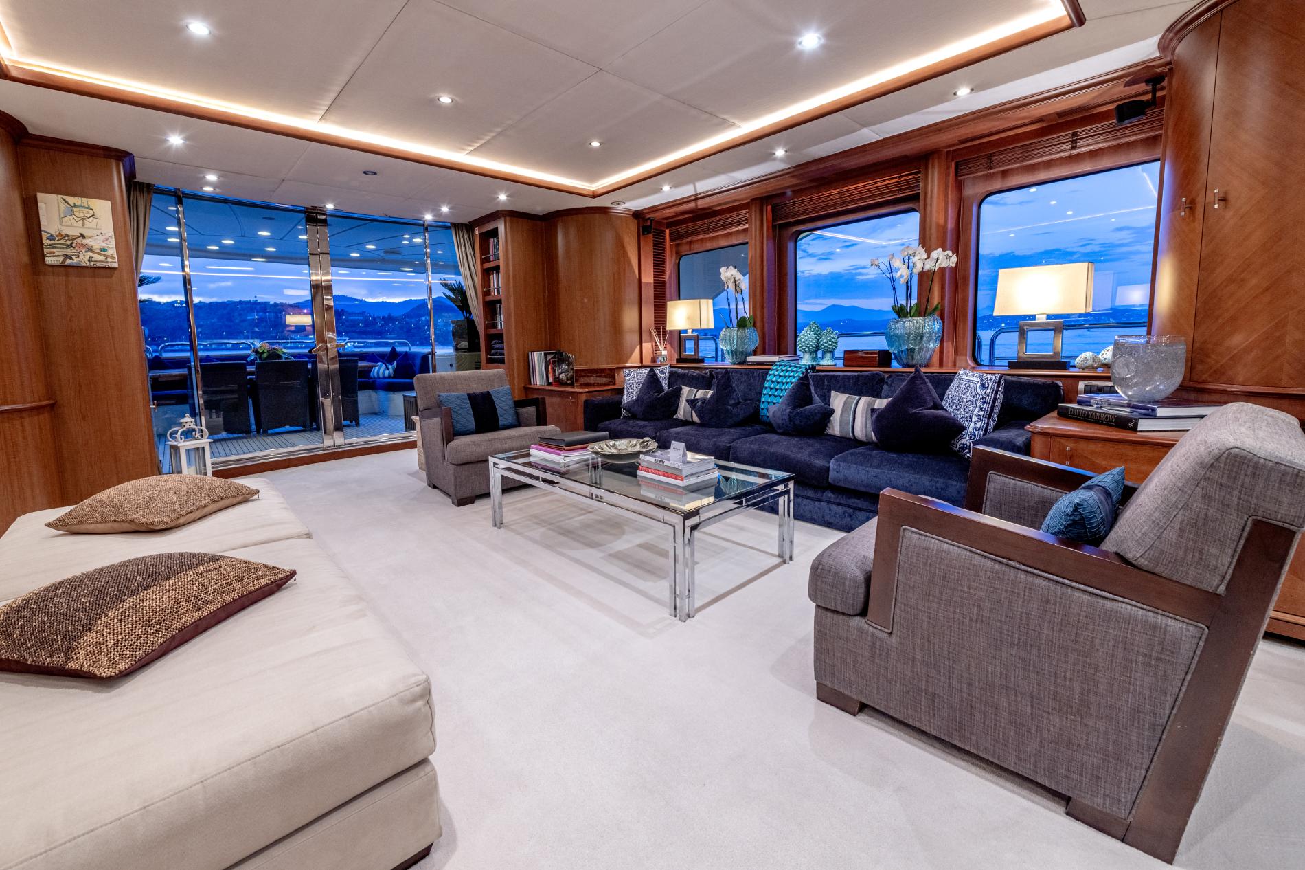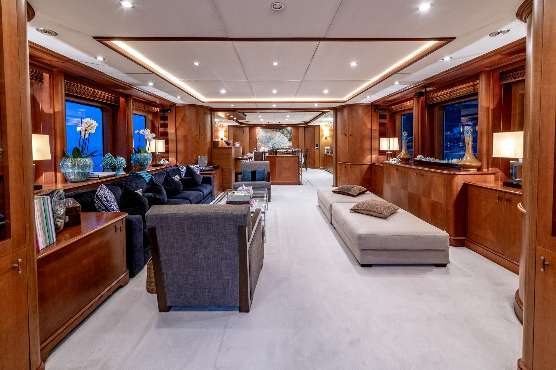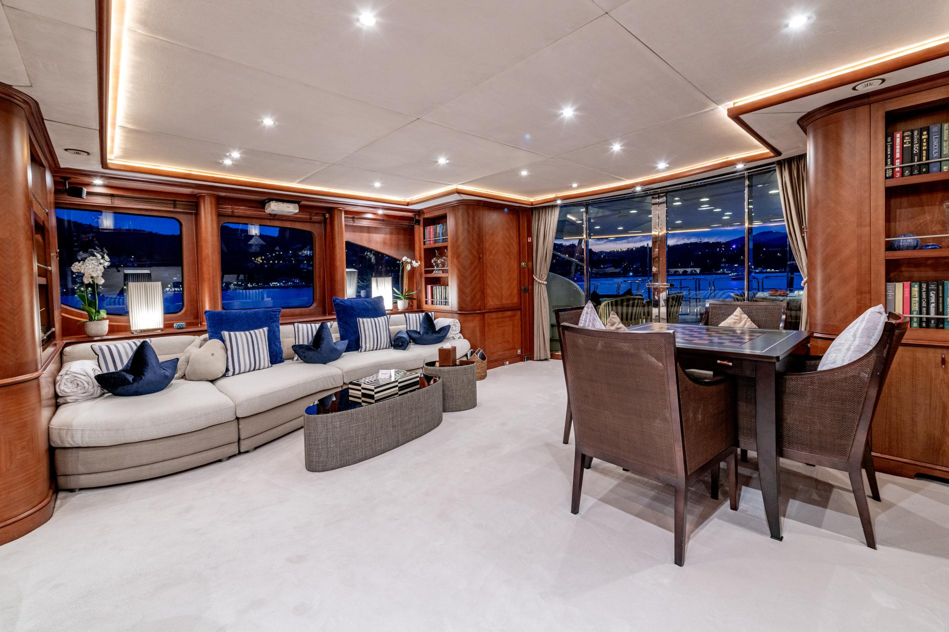 François Zuretti’s warm interior design brings together rich wood paneling and subtle geometric accents, adding texture and character to every space. The main salon blends a lounge, sit-up bar, and dining for ten, all connected by a central staircase. Upstairs, the upper salon offers a more private retreat with a second bar, games table, and library. The interior has been thoughtfully refreshed and updated since delivery.