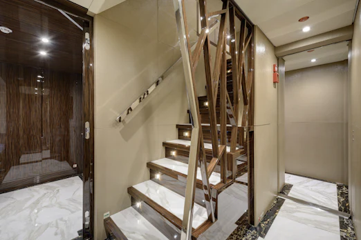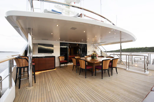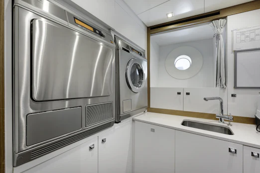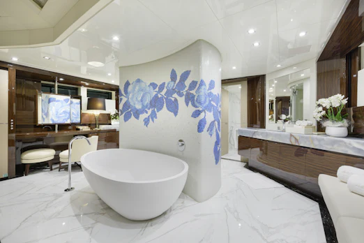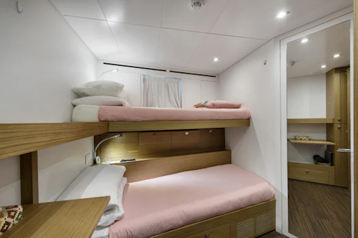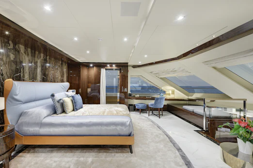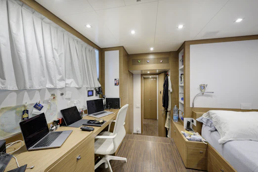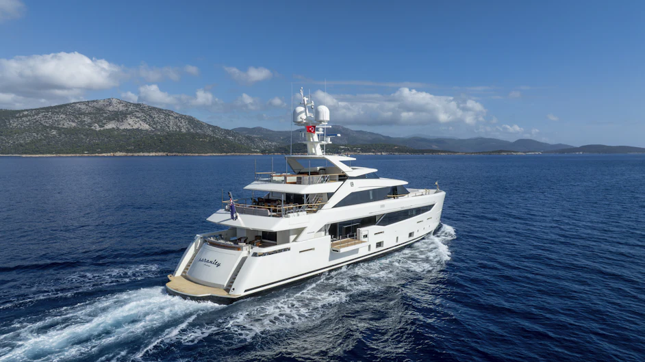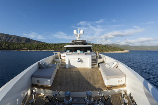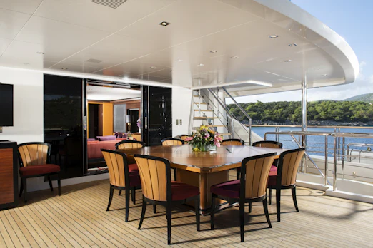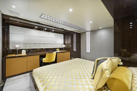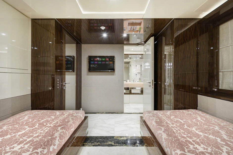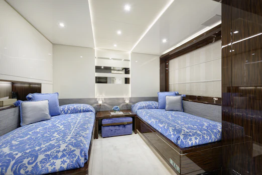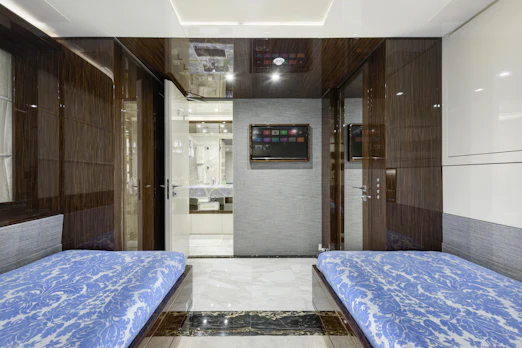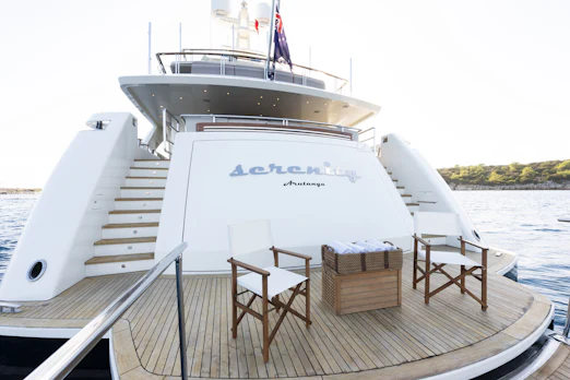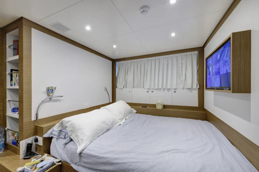 With a top speed of 16 knots and a cruising speed of 15 knots, SERENITY offers an impressive maximum cruising range of 4,500 nautical miles at 12 knots, powered by two robust MTU engines. She comfortably accommodates up to 10 guests across 5 elegant cabins, with a dedicated crew of 7 ensuring every need is met. Her gross tonnage stands at 496 GT, and she features an 8.8 m beam for spaciousness.