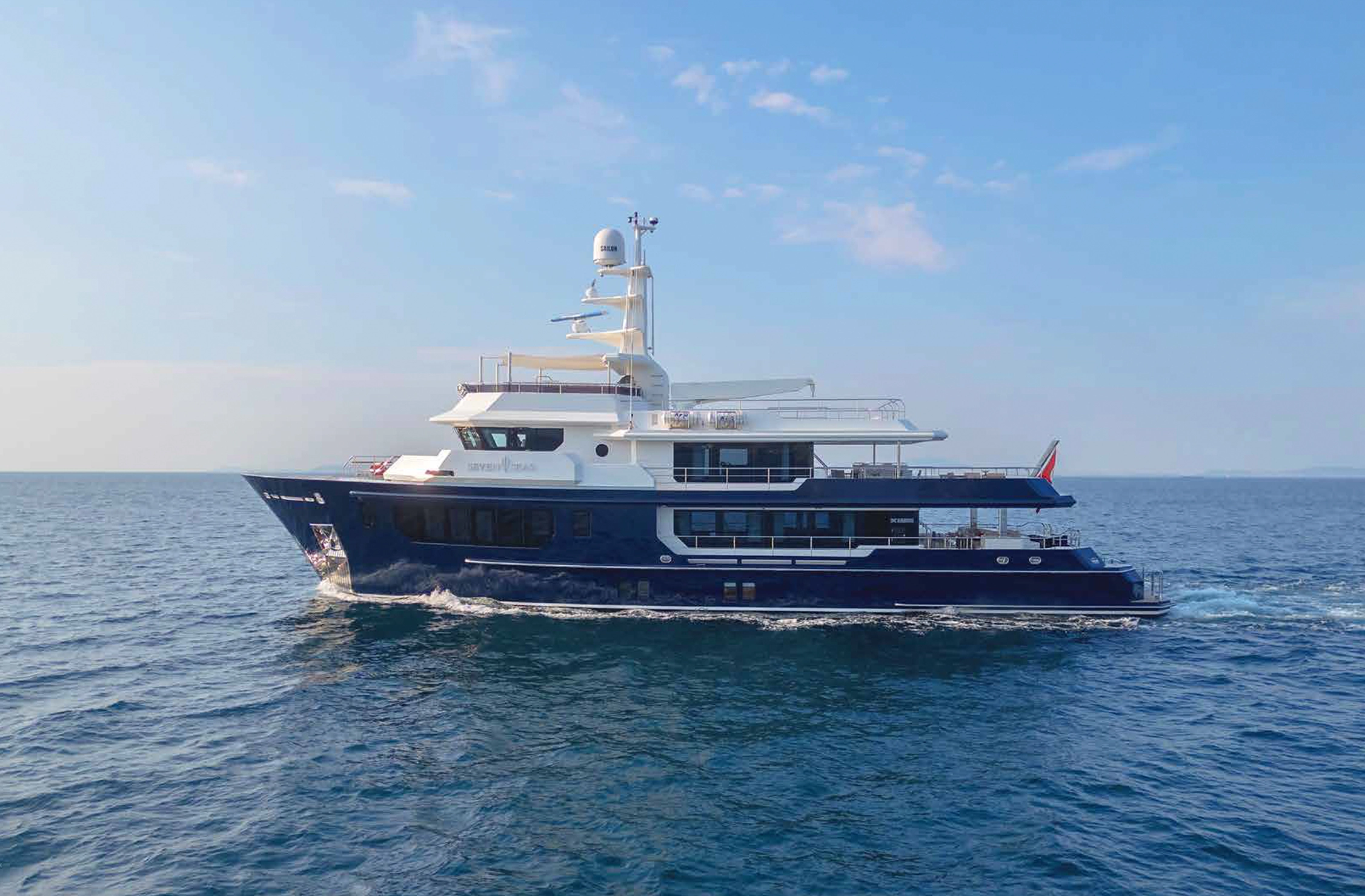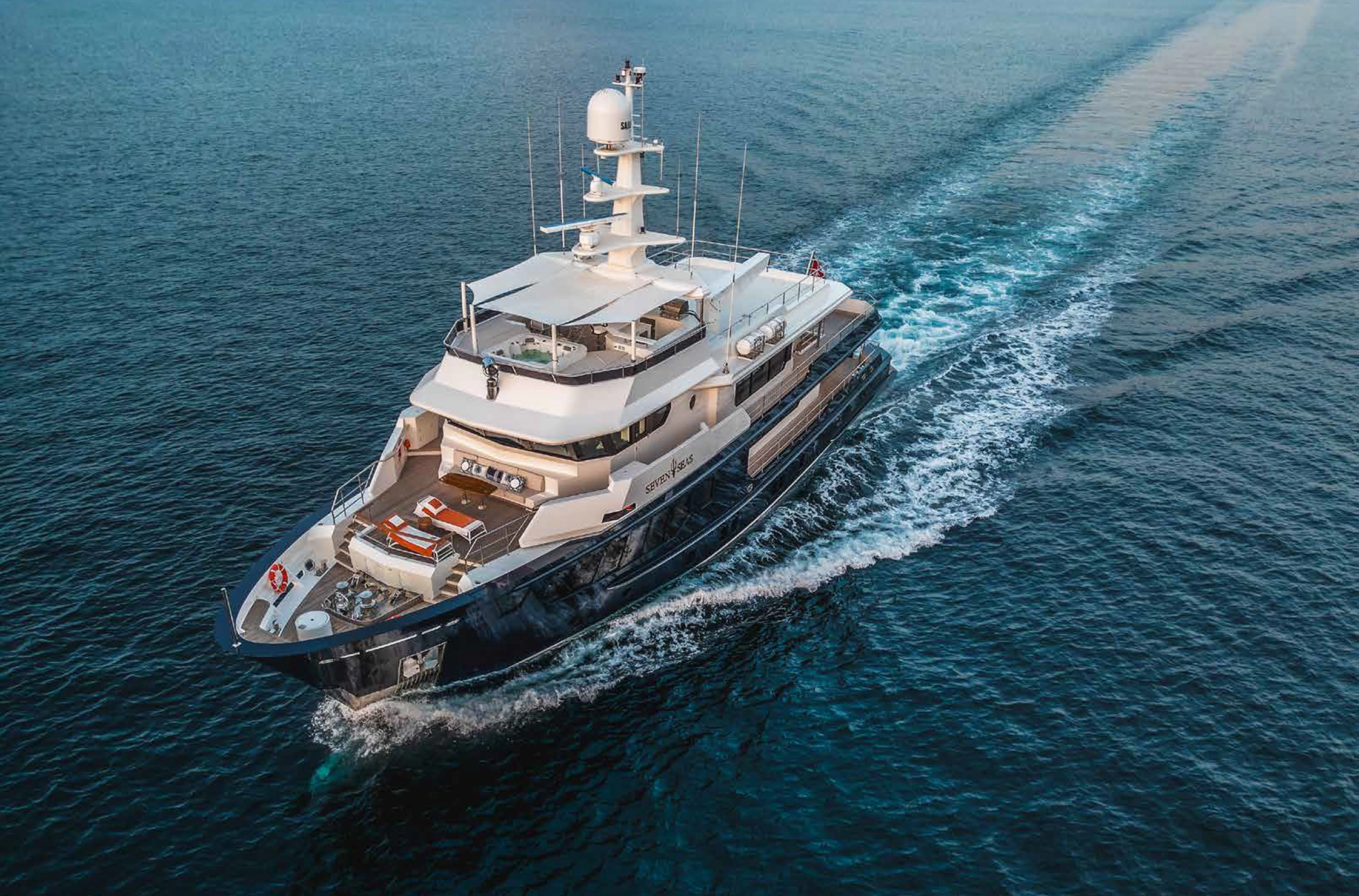 Her interior, designed by Epikworks, offers a timeless aesthetic and accommodates 10 guests in five cabins, including a spacious on‑deck master suite. Exterior highlights include an infinity pool on the main deck aft and a 4,000 kg davit on the upper deck capable of handling a large tender. Powered by dual Caterpillar C32 engines, SEVEN SEAS delivers a cruising range of 3,600 nm. She is built to commercial class standards and engineered for true blue‑water capability.